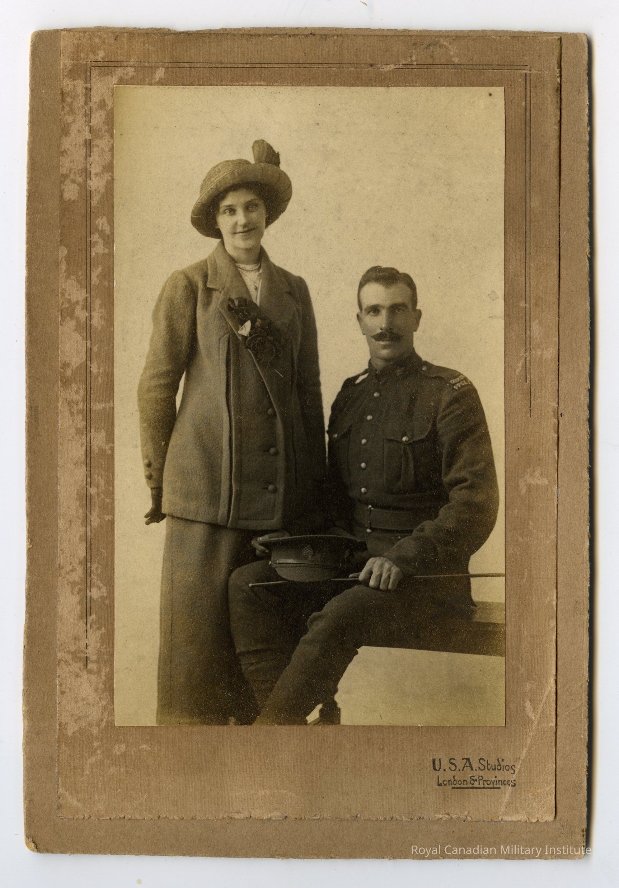 Photograph "Unidentified studio portrait of a PPCLI Private accompanied by a woman in civilian clothes".Entry/Object ID