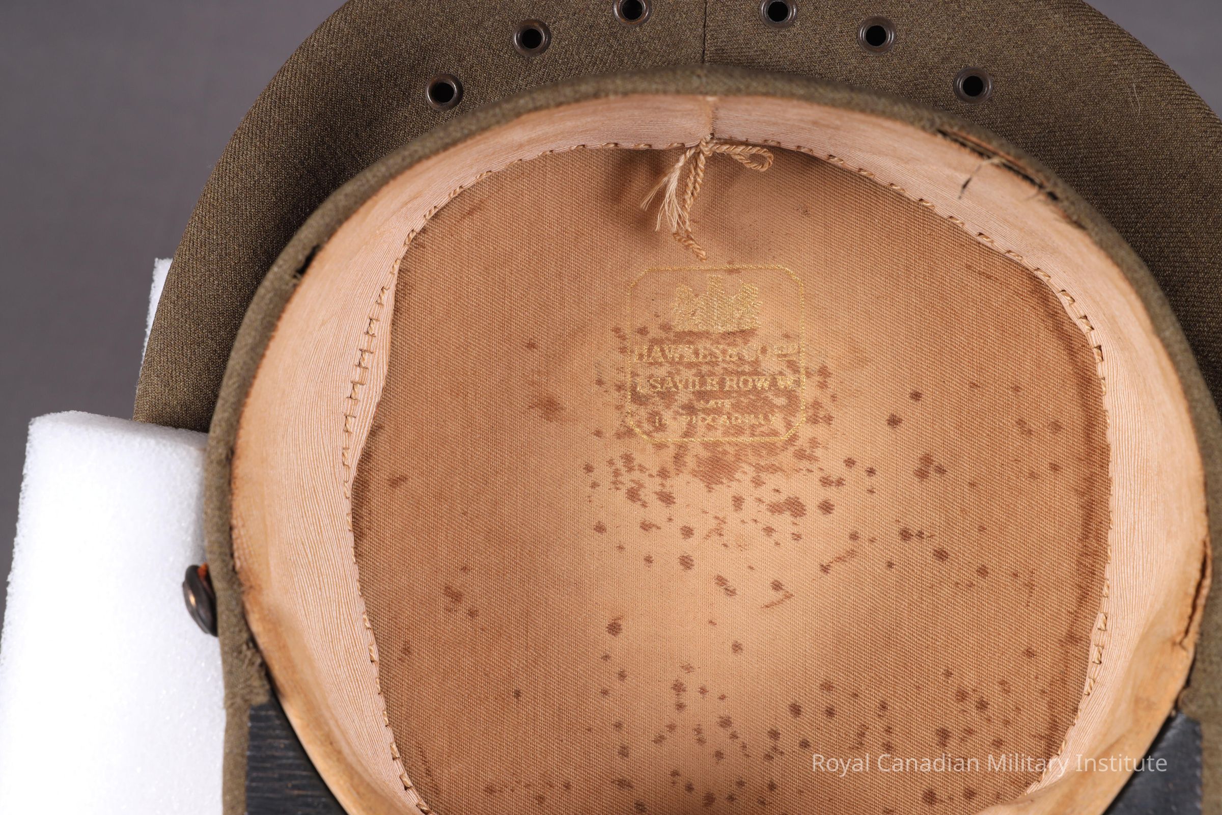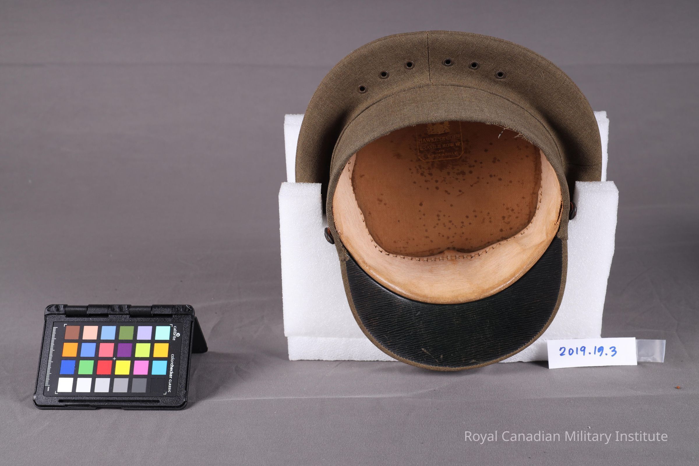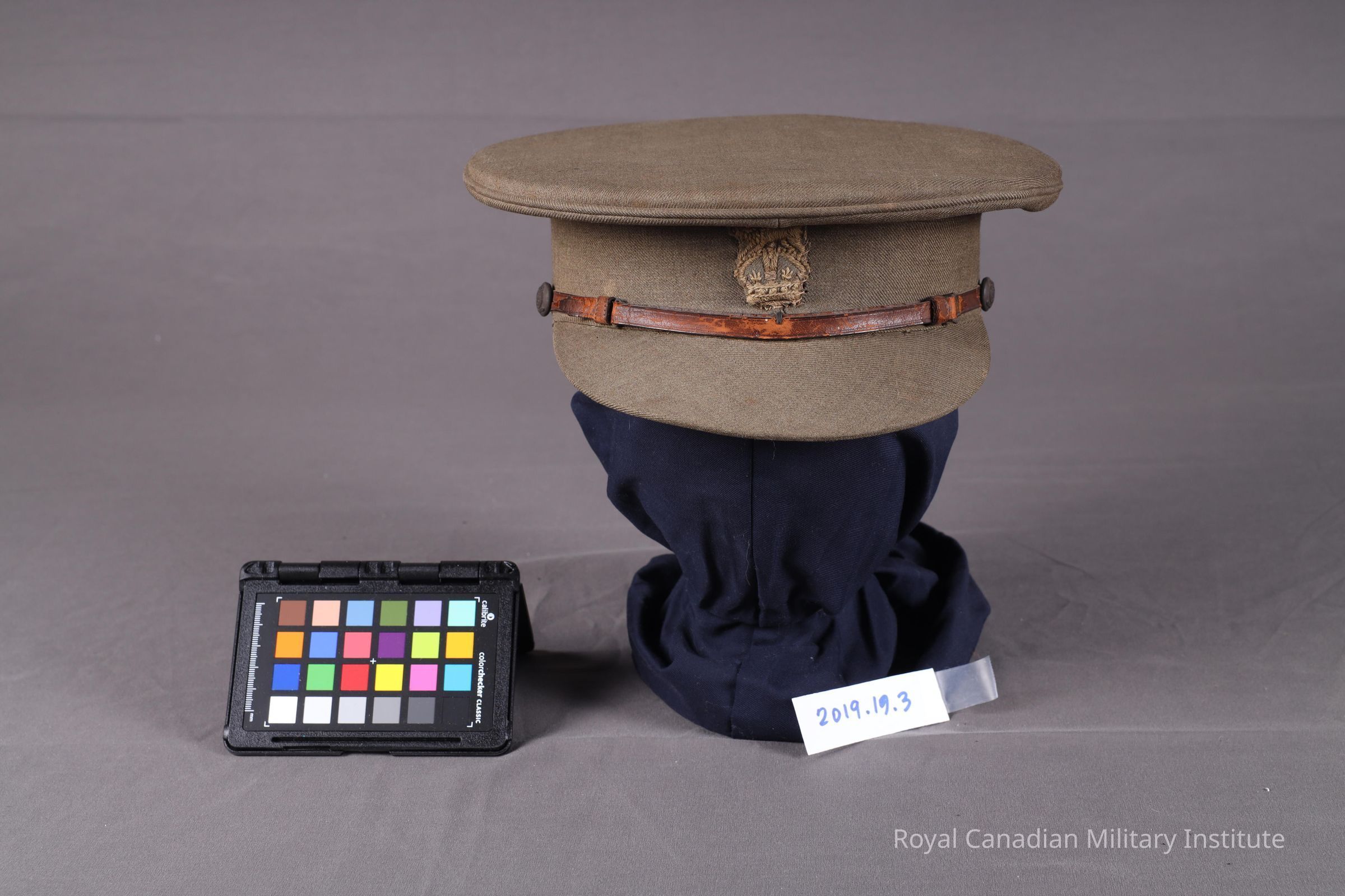 A Great War service khaki cap made from drab wool material. The top is flattened and has a front visor. An adjustable leather chinstrap is connected to two chinstrap buttons on either side of the cap. In the center of the cap is a King's Crown cap badge. The interior has a sweatband and a light-brownish fabric lining.Context