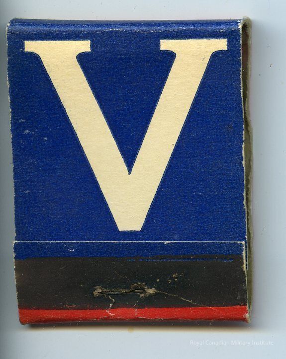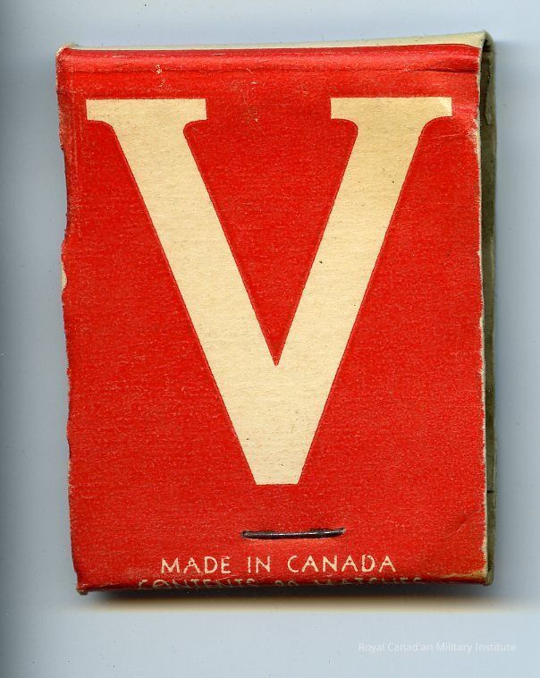 1940's Canadian Army matchbook. Paper cover with folding front flap. Printed white "V" on red back cover/blue front cover. 20 matches 4.5cms long stapled into base.Made/Created