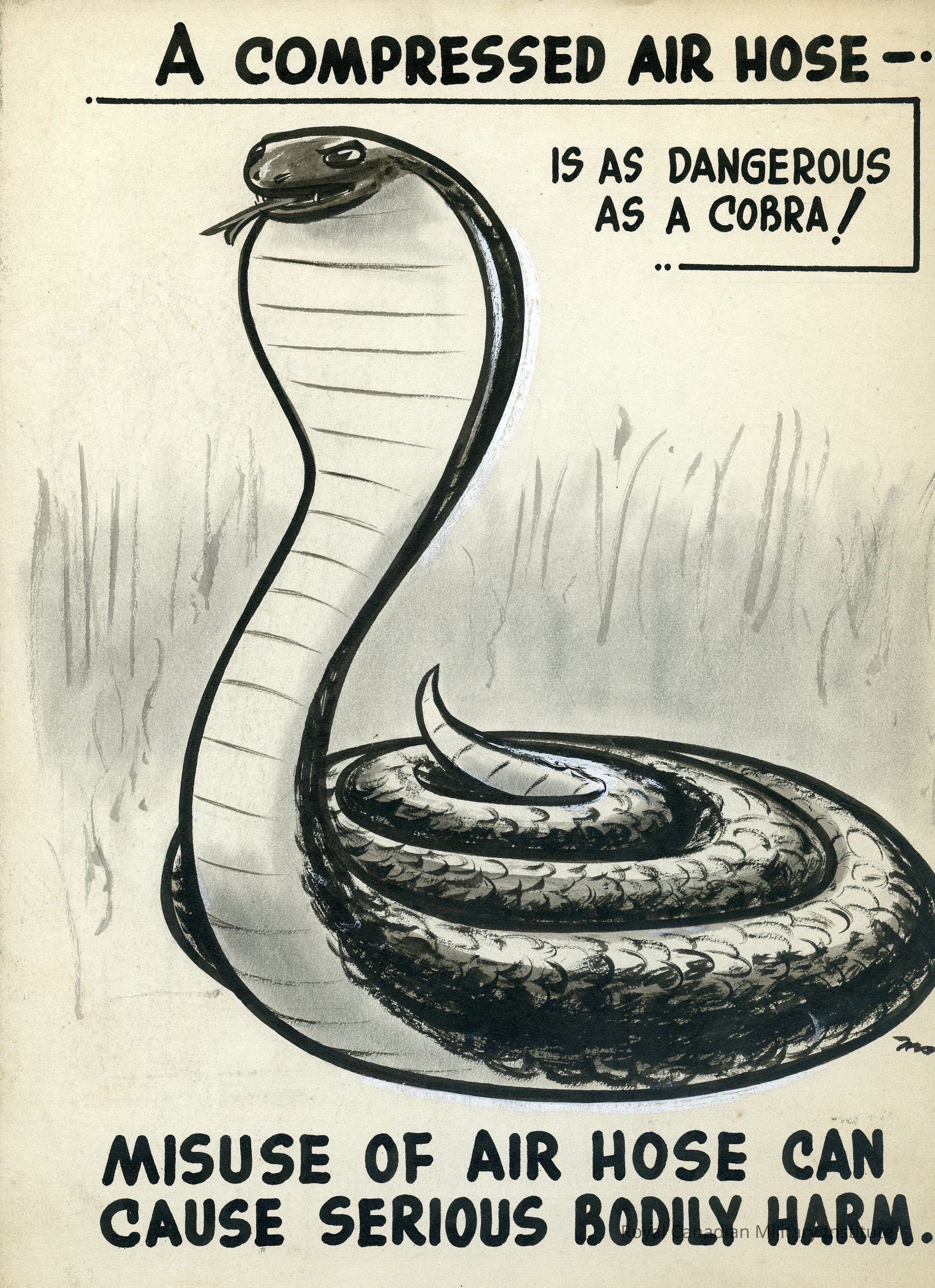 Winslow Mortimer pen/ink cartoon entitled "Compressed Air Hose," dating from the 1950s. The cartoon shows a hissing cobra whose body is coiled like a hose. The text above and below the snake reads "A compressed air hose is as dangerous as a cobra! Misuse of air hose can cause serious bodily harm." The cartoon is glued to a cardboard backing. The cartoon is signed "Mort." along the right side. The cartoon is done in pen/ink, pencil, and white to highlight.Made/Created