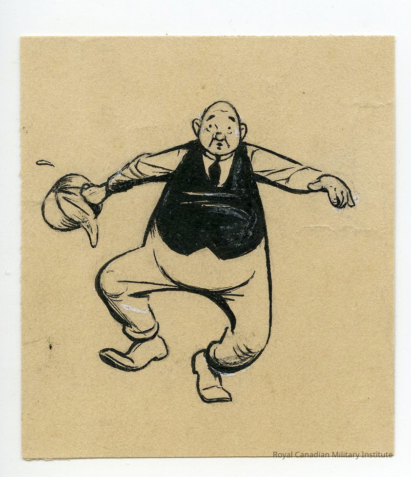 Winslow Mortimer pen/ink cartoon entitled "Watering the Plant." This sketch, most likely meant to precede 2009.17.9, shows a portly man carrying a bucket of water. He is balding, and wearing a vest and tie. He appears to be unsteady on his feet, and some water is sloshing out of the bucket. The cartoon is not signed.Made/Created