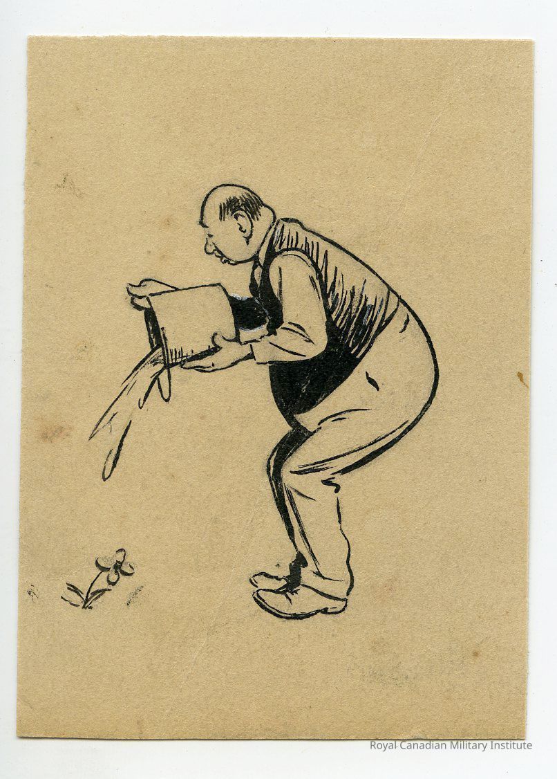 Winslow Mortimer pen/ink cartoon entitled "Watering the Plant." The cartoon shows a portly man bending over to throw a bucket of water on a flower. The man is balding, and appears to be wearing a vest and tie. The sketch is not signed.Made/Created