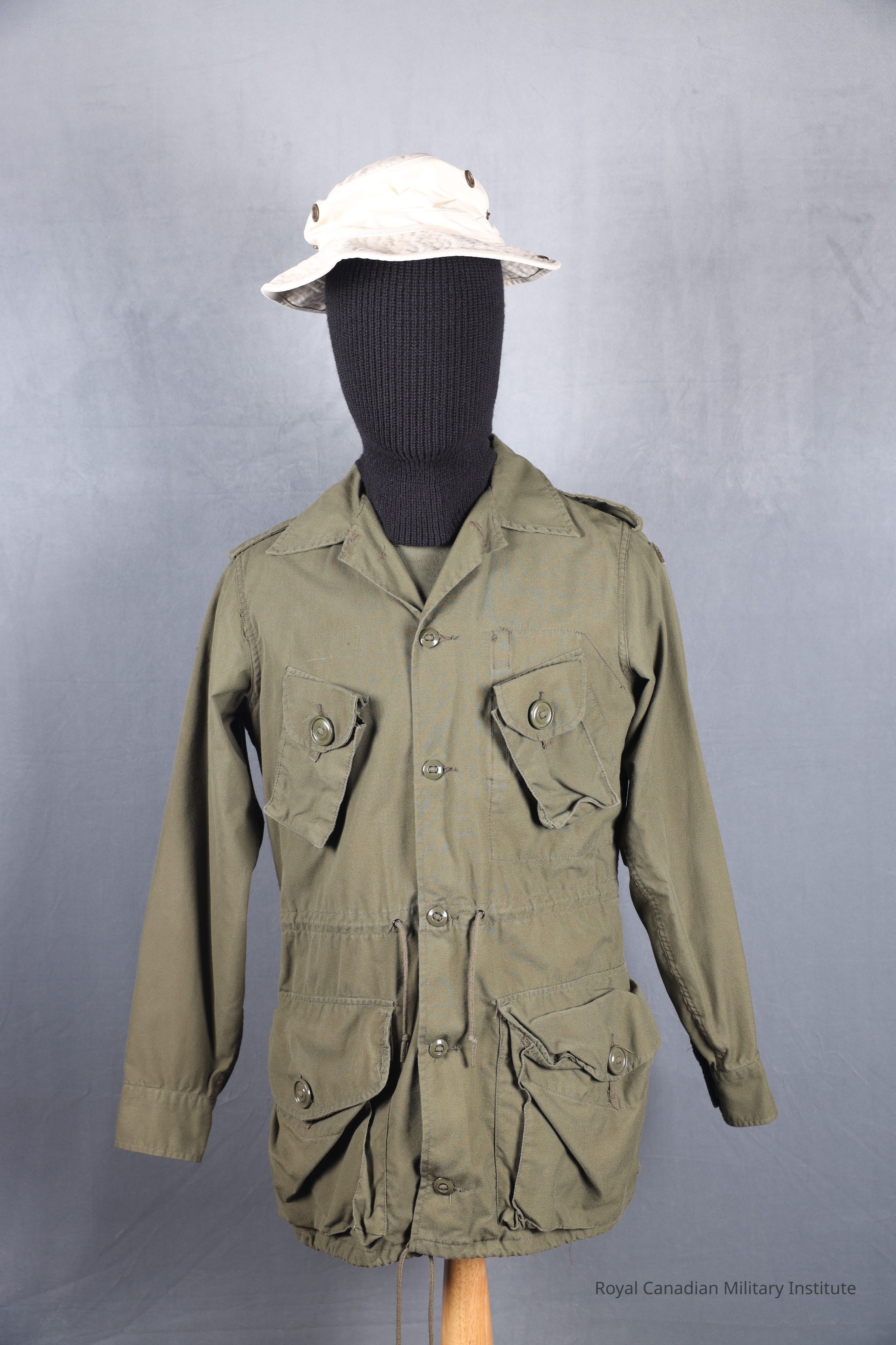 Maker's tag reads: "Uniformes F.O.B. Ltee Coat Combat Lightweight Stock No. 8415-21-866-1546 Size 7 Tall Small November 1985" Written in black pen on inside right skirt: "French 958"