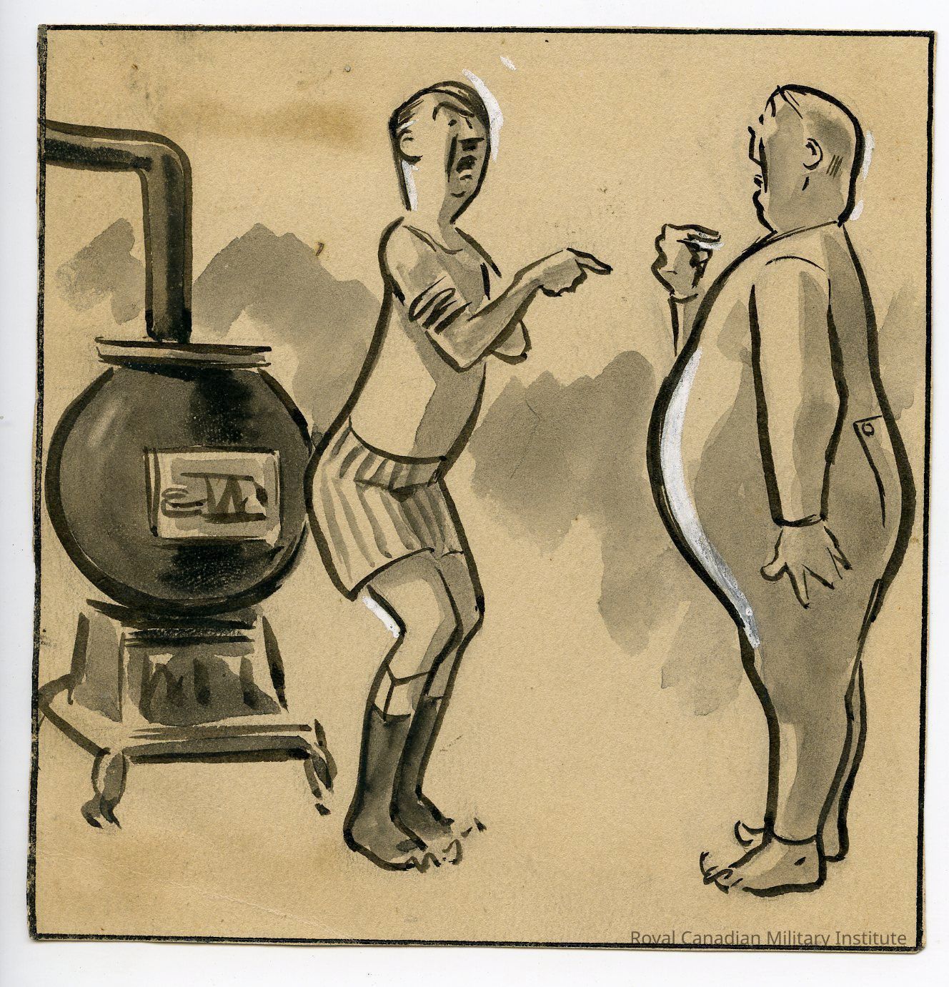 Winslow Mortimer pen/ink cartoon entitled "Two Men And Stove." The cartoon shows two men standing in front of a pot bellied stove. The man to the left is wearing only his boxer shorts, an undershirt, and his socks. He appears to be pointing in accusation to the man standing in front of him. The man to the left is portly. He is pointing to himself and appears indignant. He is wearing full body long johns. The cartoon is done in pen and ink with white highlight. The cartoon is not signed.Made/Created