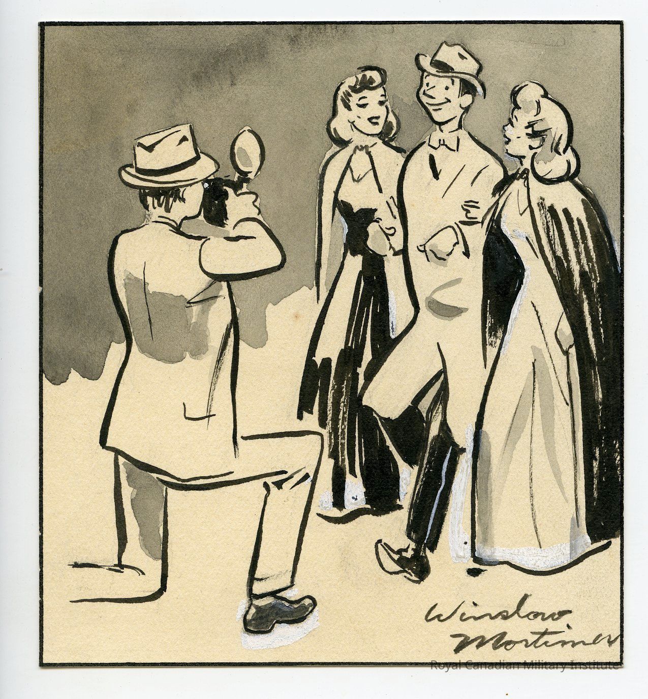 1950's Winslow Mortimer pen/ink cartoon entitled "Photographer Snaps Lucky Guy." This cartoon shows a man with a well-dressed woman on each arm. A phographer is kneeling in front of them to take their photo. Both woman are wearing floor length dresses and looking at the man. The man is wearing a bow tie, a hat, and has a big smile. The cartoon appears to have been done in pen and ink, with white used as a highlight. The cartoon is signed by Mortimer in the bottom right corner.Made/Created