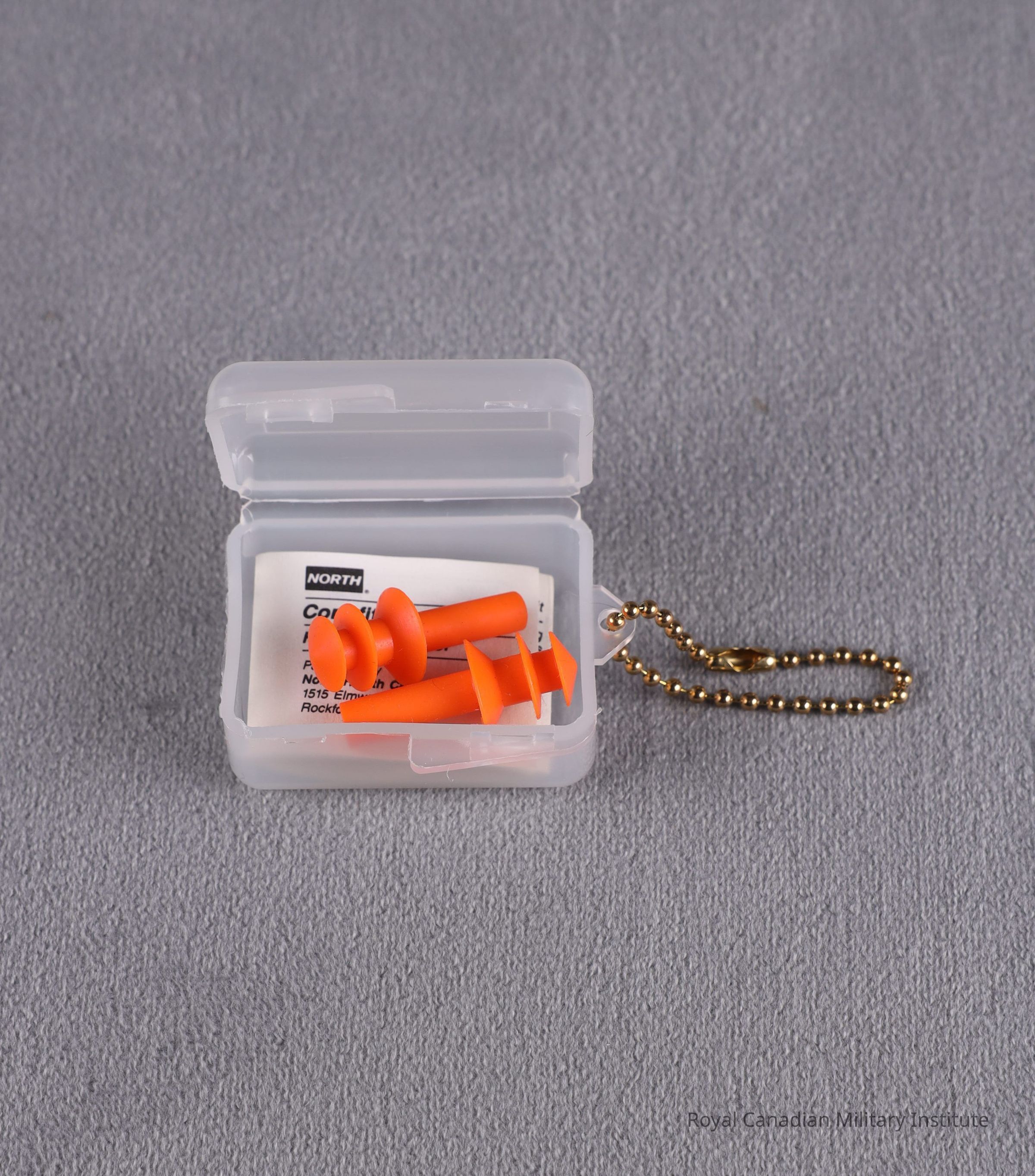 1980's Canadian Forces hearing protector. Cylindrical orange foam rubber earplug. molded with three oval ridges to fit into ear canal. Made in Rockford, Illinois, by firm Comfit, 1980's. Original Canadian Forces earplug hearing protector. Part of personal gear. Metal ball chain looped through the case.Made/Created