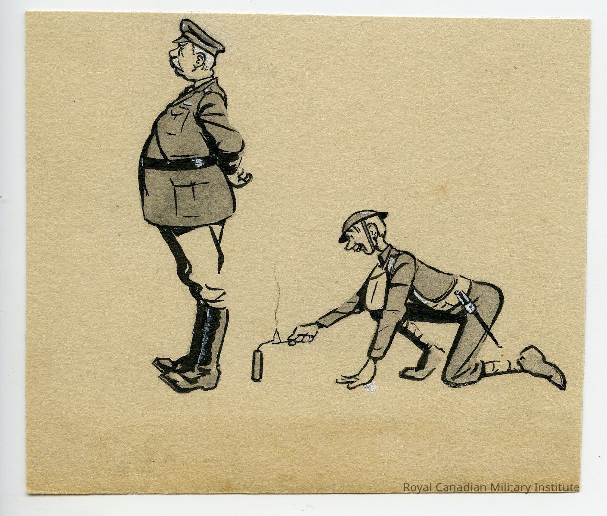 Winslow Mortimer pen/ink cartoon entitled "A Firecracker for the Colonel." This cartoon shows an officer, perhaps a Colonel, standing with his arms behind his back. Behind him a soldier has placed a firecracker on the ground and is in the midst of lighting it. The officer is quite a large man, and he is wearing a cap and high boots. The cartoon is not signed.Made/Created