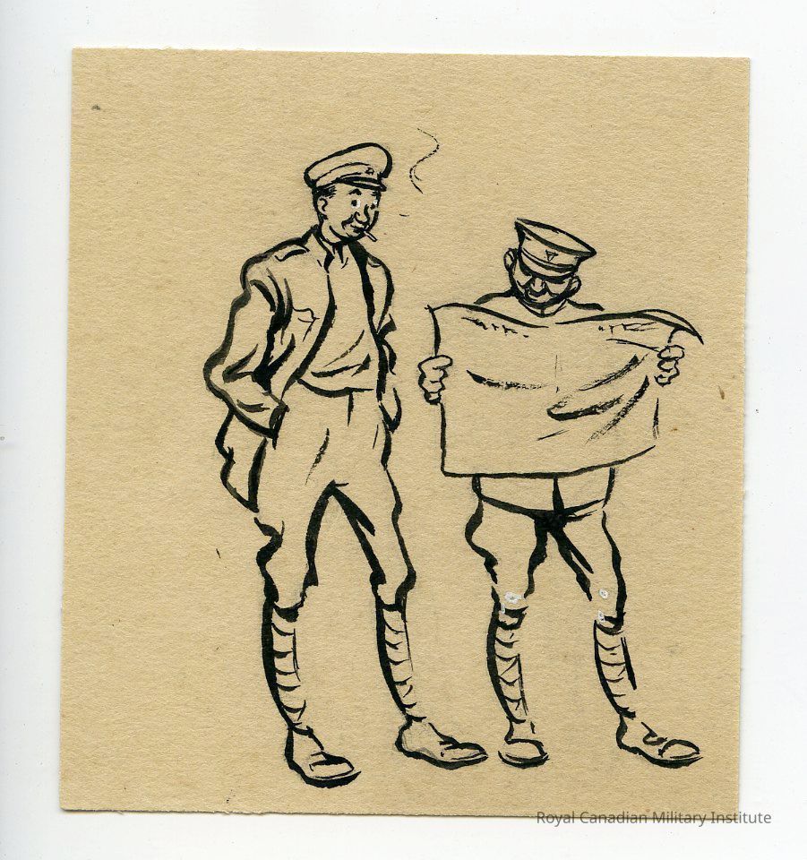 Winslow Mortimer pen/ink cartoon entitled "Two Privates Reading Newspaper." This cartoon shows two men in a casual moment. The shorter man to the right is holding a newspaper. The taller man on the left has a cigarette in his mouth and appears to be reading the newspaper over the other man's shoulder. The man on the left has his jacket unbuttoned and his hands are in his pockets. Both men are wearing caps. The cartoon is not signed.Made/Created