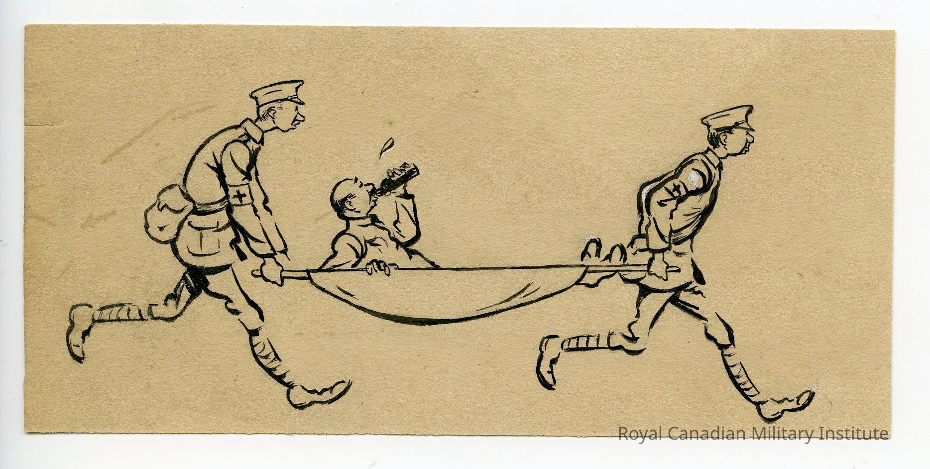 Winslow Mortimer pen/ink cartoon entitled "Privates as Stretcher-Bearers." The cartoon shows two stretcher-bearers carrying a balding man in a stretcher. The stretcher-bearers are wearing arm bands with crosses marking them as members of the medical team. They appear to be running and are shown taking large strides. The man in the stretcher is sitting up halfway and is drinking from a bottle. The cartoon is not signed.Made/Created