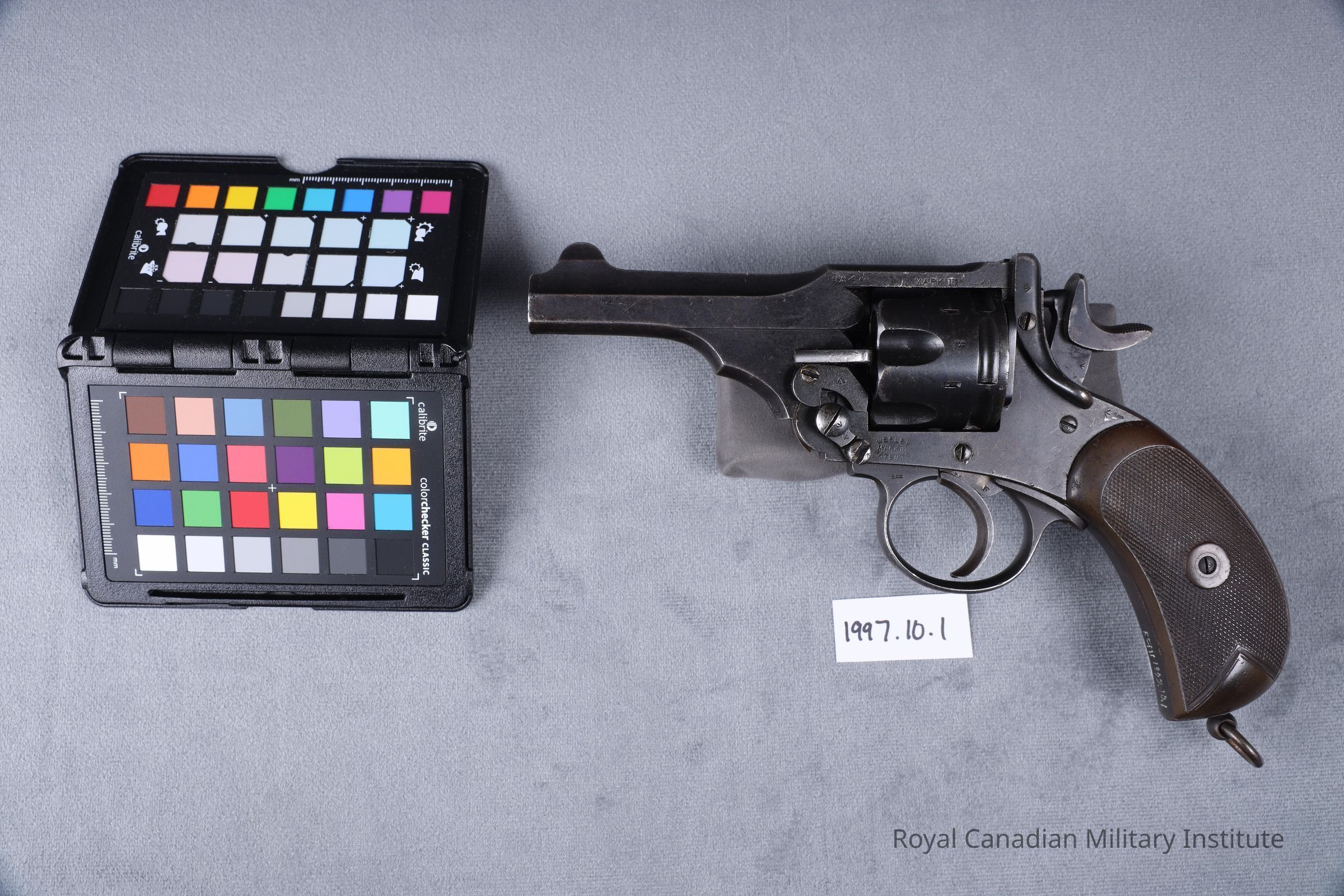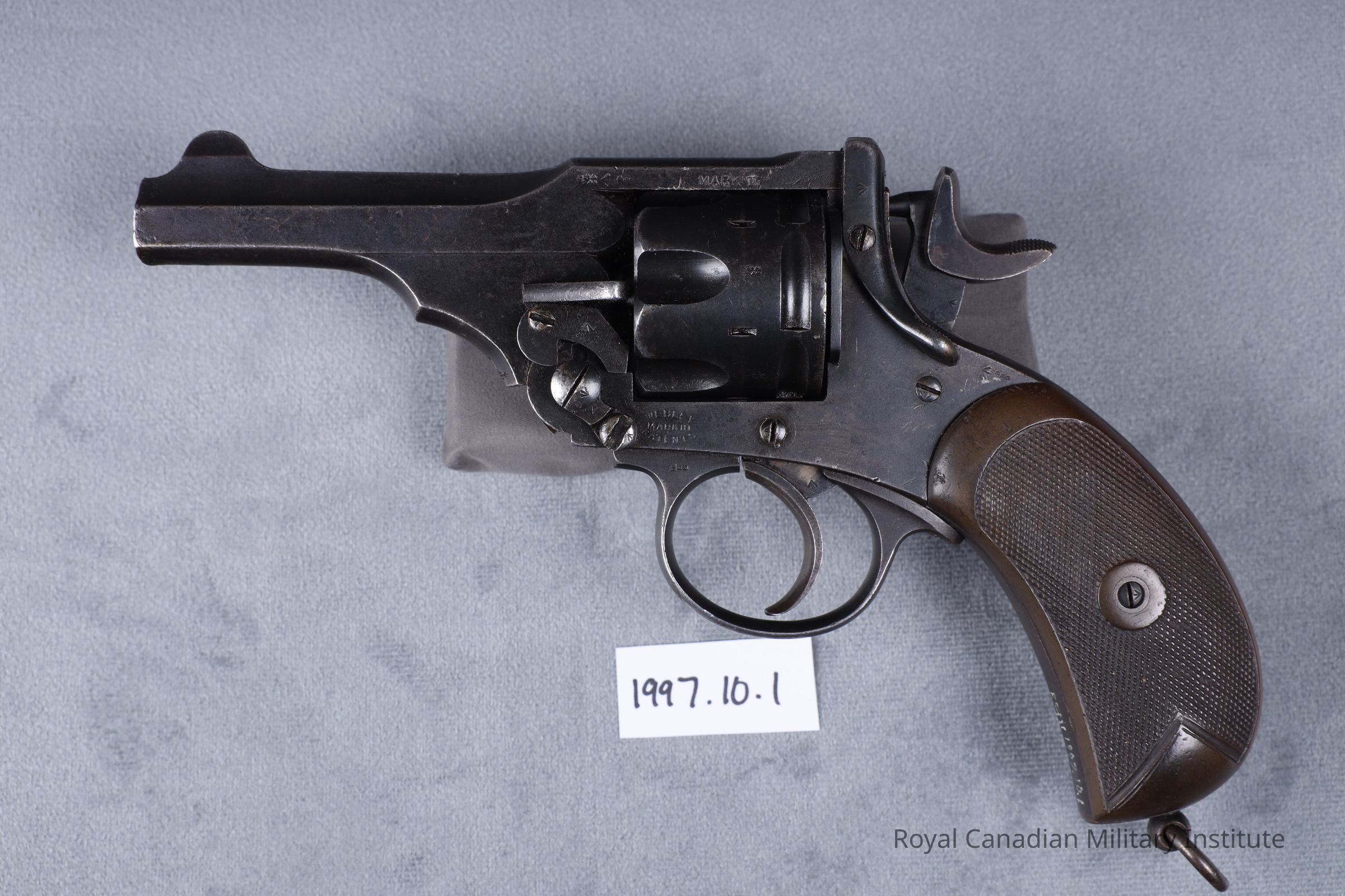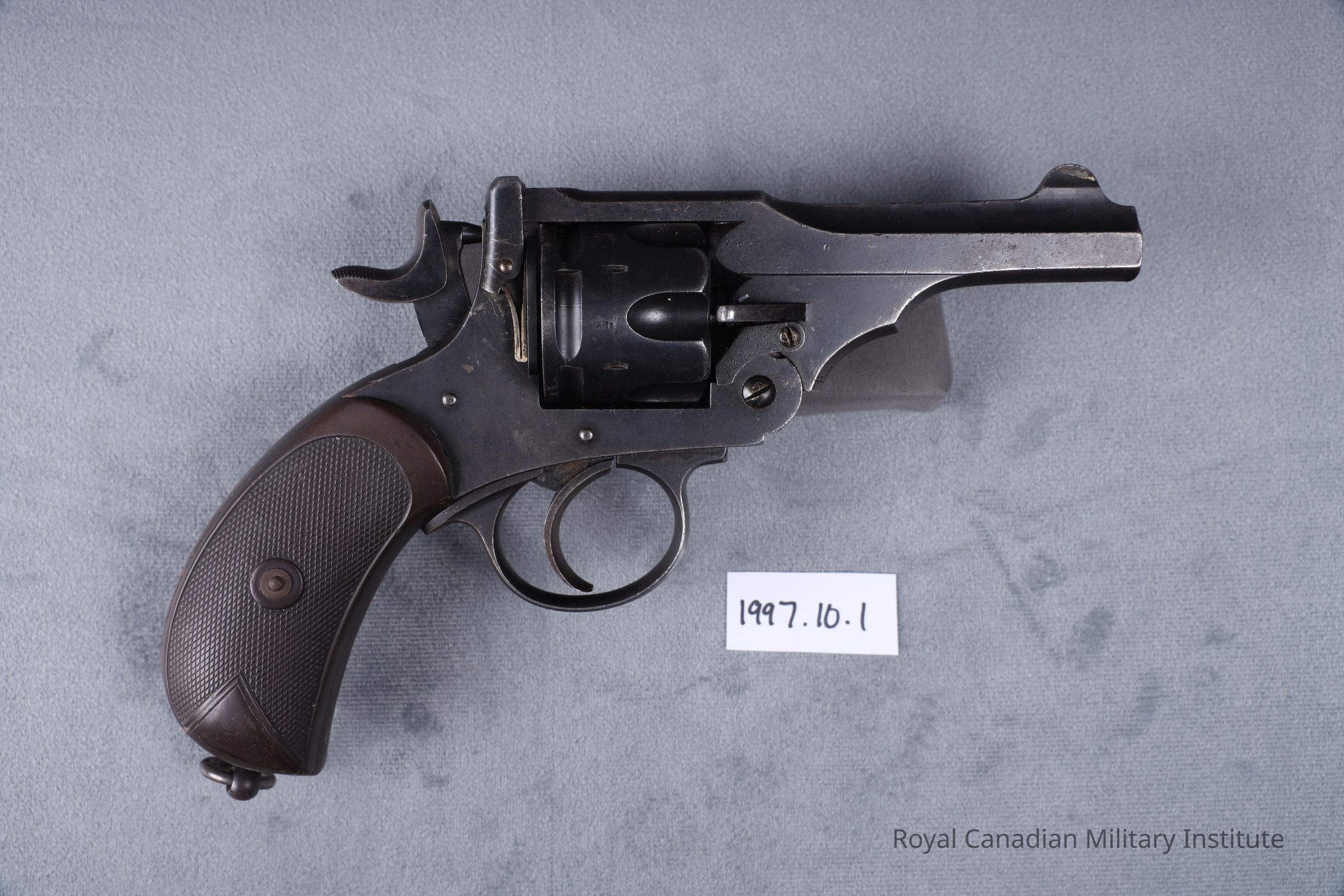 1897-1899 British Army Webley Mark III revolver, s/no. 75-204. Blued steel, curved "bird's head" butt with two knurled brown vulcanite grips. Blued steel top-break frame with six round capacity cylinder. Fittings of top stirrup catch, butt lanyard ring, cylinder automatic extractor.