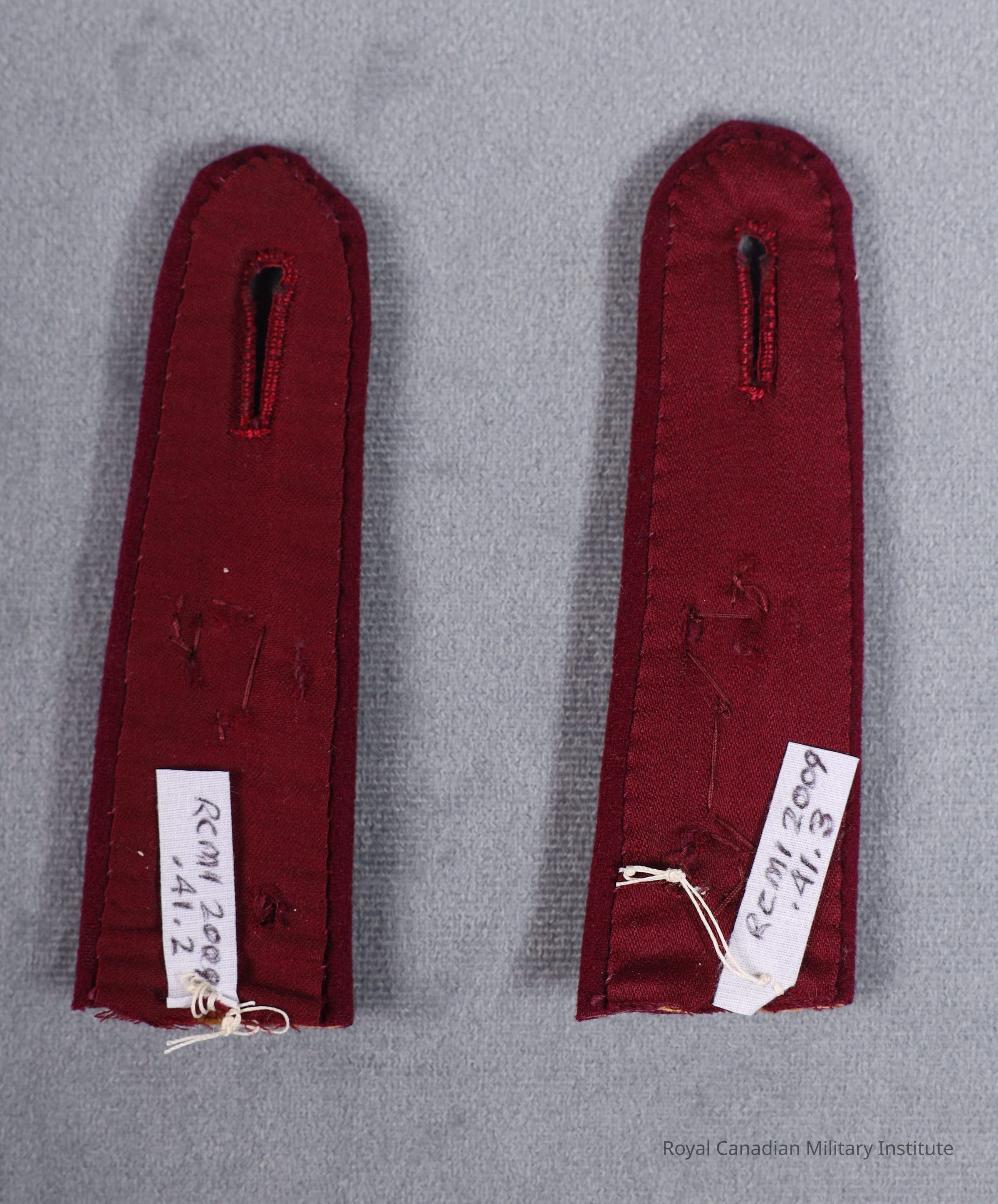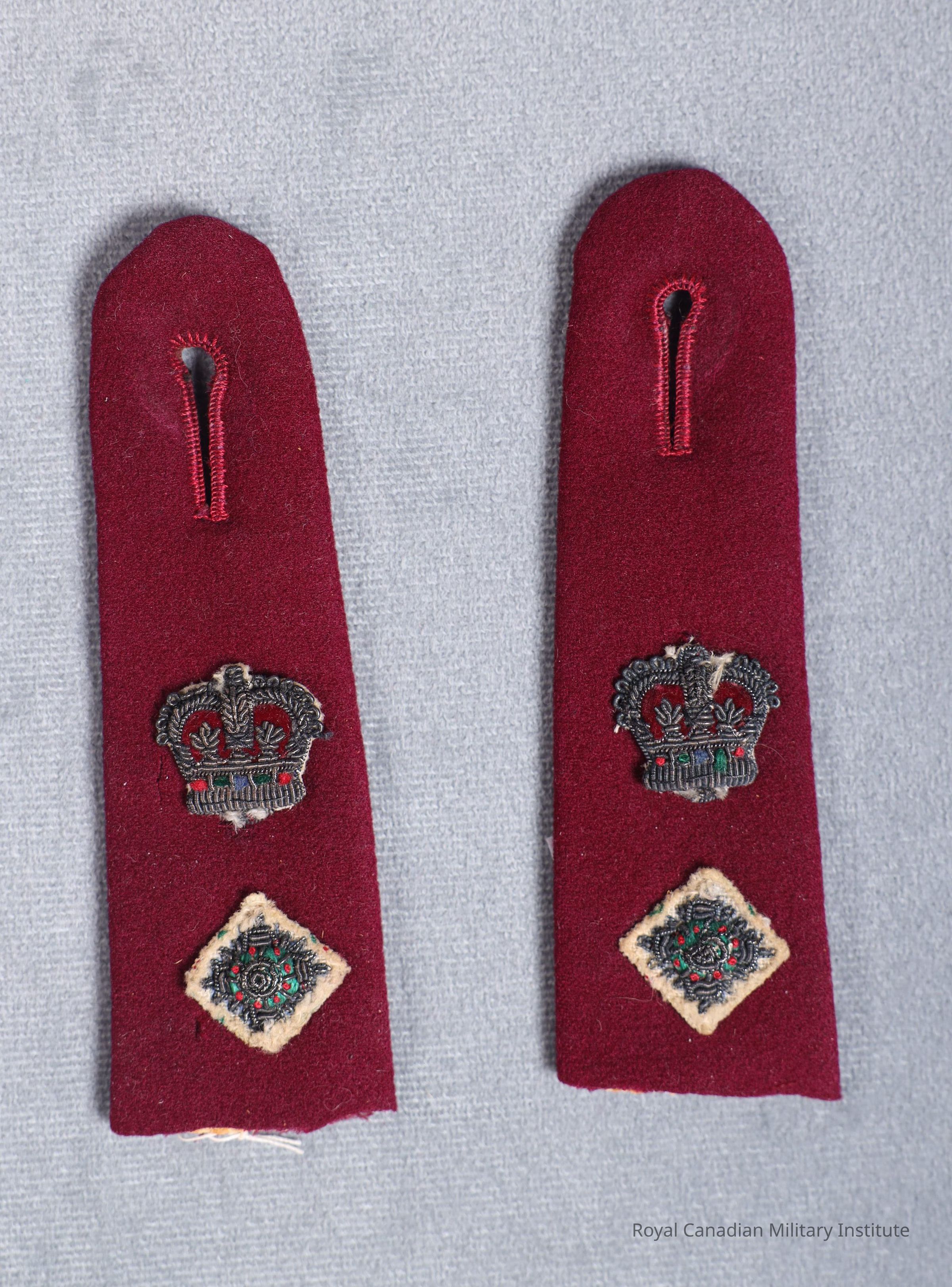 1960s Royal Canadian Army Medical Corps mess dress jacket shoulder strap. Curved rectangular burgundy wool, one flat end. Curved end has buttonhole slit. Tan fiber reinforcement inner. Rank insignia of white wool bordered silver bullion wire/burgundy velvet/red-blue-green cotton or polyester thread Queen's crown and "pip".Made/Created