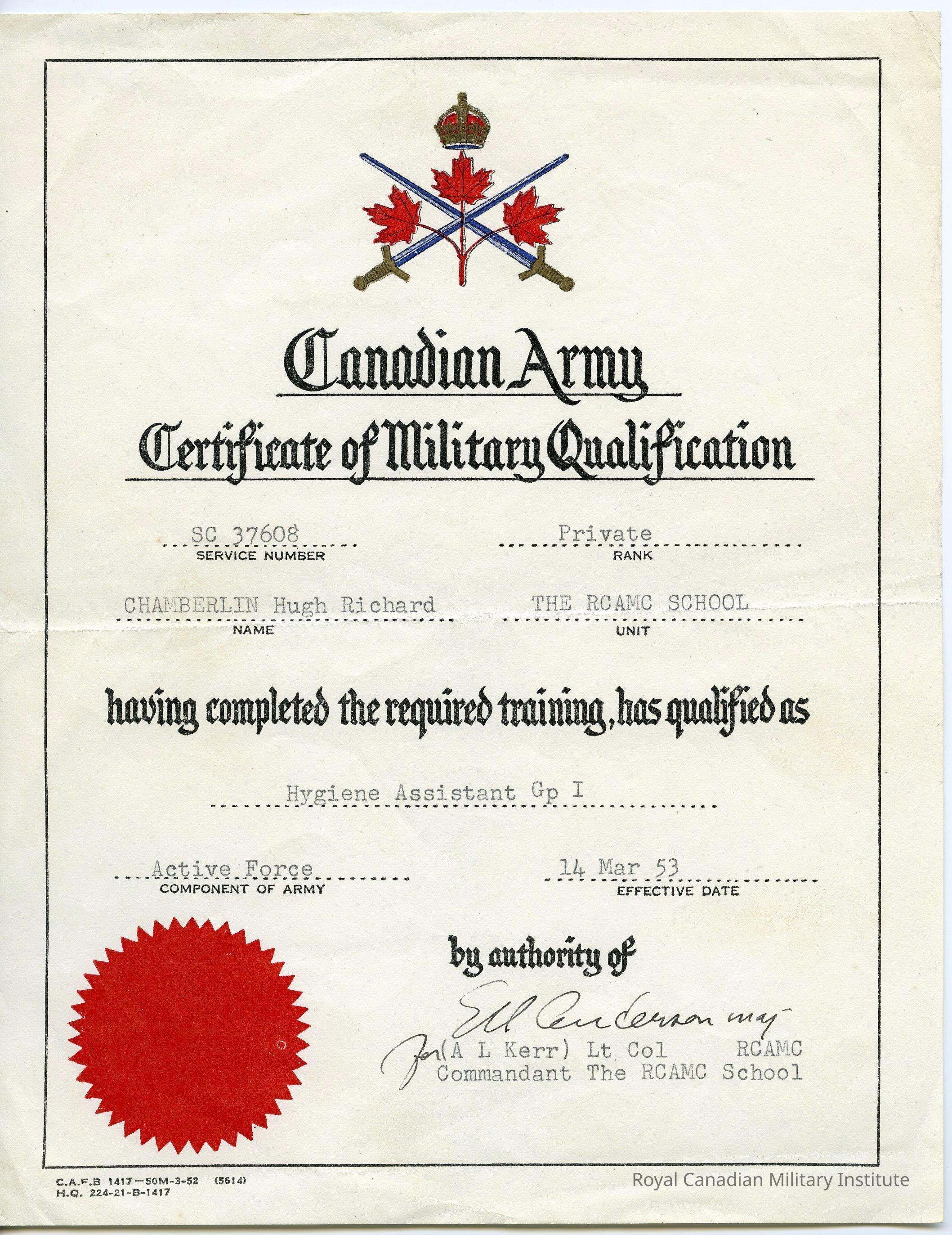1953 Canadian Army Military Instruction Certificate "SC 37608 Private Hugh Richard Chamberlin." Rectangular, off-white paper. black line border with Canadian Army coat of arms at top, title. States that Chamberlin has qualified as Hygiene Assistant Group I. Dated 14 March 1953. The certificate is signed by a Maj. Anderson for L/Col. A.L. Kerr, Commandant The RCAMC School.Dimensions