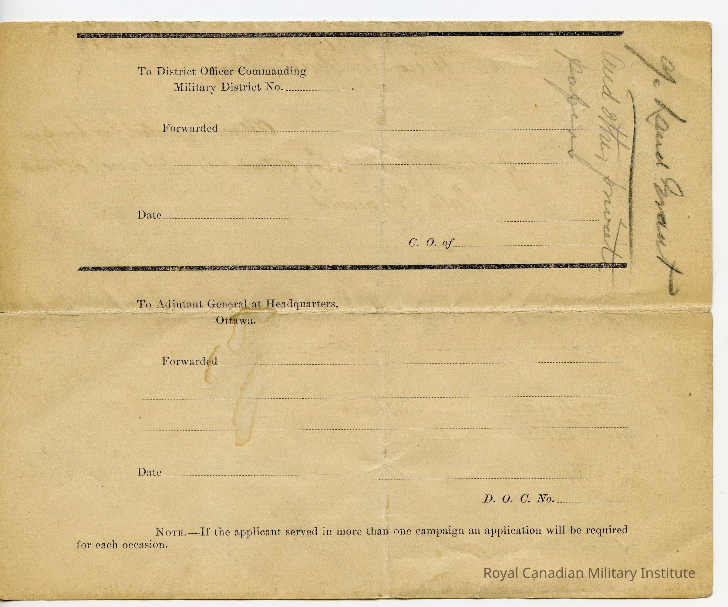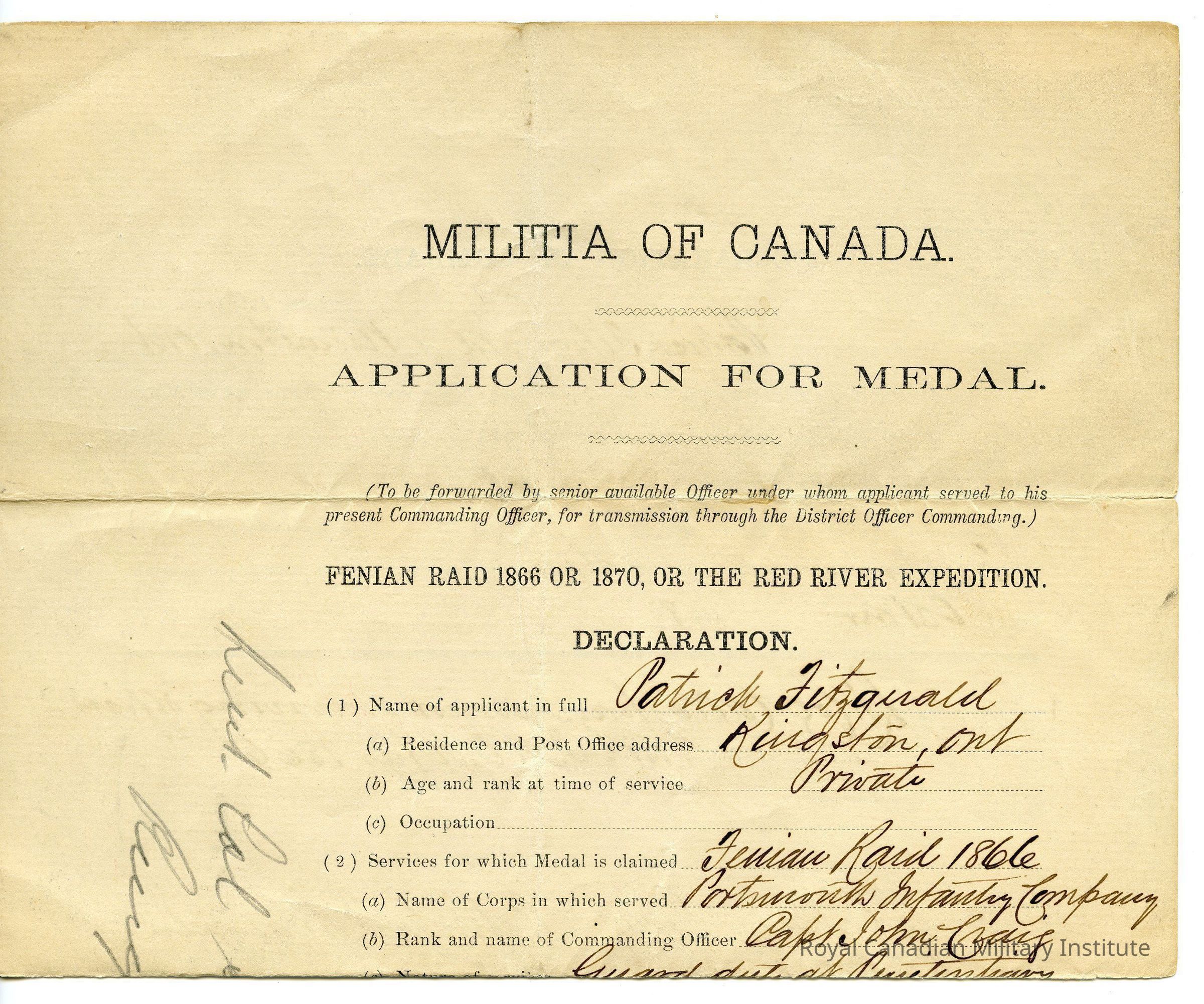 1898 Canada Militia Medal Application Certificate "Private Patrick Fitzgerald, Portsmouth Infantry Company, Frontenac, Ontario."Entry/Object ID