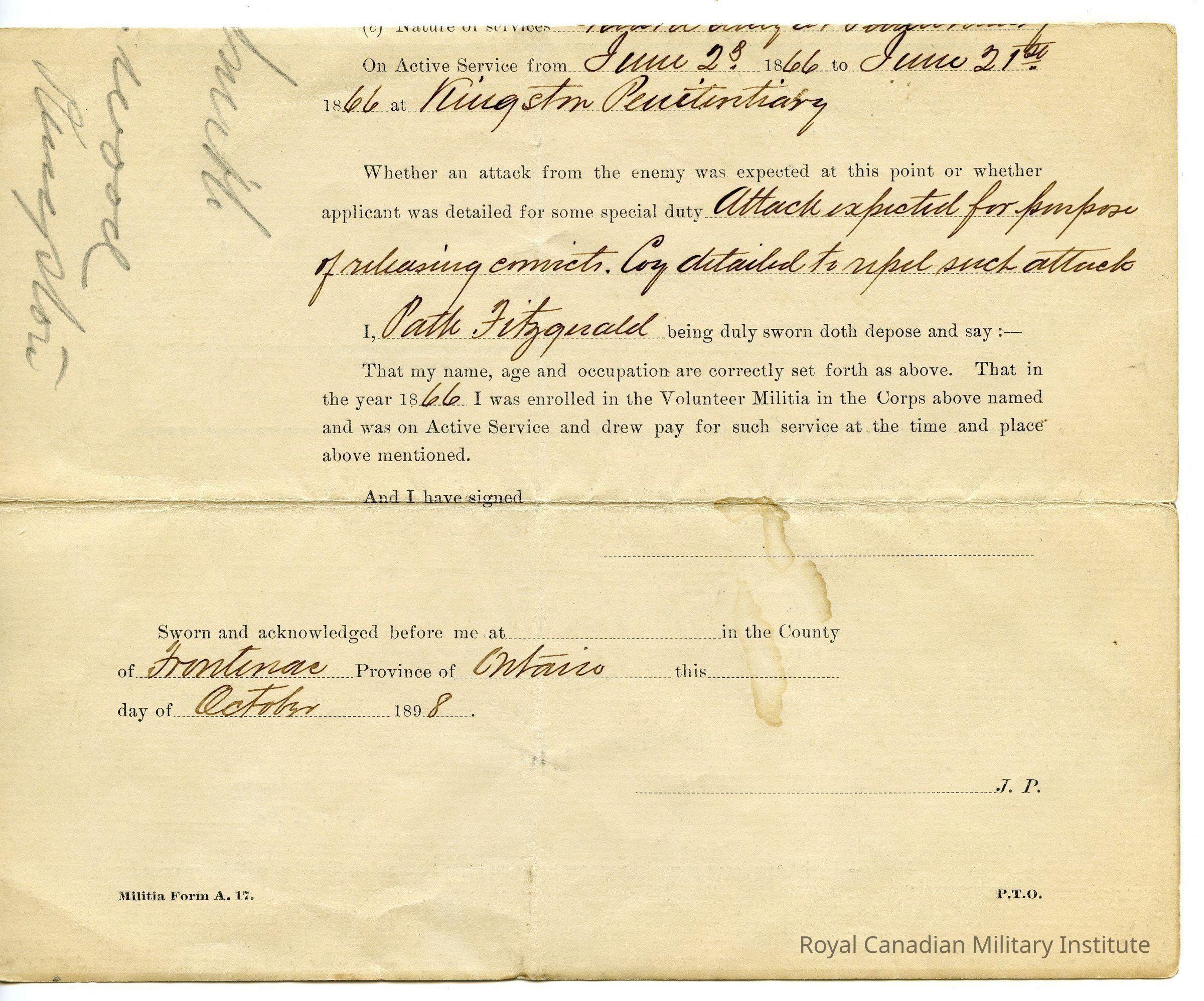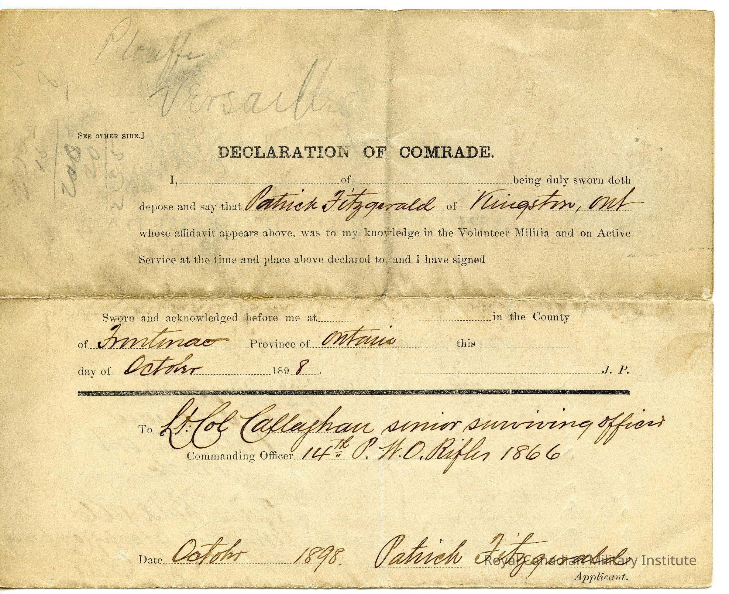 Declaration of Comrade. Certificate attests that Patrick Fitzgerald of Kingston ON served in the volunteer militia on active service. Attestation was signed in the county of Frontenac Ontario in October 1898.