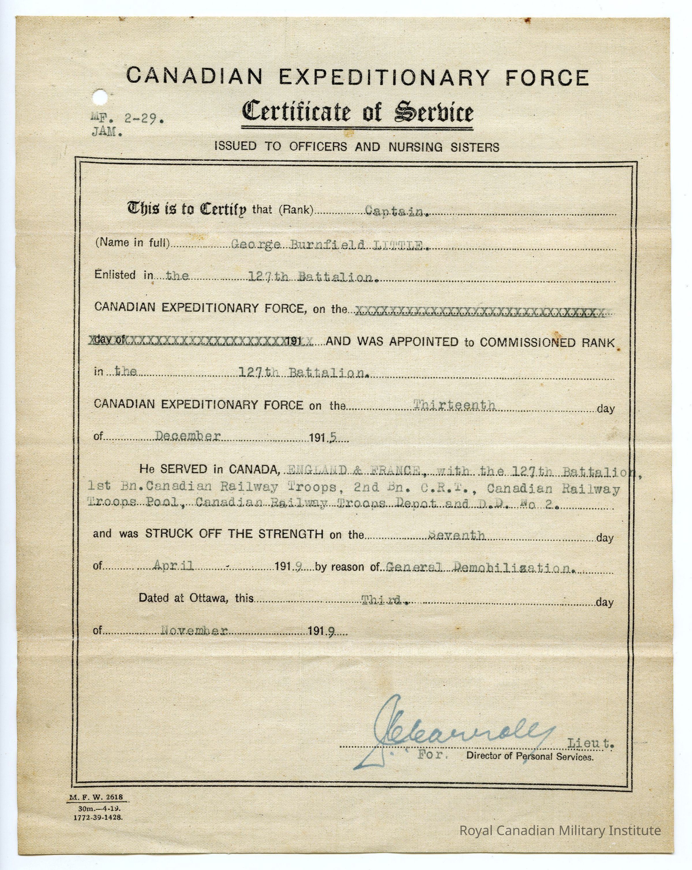 1919 Canadian Expeditionary Force Service Certificate "Captain George Burnfield Little, 127th (12th York Rangers) Infantry Battalion."Entry/Object ID