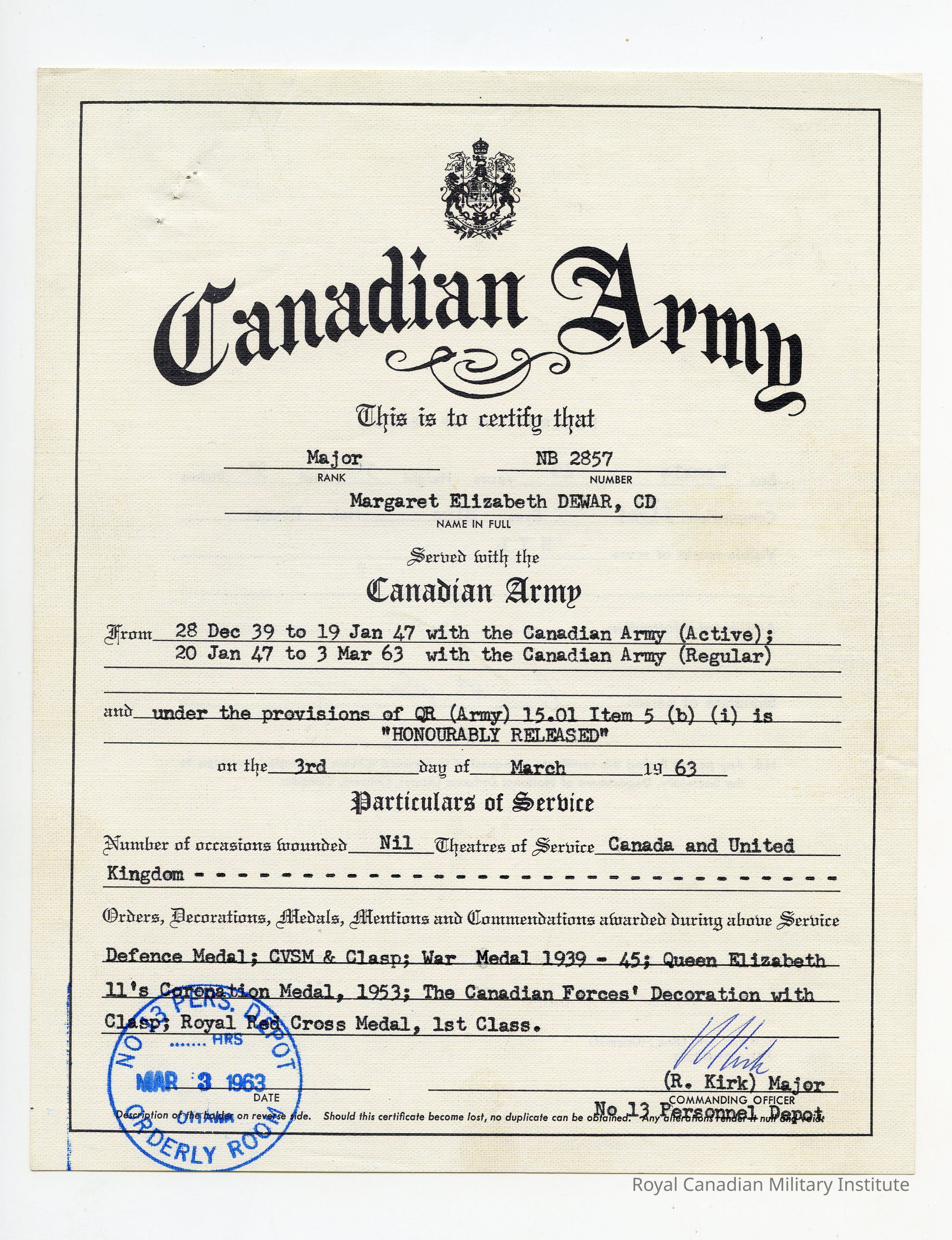 Certificate issued by the Canadian Army to certify that Major Margaret Elizabeth Dewar, CD served in the Canadian Army between 28 Dec 1939 and 19 Jan 1947 (Active) and 20 Jan 1947 to 3 Mar 1963 (regular). The certificate notes that she was honourably released on March 3rd 1963.