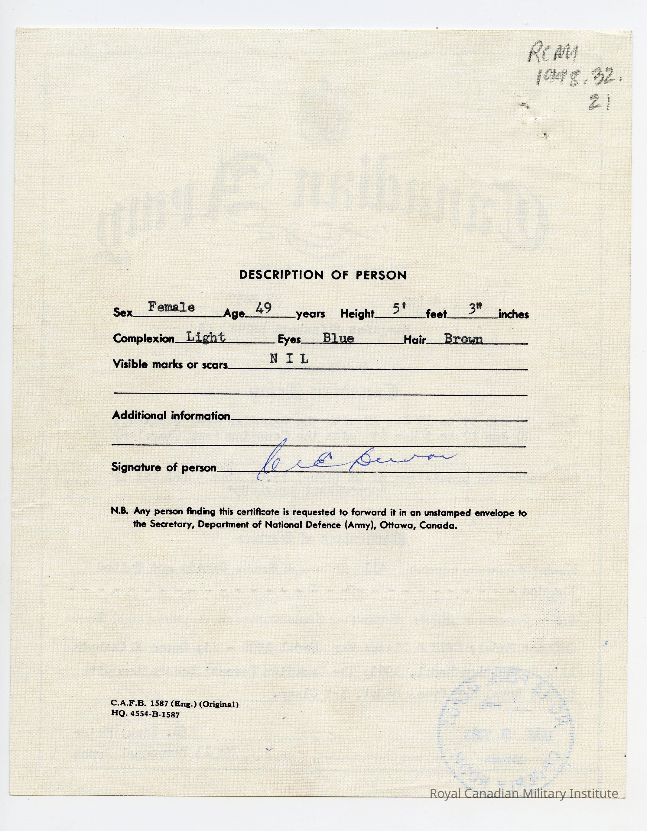 1963 Canadian Army Service Certificate "NB 2857 Major Margaret Elizabeth Dewar, C.D."Entry/Object ID