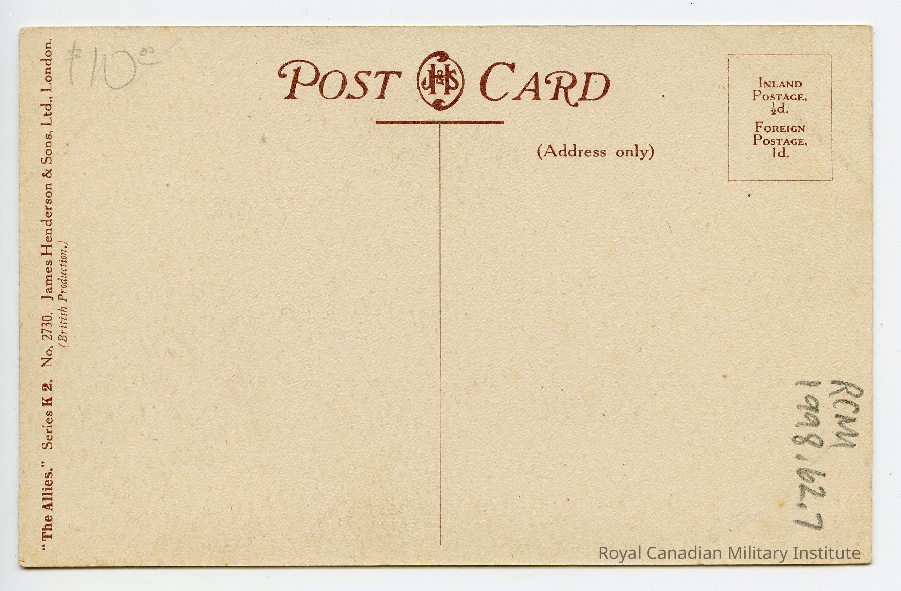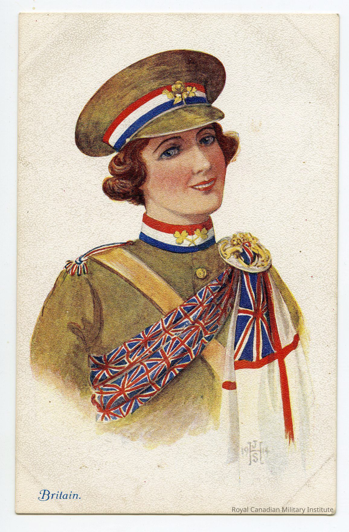The front of the postcard depicting a smiling woman in a green khaki uniform She's wearing a sash of Royal Union Flags. At the bottom it says "Britain", perhaps implying that this woman is the personnification of Britain. The back of the postcard is blank. The caption, which reads " 'The Allies.' Series K 2. No. 2730. James Henderson & Sons, Ltd., London." This postcard may have been part of a series of post cards featuring personnifications of the Allied nations.