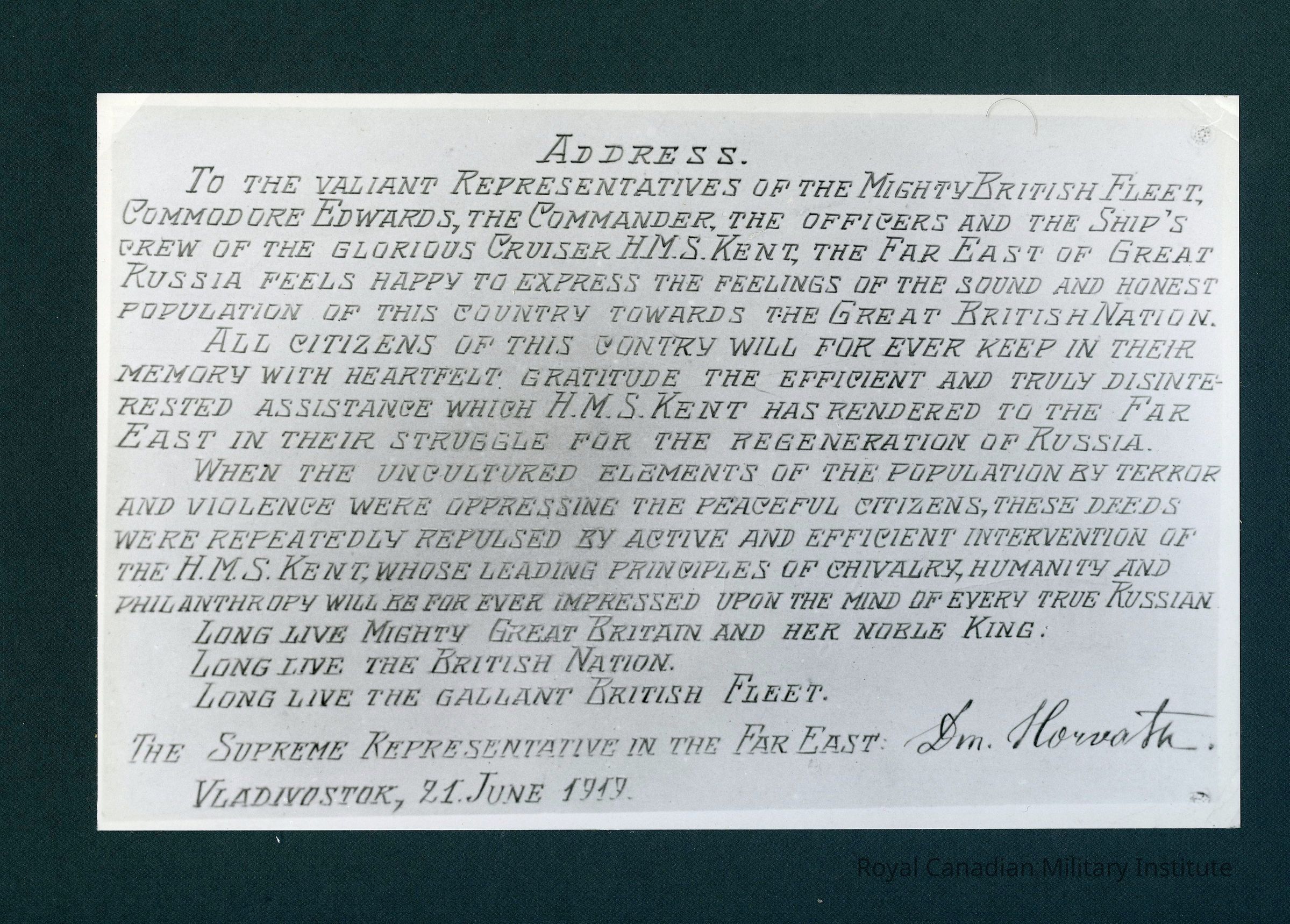 Photograph copy of "Address of Supreme Representative in the Far East to Commander, Officer, Crew of H.M.S. Kent, Vladivostock, 21st June 1919." Photo is mounted on dark green board.Made/Created