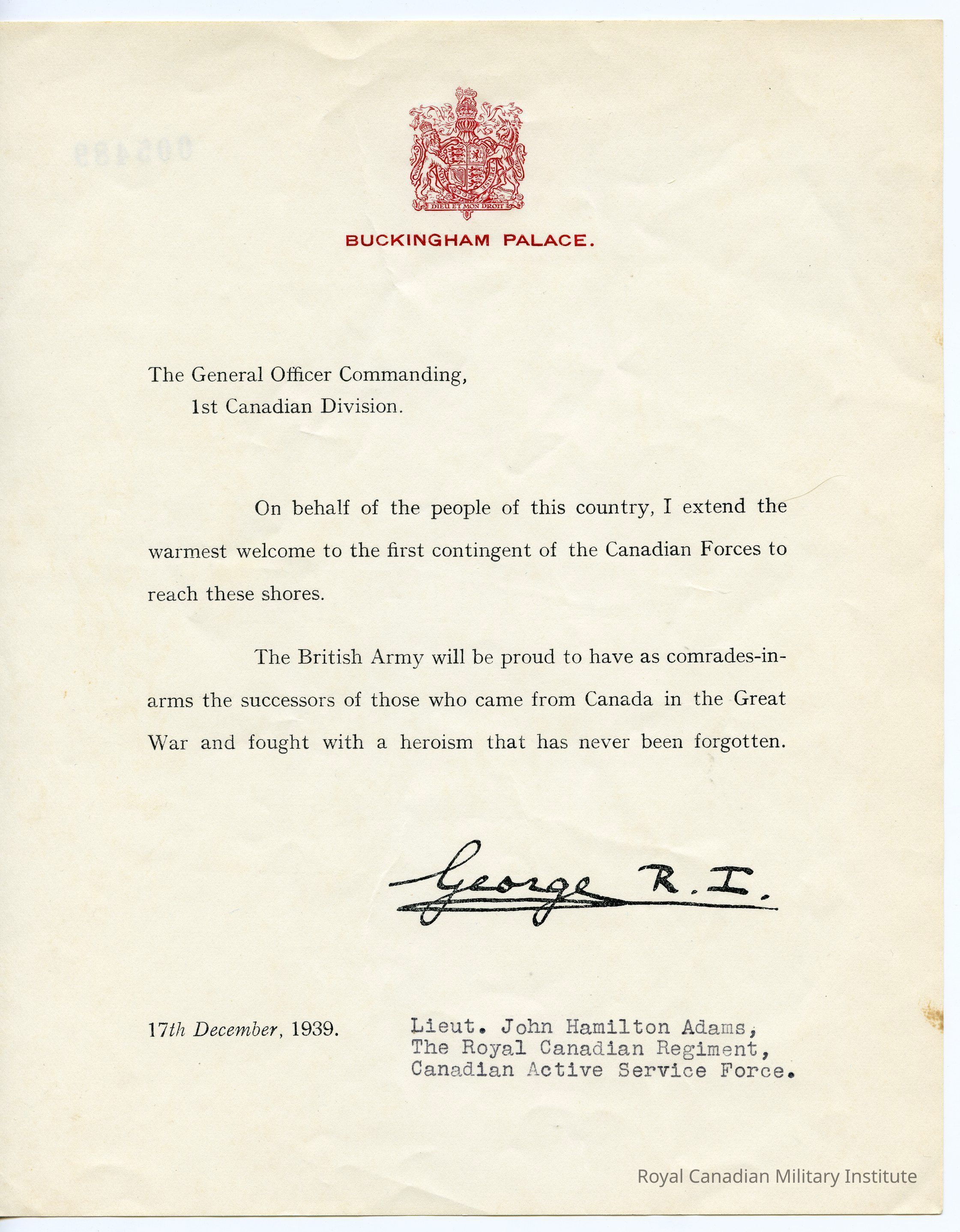 Letter from King George VI congratulating John Hamilton Adams on being part of the first contingent of Canadian Forces to land in Britain. The letter was signed with George VI's signature stamp and printed on Buckingham Palace letterhead. It was addressed to John Hamilton Adams and sent to him via the Royal Canadian Regiment of the Canadian Active Service Force. The letter is dated December 17, 1939. The reverse of the letter is stamped "005489".Made/Created