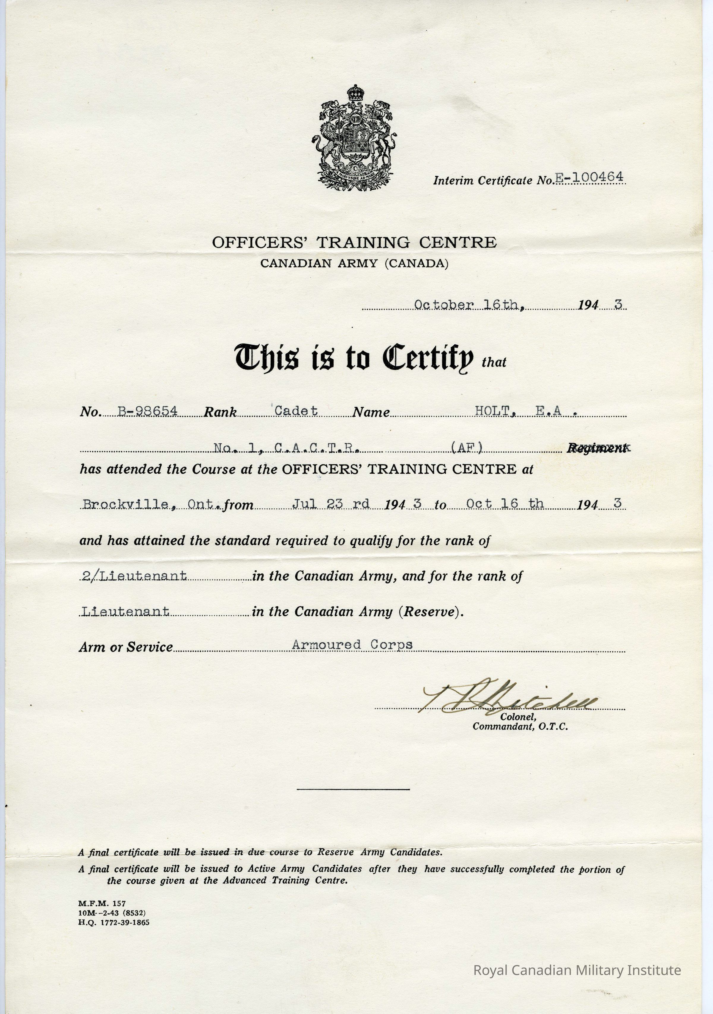 Document reads: "Interim Certificate No. E-100464 / Officers Training Centre Canadian Army (Canada) / October 16th, 1943 / This is to certify that / No. B-98654 Rank Cadet Name Holt, E.A. / No. 1, C.A.C.T.R. (AF) Regiment / has attended the Course at the OFFICERS' TRAINING CENTRE at / Brockville, Ont. from Jul 23rd 1943 to Oct 16th 1943 / and has attained the standard required for the rank of / 2/Lieutenant in the Canadian Army, and for the rank of / Lieutenant in the Canadian Army (Reserve). / Arm or Service Armoured Corps. (signature illegible) Colonel, Commandant, O.T.C.