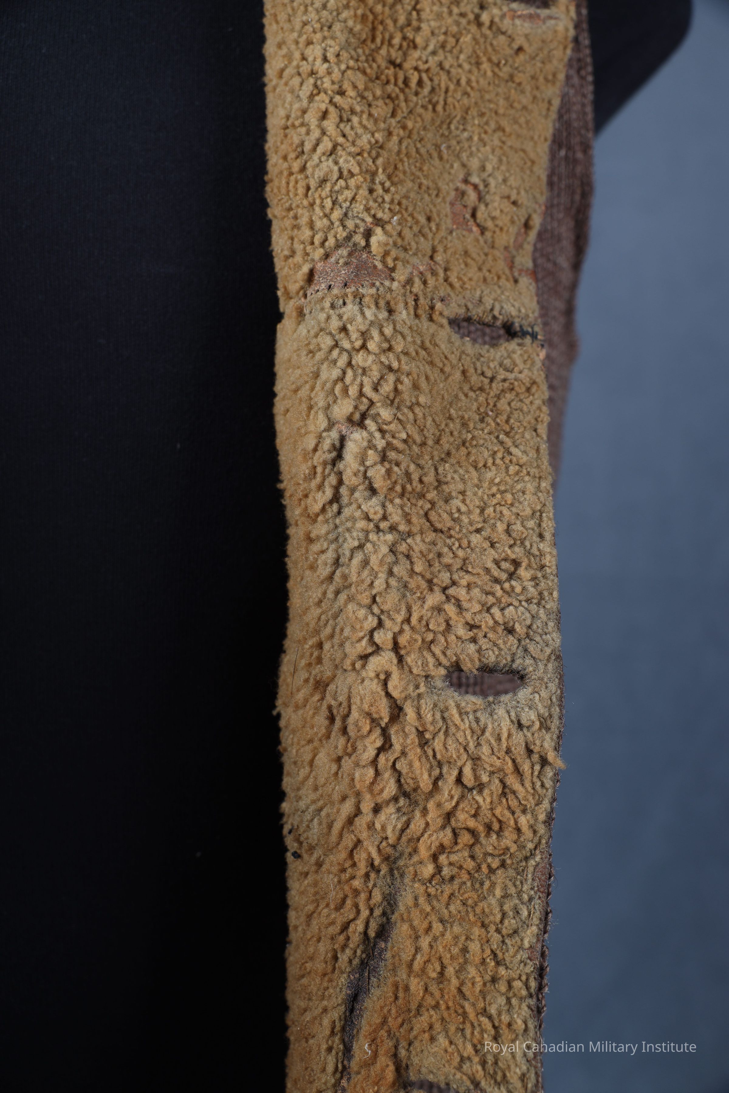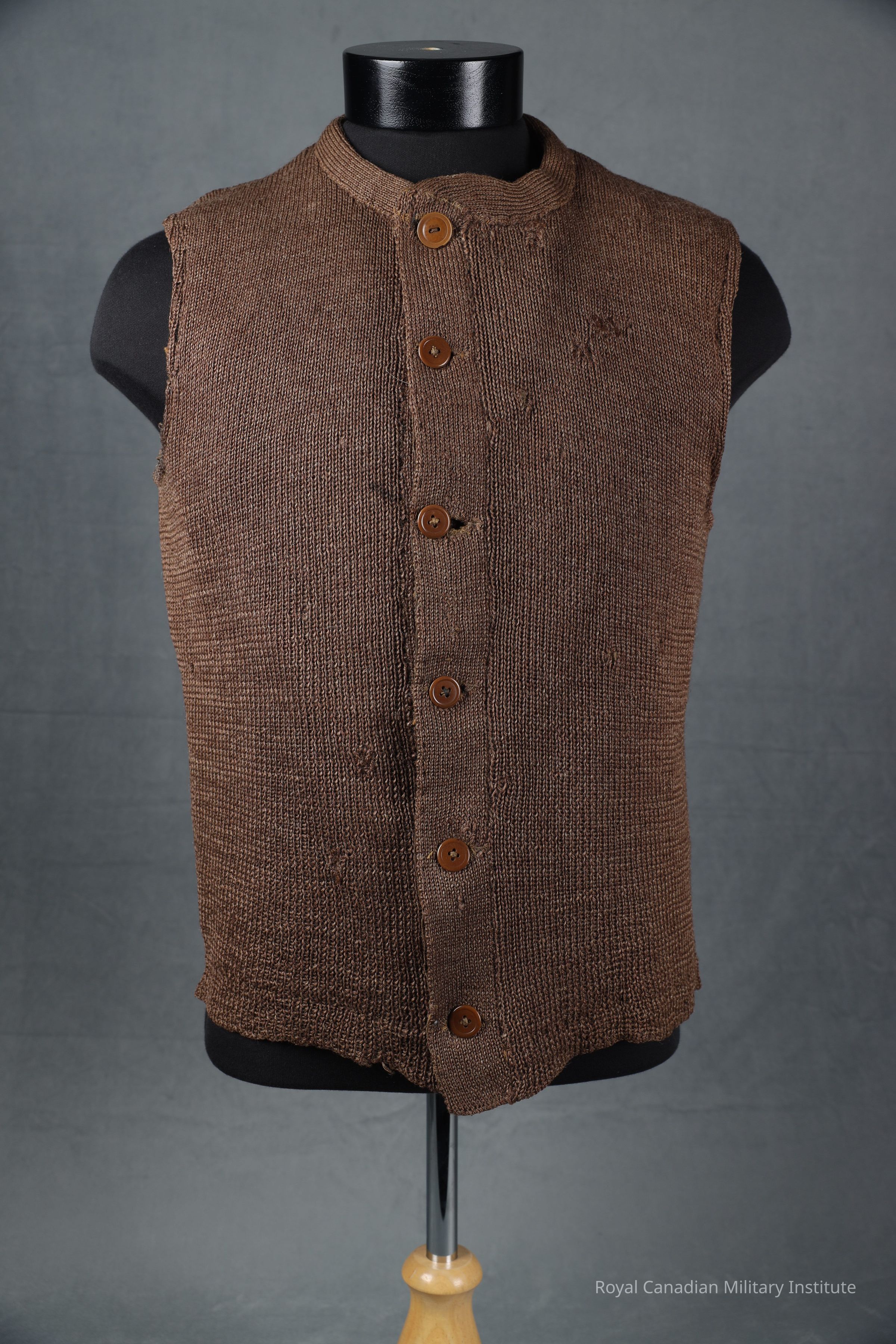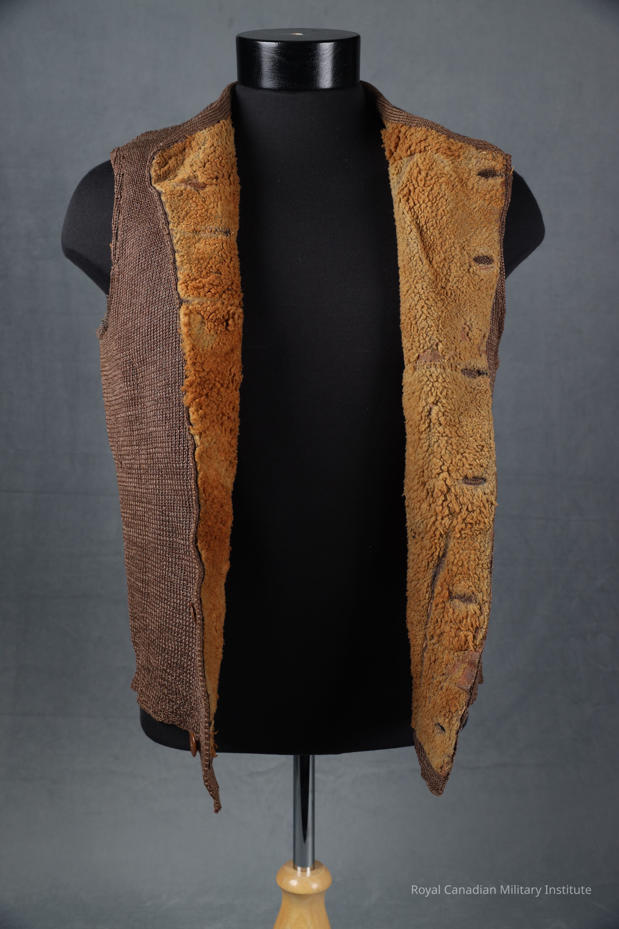 1915-1919 British Expeditionary Force/Canadian Expeditionary Force vest made of knitted wool and sheepskin. The wool is khaki brown. The vest is single breasted and closed with six buttons, one medium brown (2.3 cm diameter) with the other five being a darker brown (2 cm diameter). The button holes are hand sewn. The vest is knitted in three pieces, two centre pieces and one back piece.