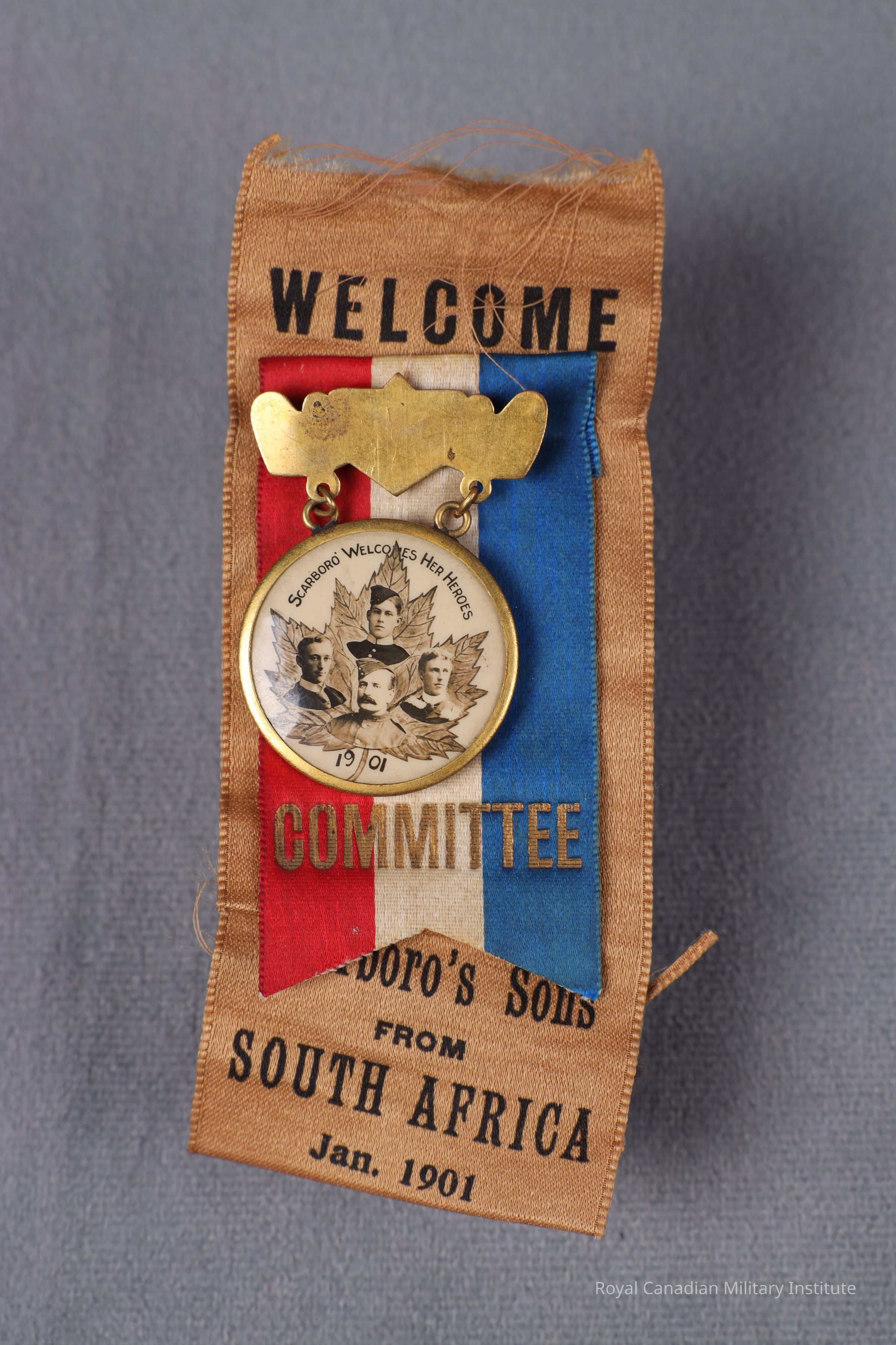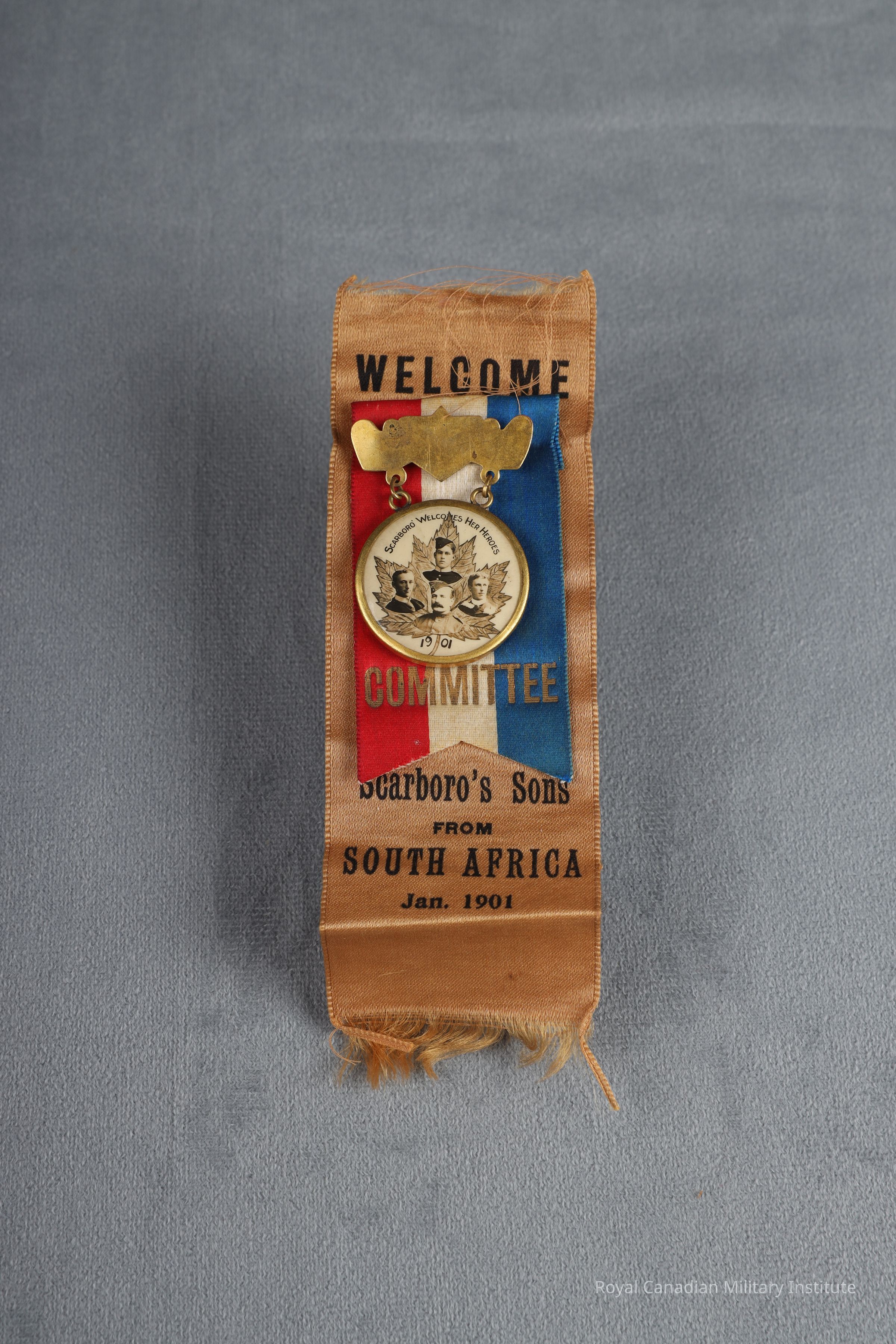 1901 Scarboro Welcome Home Committee South Africa War Medallion. Circular dark gray steel plate with gilt metal rim, plastic front. Inside is white plastic field with sepia image of maple leaf, four photographs of Scarboro veterans (Little at bottom). Titles "Scarboro Welcomes Her Heroes 1901" Medallion has gilt metal "W" suspender pinned to 8 x 4.2 red/white/blue swallowtail silk ribbon. A second ribbon behind this is brown tan silk or satin, with black title "Welcome Scarboro's Sons From South Africa Jan. 1901"Made/Created