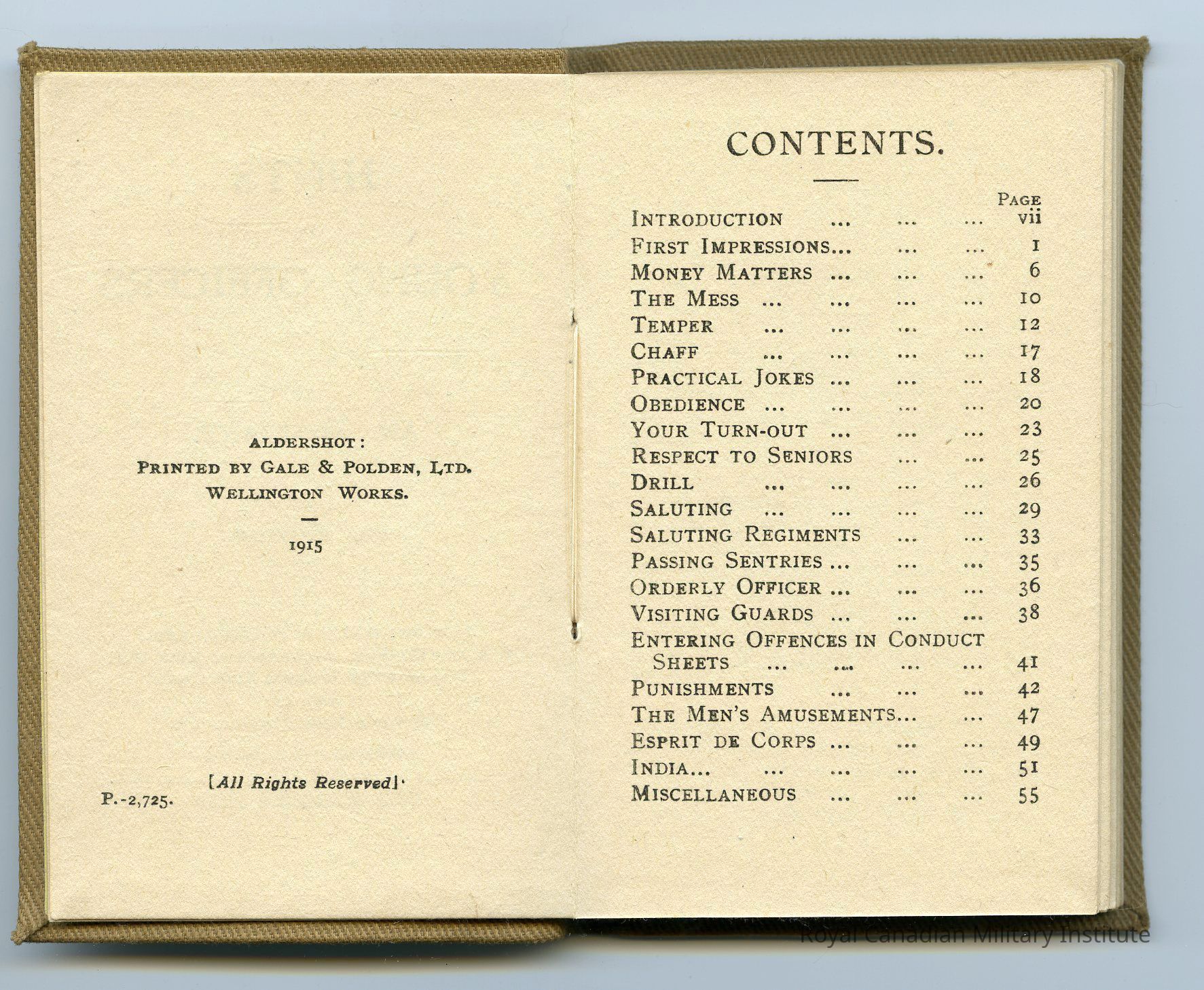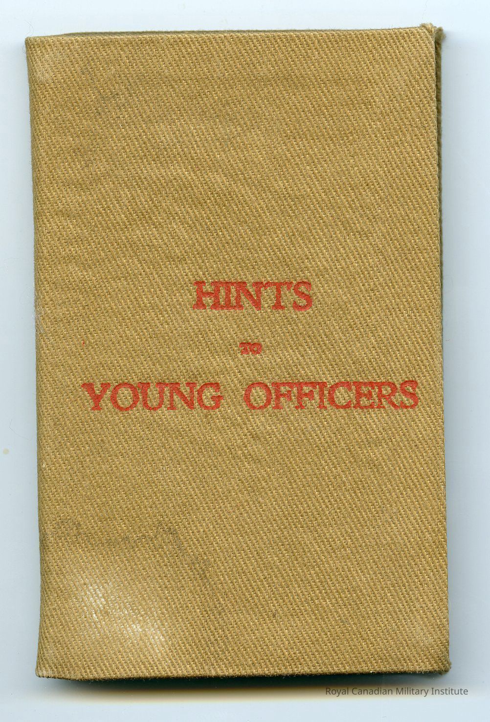 card covers. Title in red "Hints To Young Officers." 61 pages with social advice on the mess and customs, senior officers, other ranks, guard and orderly officer duties, punishments, writing up charges, India.