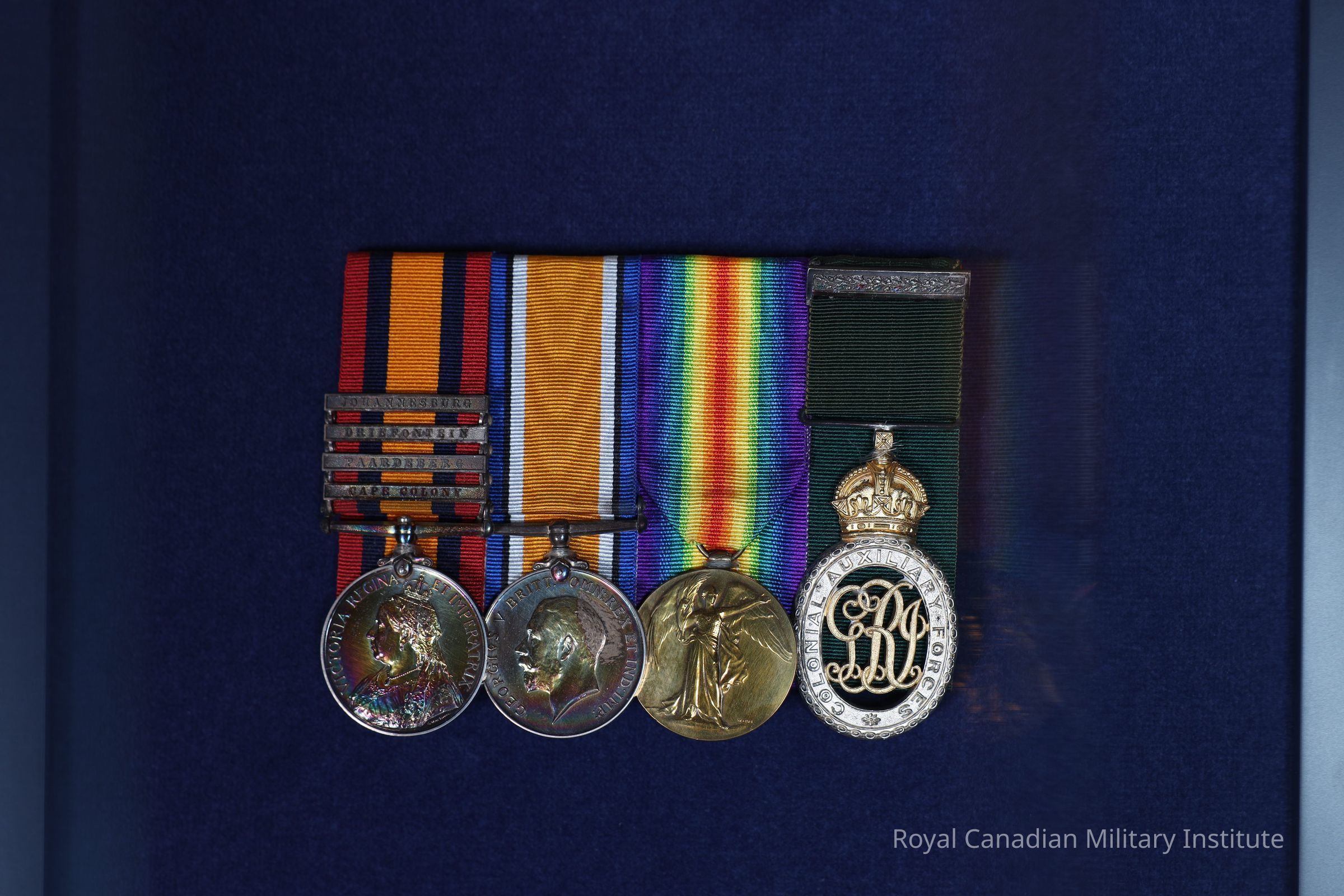 1899-1901 Queen's South Africa Medal, bars "Cape Colony", "Paardeburg", "Driefontein", "Johannesburg", to 7210 PTE. G.B. LITTLE. R.CAN.R. Circular, silver. Obverse crowned bust Queen Victoria with title "VICTORIA REGINA ET IMPERATRIX" Reverse helmeted Britannia holding flag and laurel wreath, marching soldiers in background. Title "South Africa 1899 1901"Plain bar suspender with bars fixed to mount. Ribbon red-blue-orange-blue-red, 3.2 x 9 cm. Court-mounted.