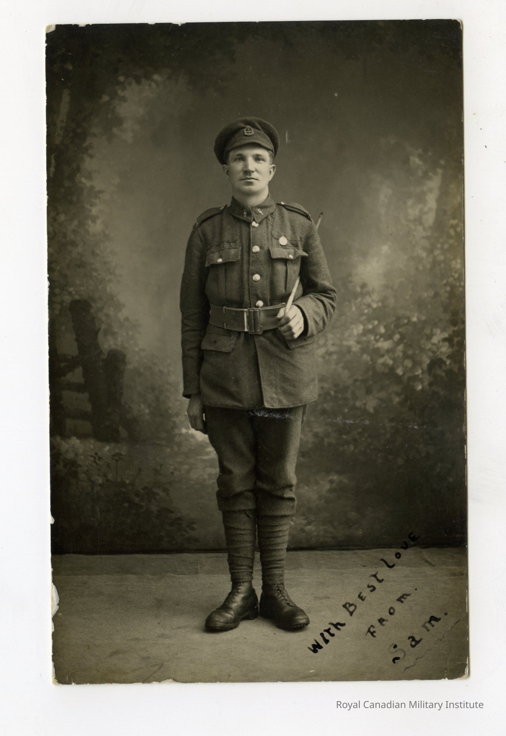A Real Photo Postcard (RPPC) of a 5th Battalion Private identified simply as "Sam". Subject stands facing the camera in full military uniform, with his soldier's stick slung under his left arm. This soldier wears what looks like a sport or community medal, that is not an official military decoration. In the bottom right corner, "With Best Love. From, Sam".