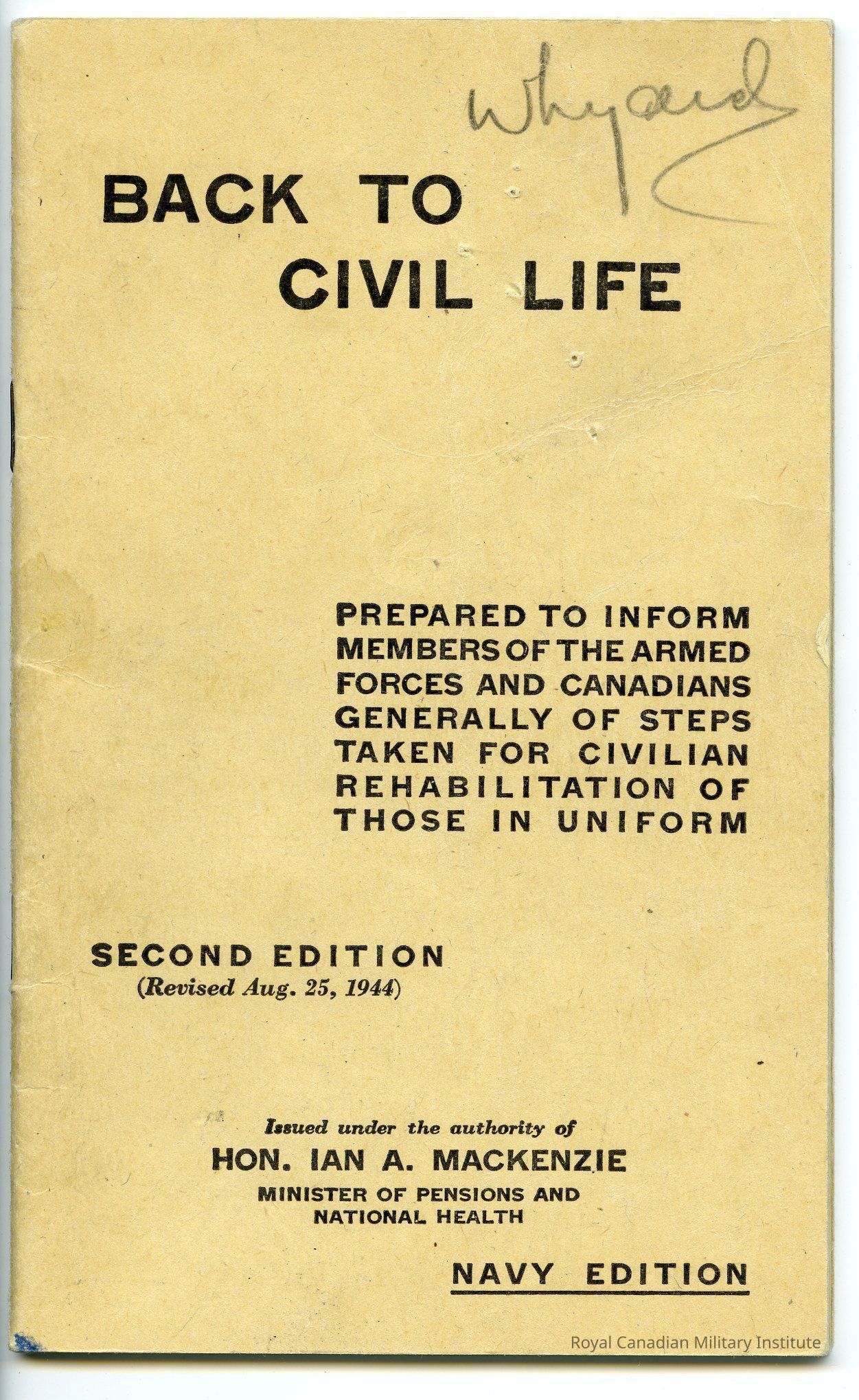 1944 Royal Canadian Navy "Back To Civil Life" pamphlet. Second Edition (Revised Aug. 25, 1944). Rectangular, buff card covers. Title in black ink: "Back To Civil Life: Prepared To Inform Members of the Armed Forces and Canadians Generally of Steps Taken For Civilian Rehabilitation of Those In Uniform"