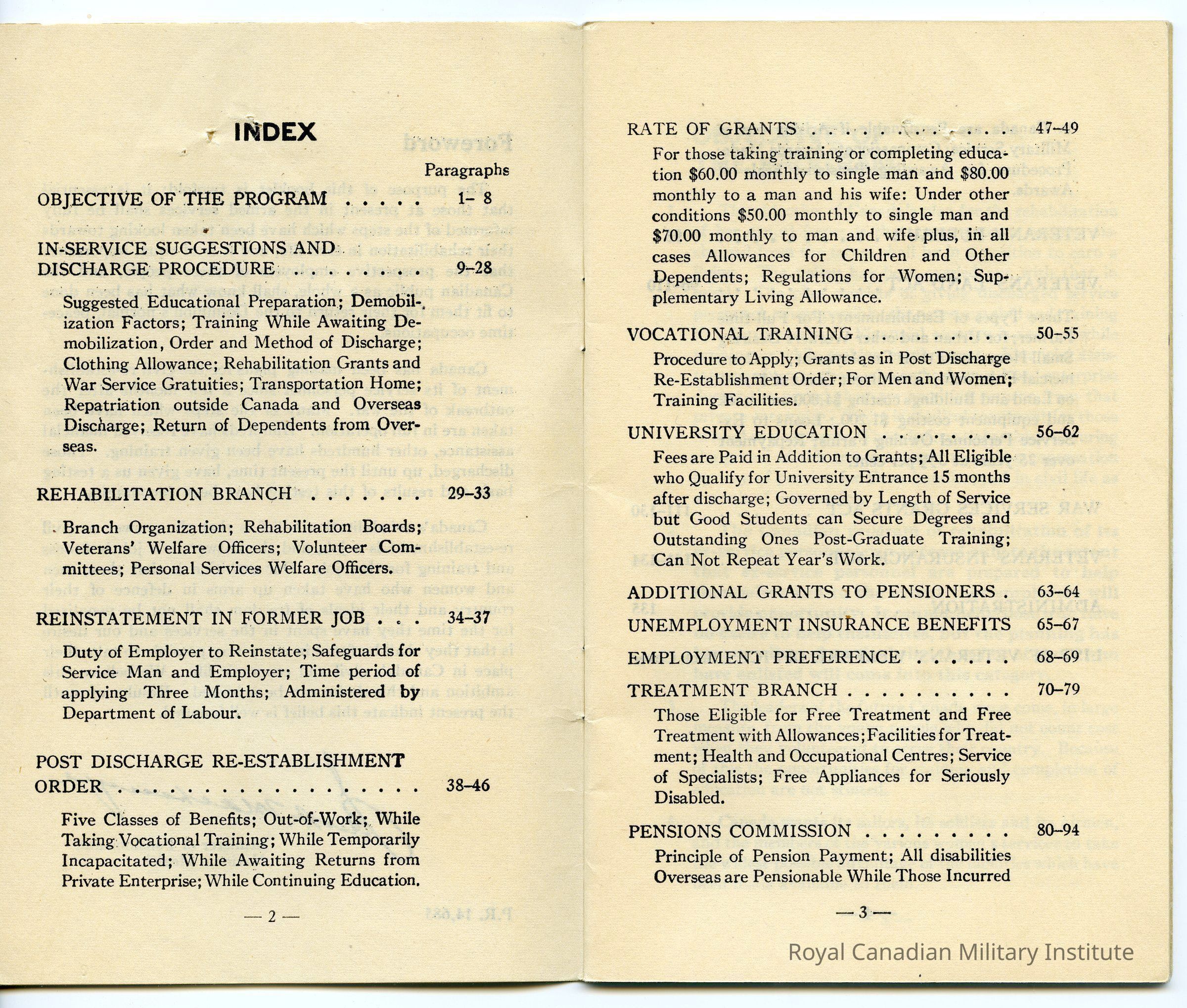 Sections on Rehabilitation, Grants, Training, University, Unemployment Insurance, Pensions, Veterans' Bureau/Land Act, War Services Grants Act, Veterans' Insurance Act, Administration. 40 pages.Dimensions