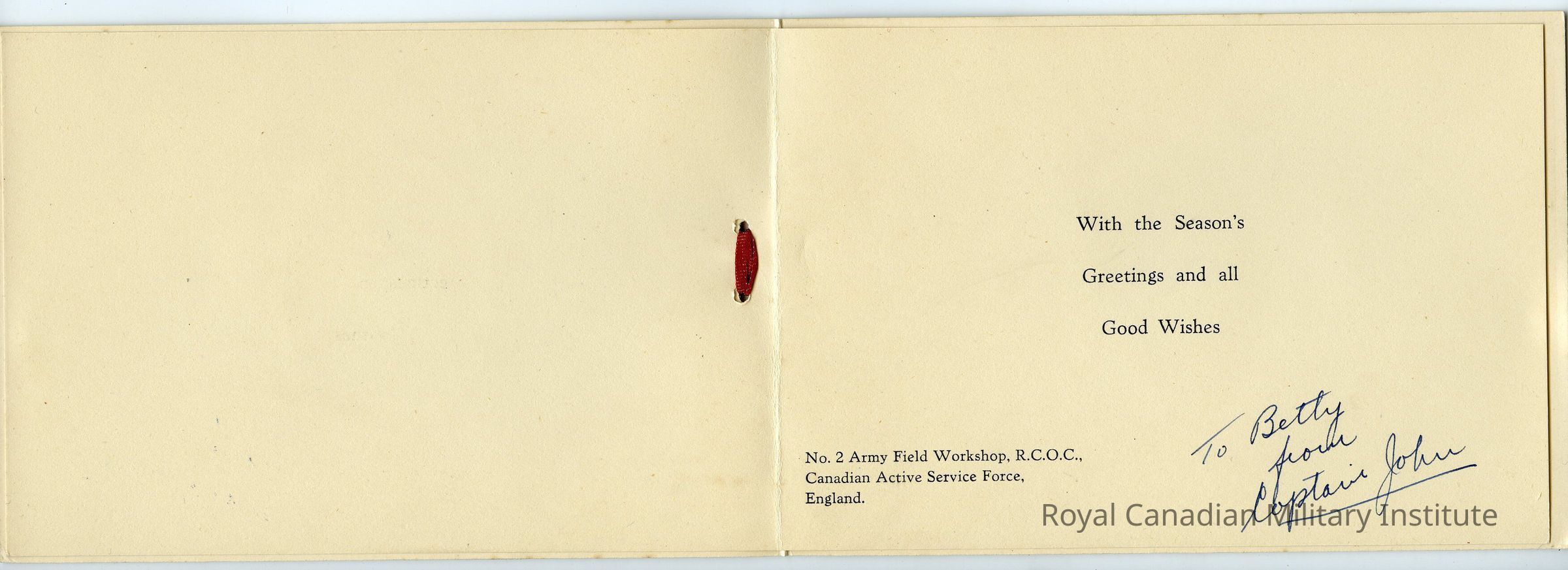 Christmas card from the No. 2 Army Field Workshop, Royal Canadian Ordnance Corps, Canadian Active Service Forces.