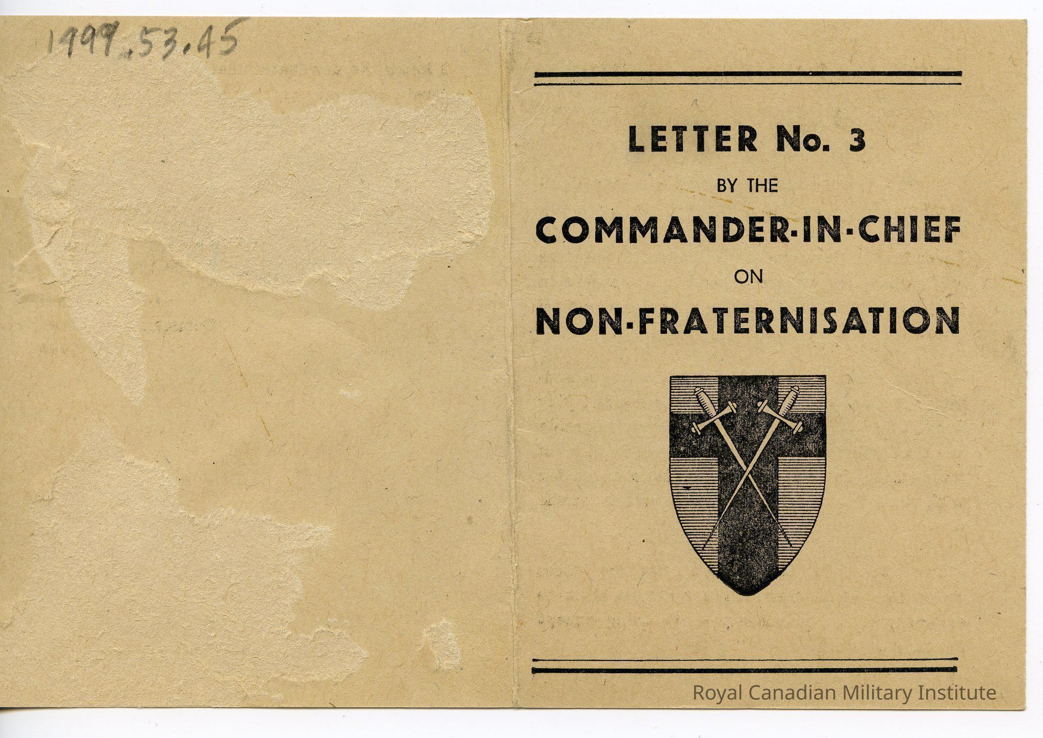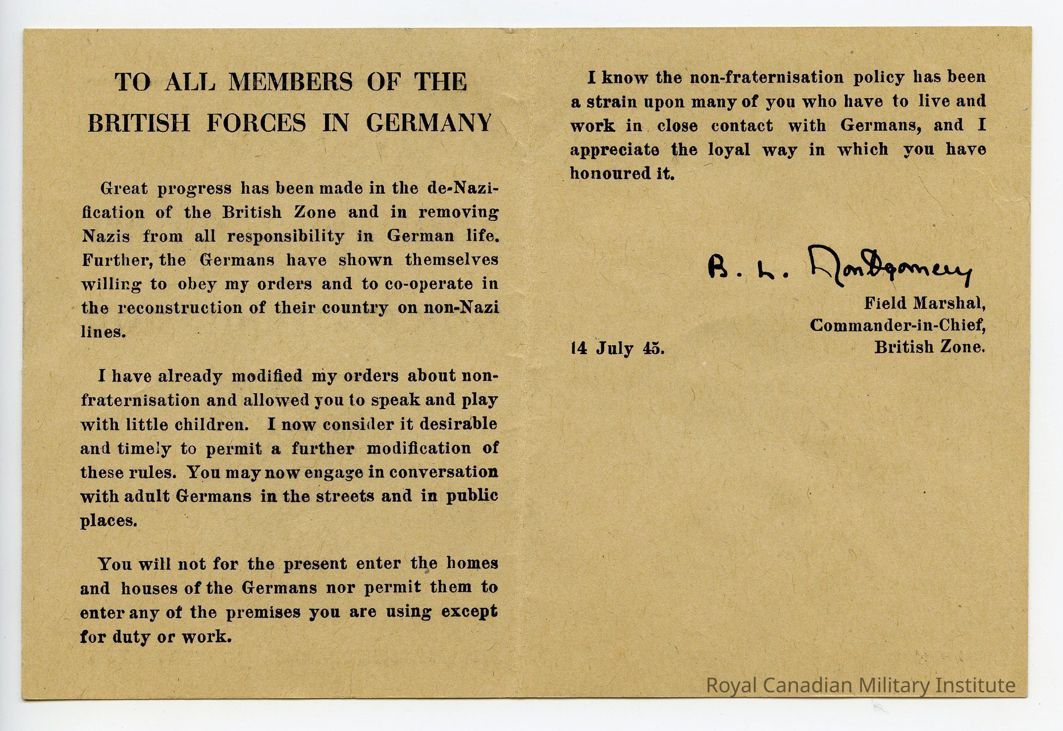 1945 British Forces In Germany "Non-Fraternization Letter No. 3." Rectangular beige cardstock. Cover title and 21st Army Group symbol. New policy permits soldiers to converse with adult Germans in the streets or in public places...Pamphlet is dated 14 July 1945 and is signed by Field Marshal B.L. Montgomery.Made/Created