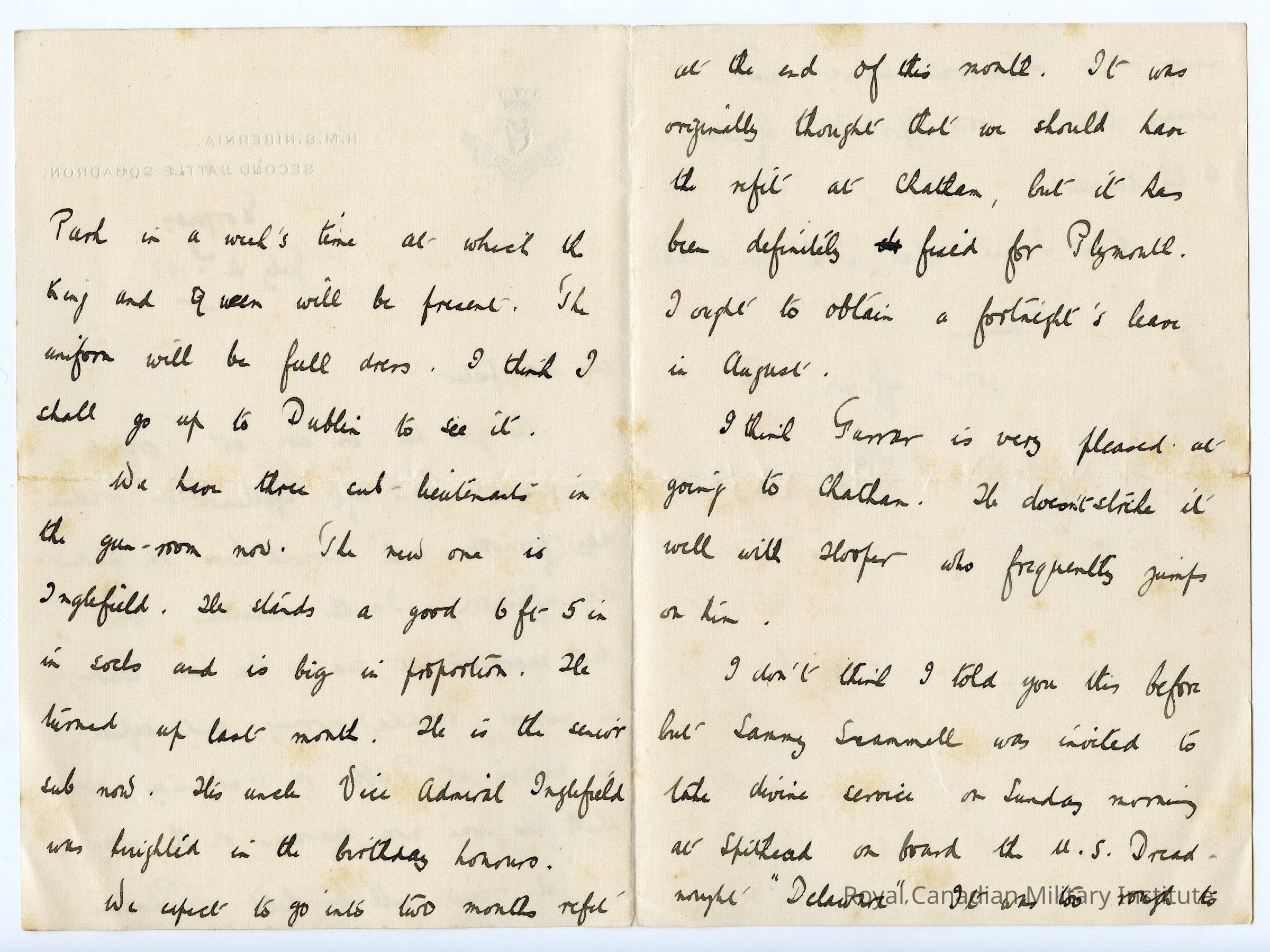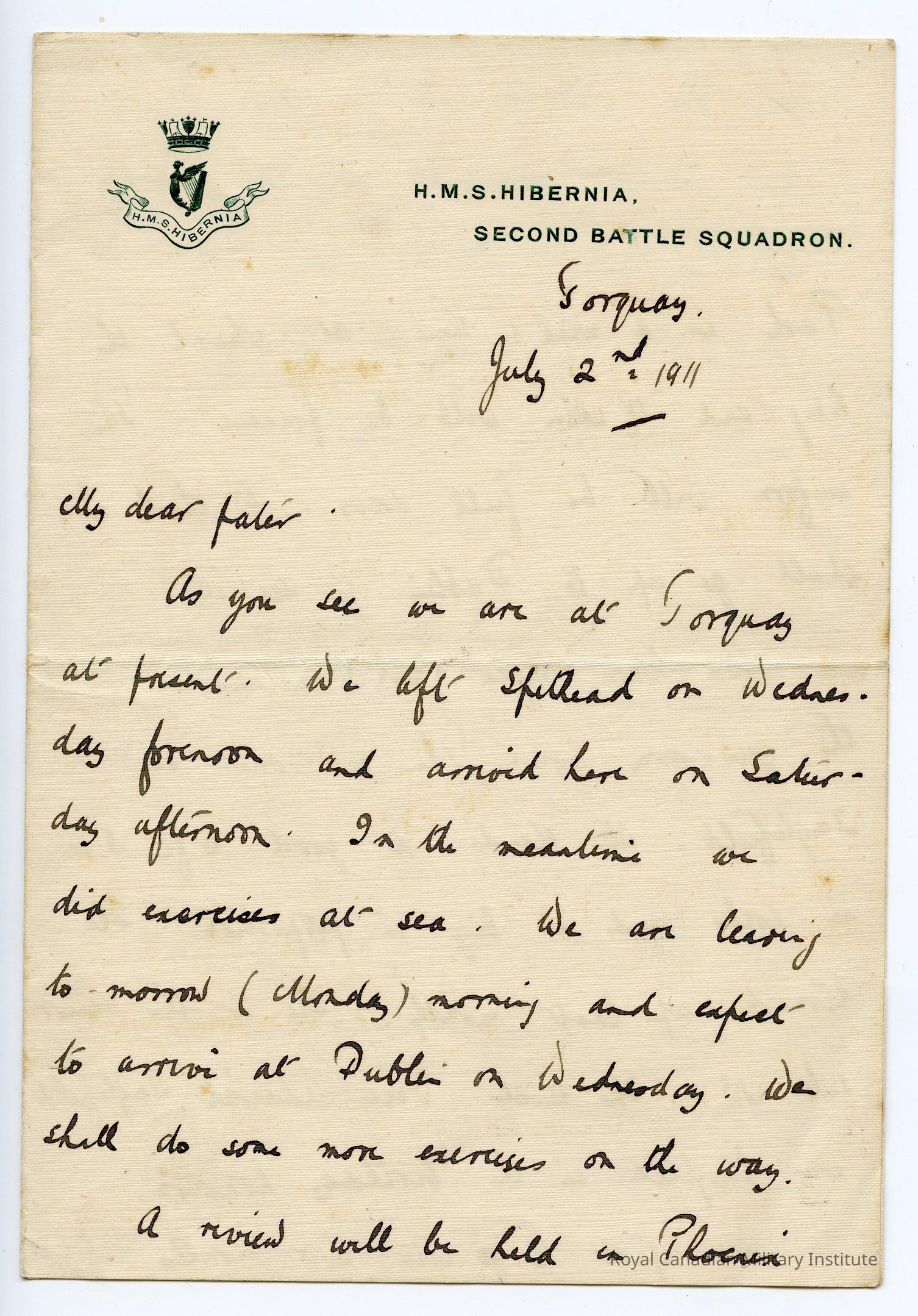Letter “William Wales Edward HMS Hibernia Second Battle Squadron, Torquay, 02/07/1911”