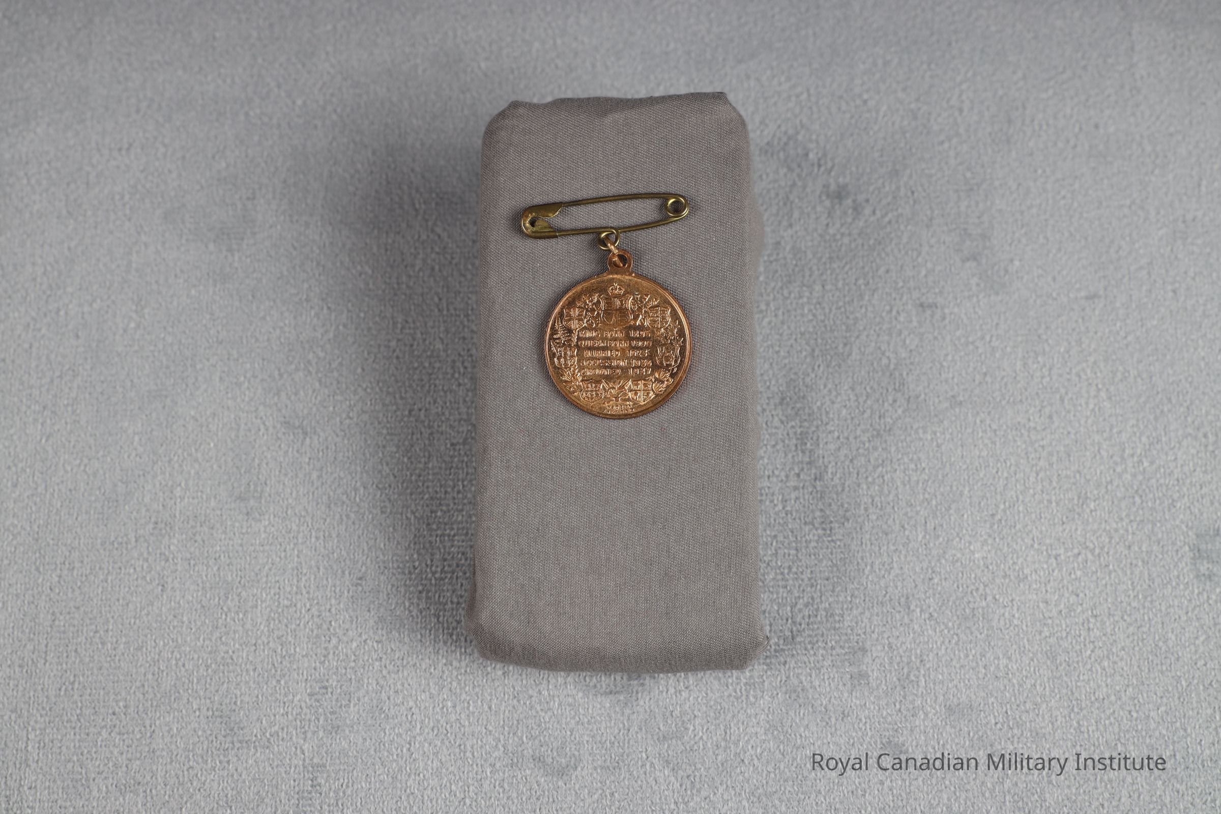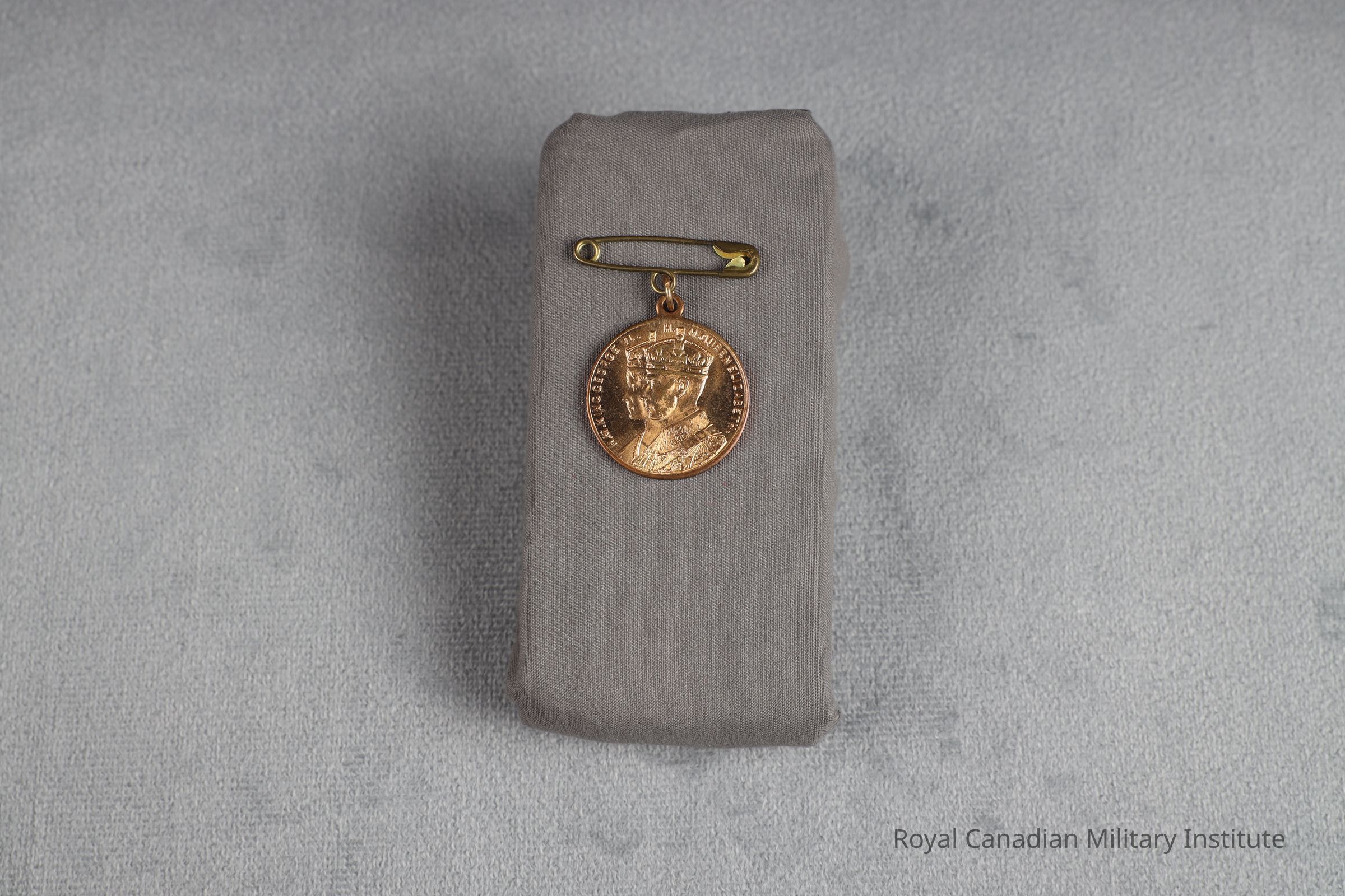 1937 King George VI/Queen Elizabeth Coronation medallion. Circular, brass-plated white metal. Obverse: joined crowned busts of King and Queen with title: "H.M. King George VI. H.M. Queen Elizabeth" Reverse: "King Born 1895 Queen Born 1900 Married 1923 Accession 1836 Crowned 1937" Surrounded by Royal and Commonwealth coats of arms. Fixed loop at top joined by rings to brass safety pin fastener.Made/Created