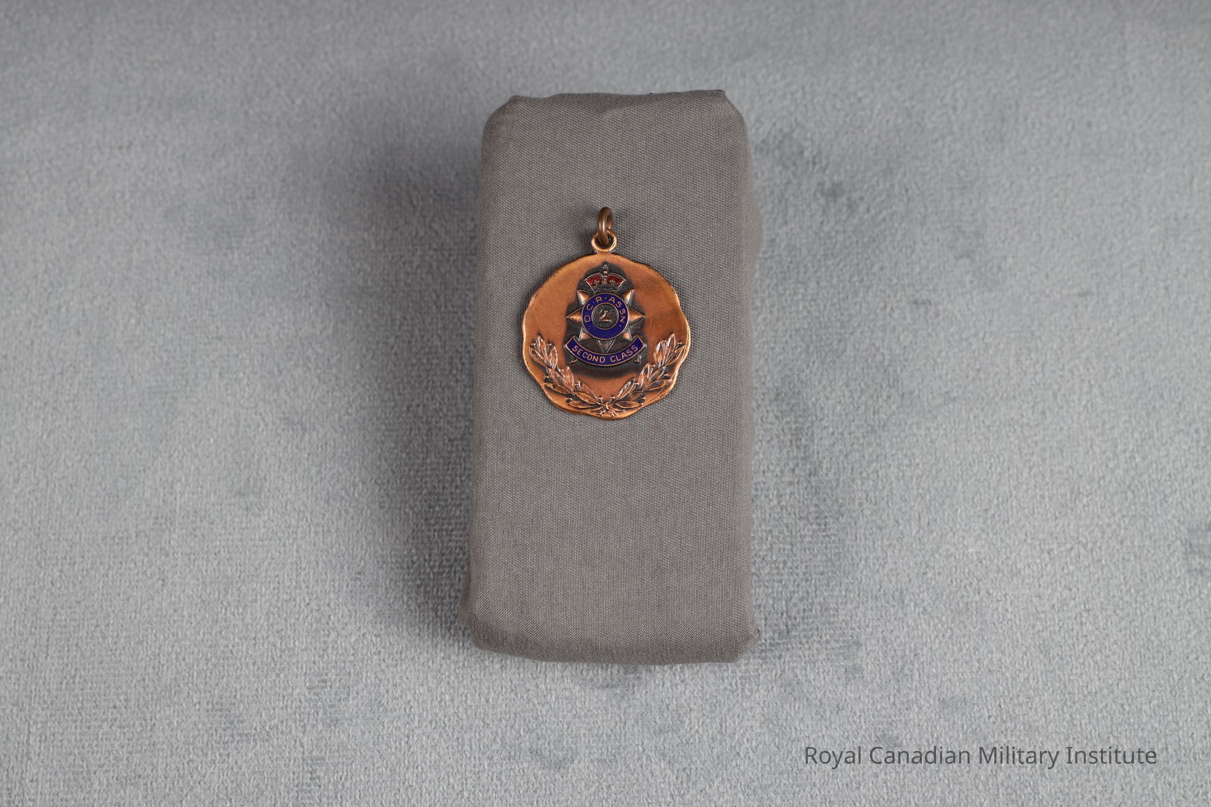 1944 Dominion of Canada Rifle Association medallion. Circular, copper. Red enamel/copper King's crown atop seven rayed star with centre copper insignia of arm holding a lightning bolt. Blue enamel/copper scroll with title "DCRASSN". A second scroll, in blue enamel and copper, reads "Second Class" At bottom is a laurel wreath in relief.Inscription/Signature/Marks
