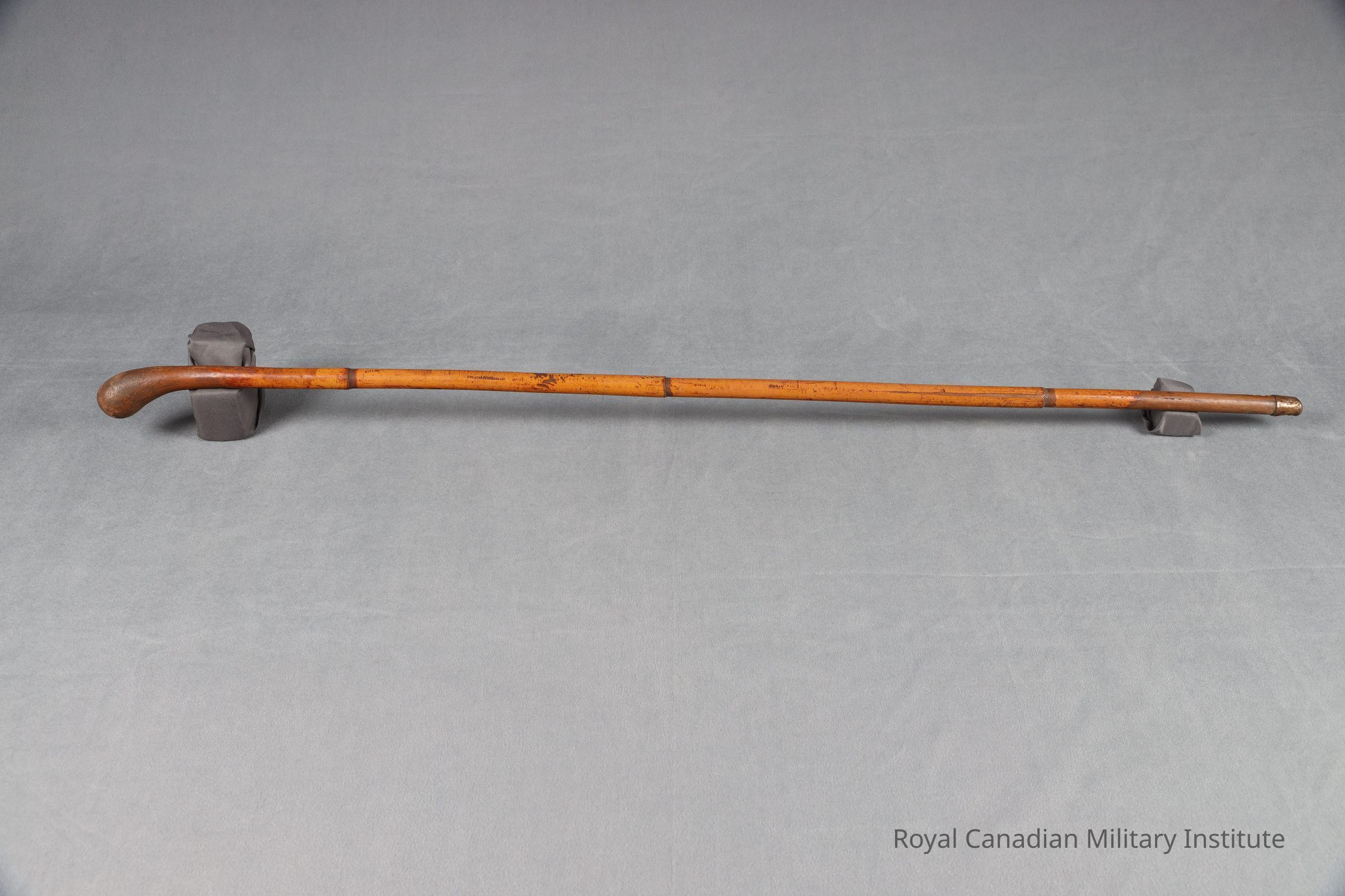 1914-1916 British Army Officer's cane. Tapered cylindrical light brown bamboo. Curved handle. End tip has brass ferrule.Made/Created