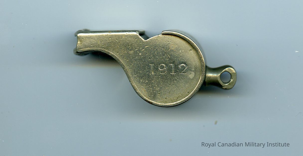 1914-1918 British Expeditionary Force officer's whistle. "P" shaped white metal. Four-piece construction. Separate rear lanyard loop. Stamped on one side: "1912" and two "Broad Arrow" marksMade/Created