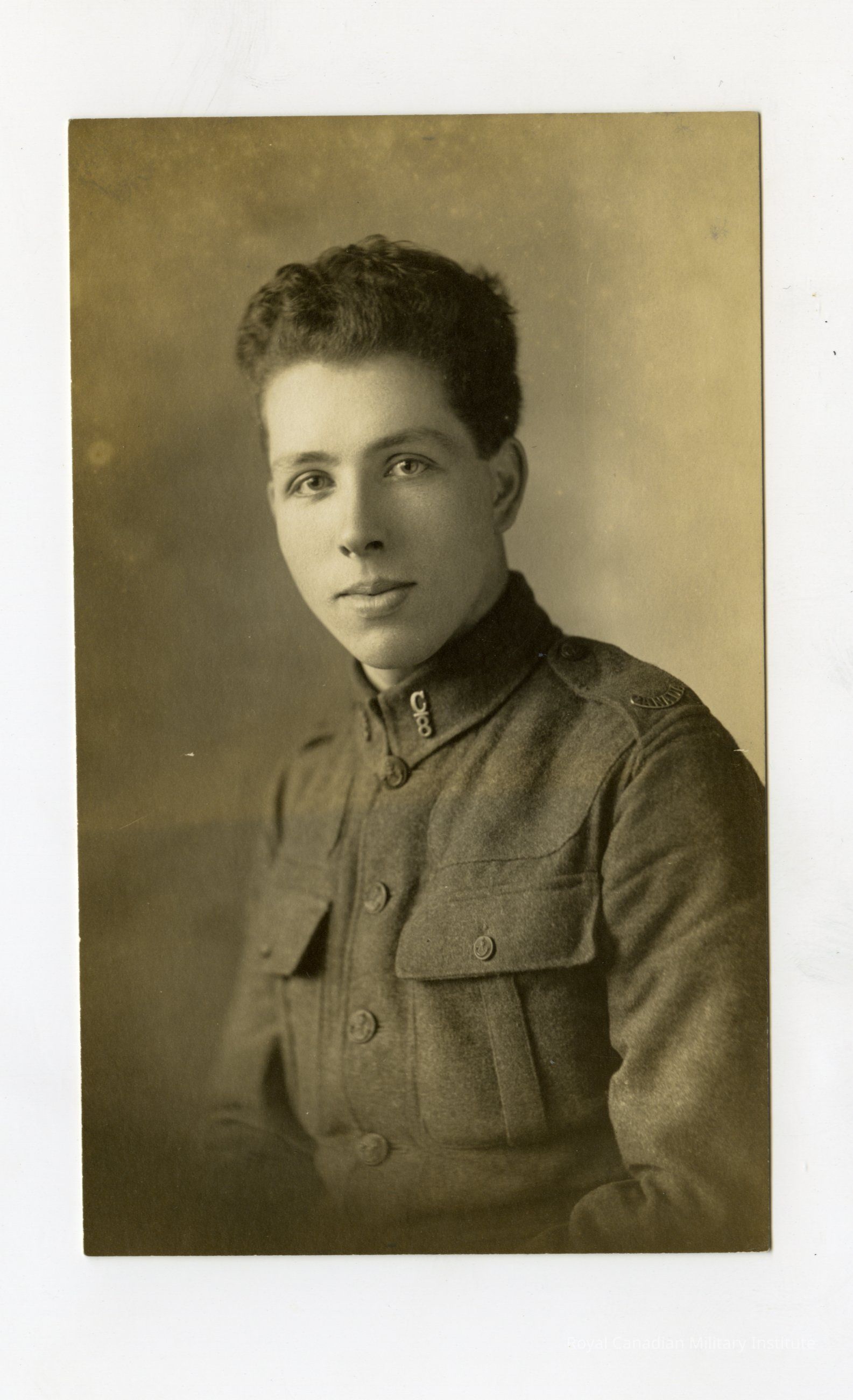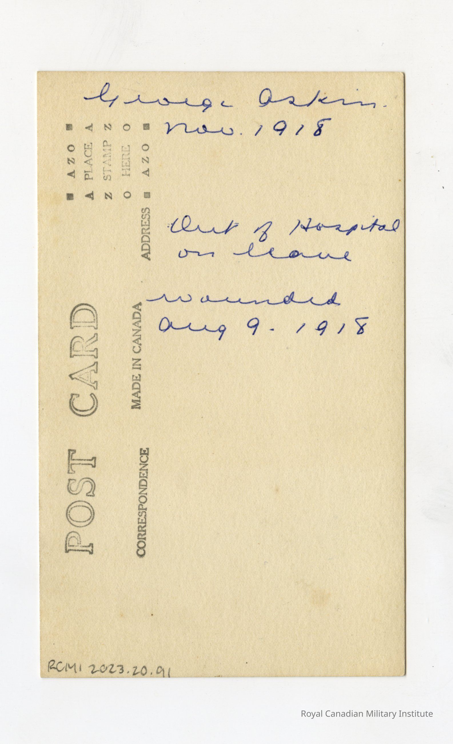 A Real Photo Postcard (RPPC) of Robert George Askin #235008, 8th battalion "Black devils". Subject is depicted from the waist up, wearing his military jacket, but not his cap. The inscription on the back identifies this man as "George Askin" when it was 1918. He was "wounded Aug. 9 1918" and when this photo was taken, he was "out of hospital on leave".