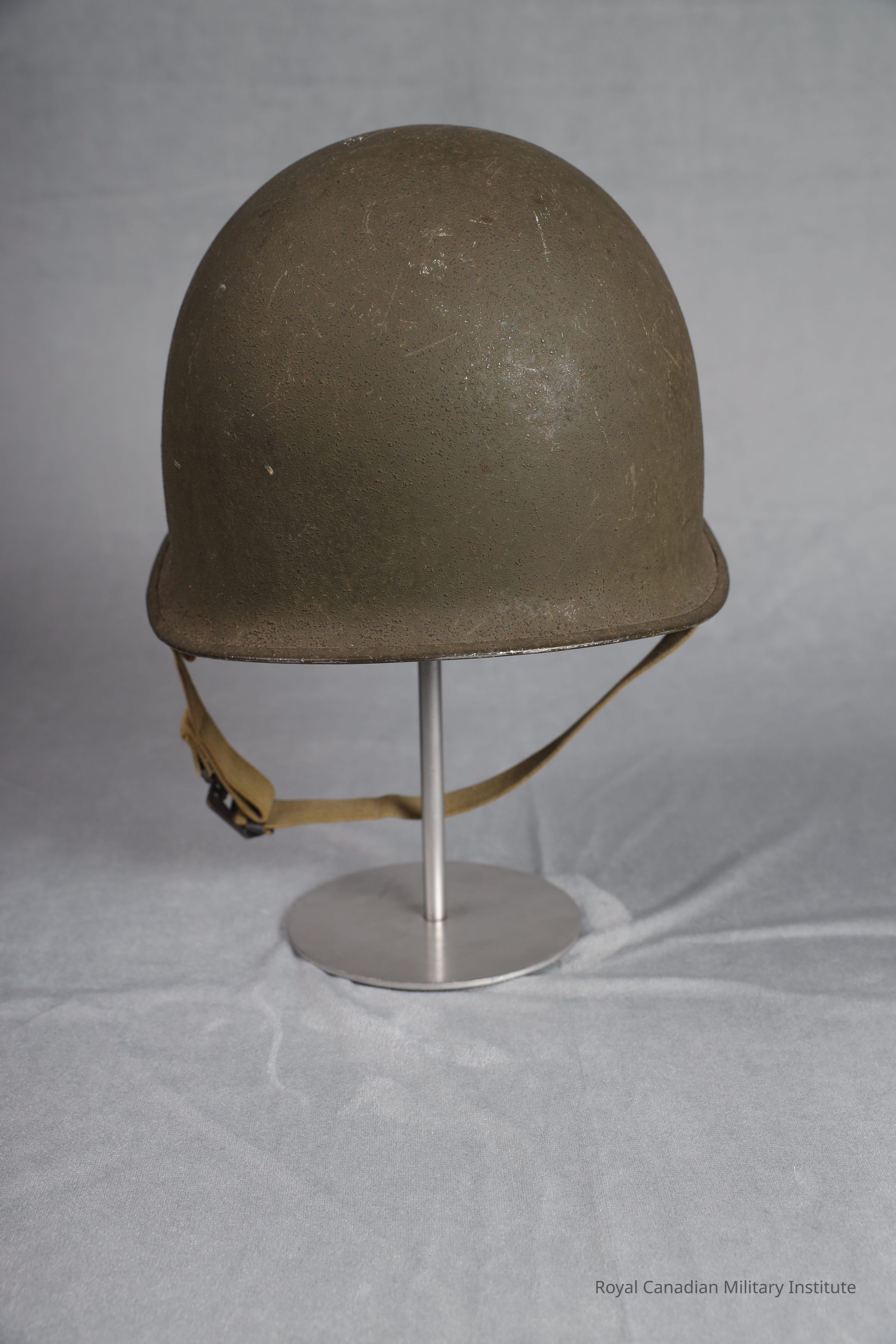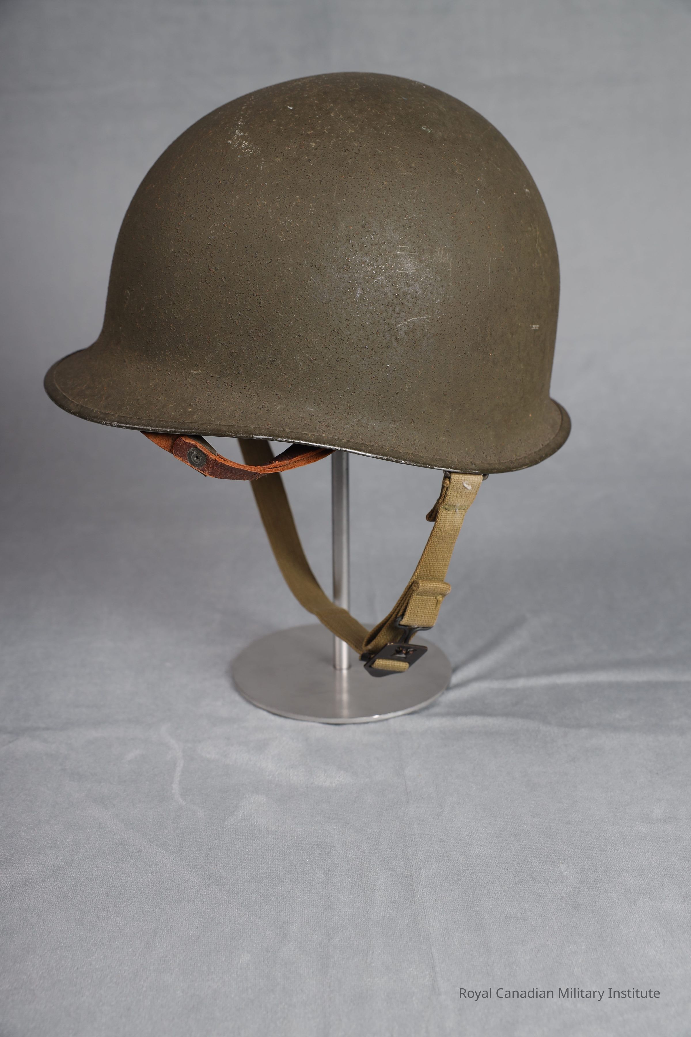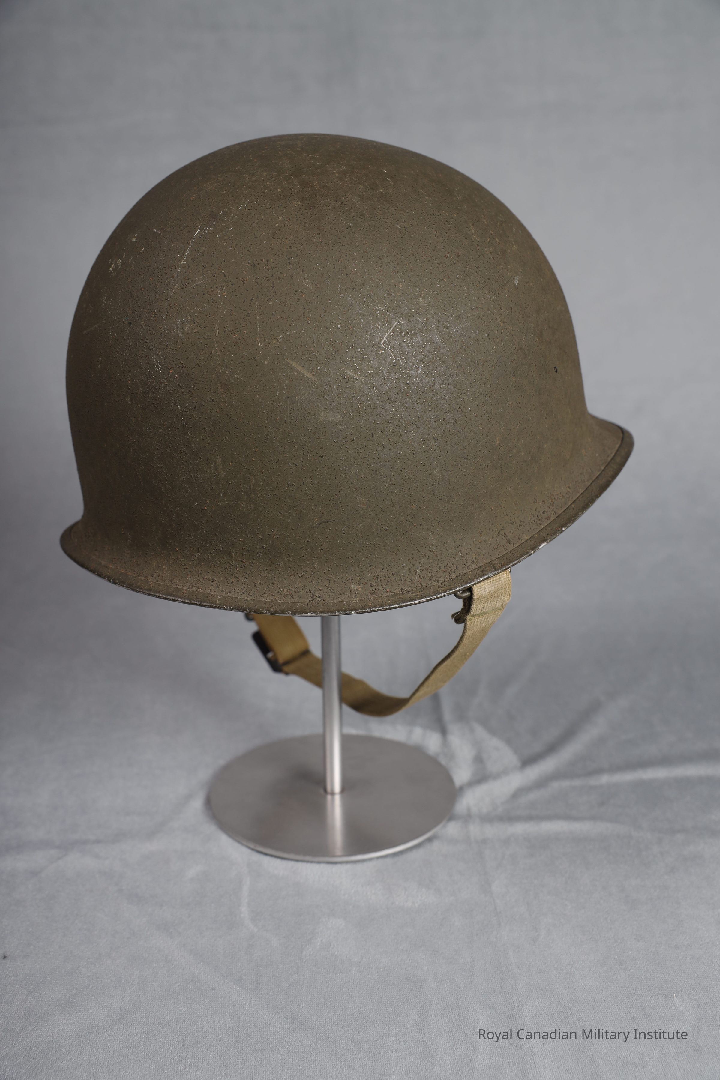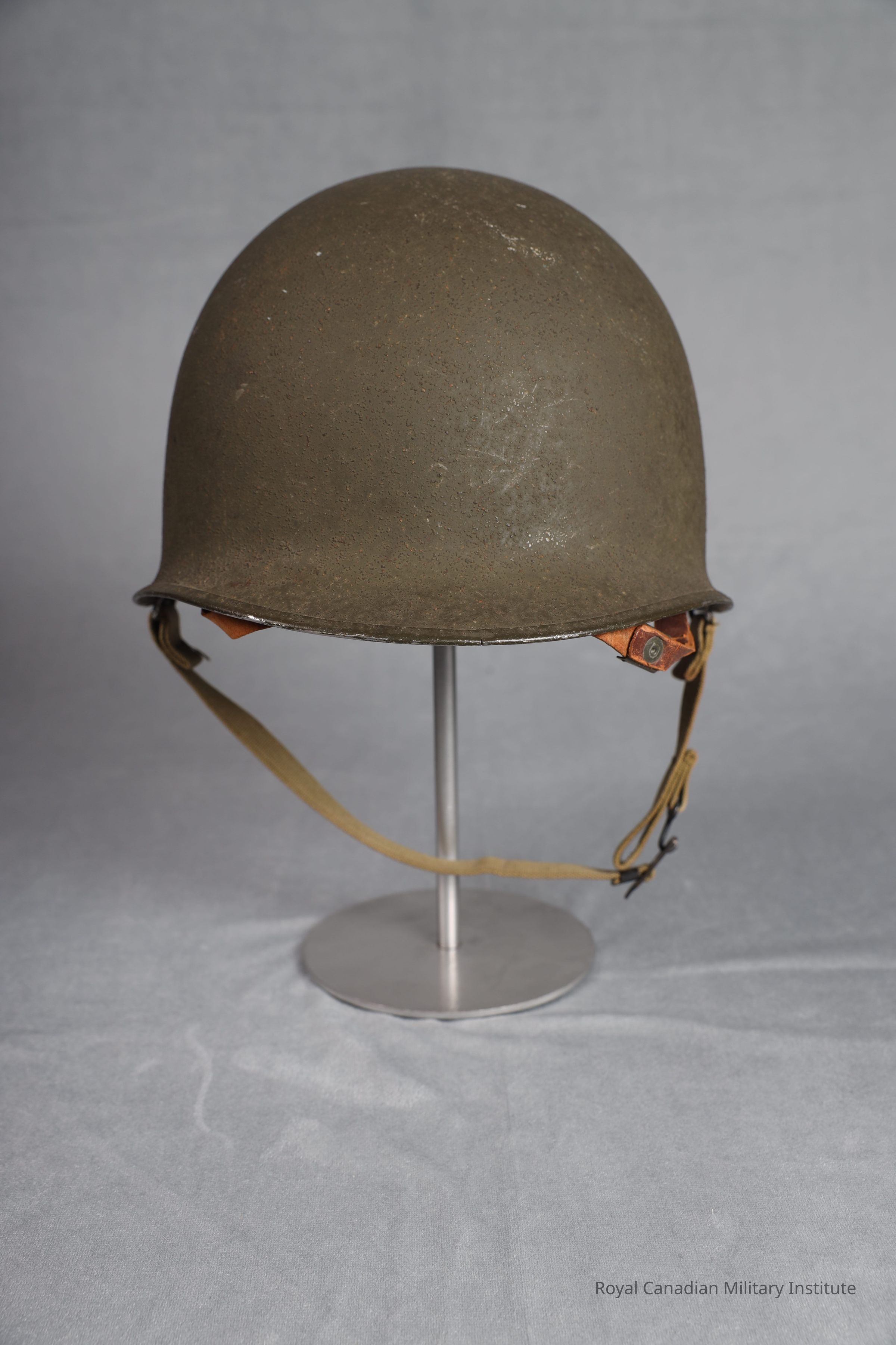 1942-1945 American Army M1 helmet. The exterior of the helmet is light olive green, with a dimpled texture. It's brim is joined at the front brim. It's exterior is olive green. The chin strap bales are fixed. The webbed chin stap is tan, its buckle and prong are made of brass. The manfacturer heat stamp underneath the brim is: "363C".Inscription/Signature/Marks