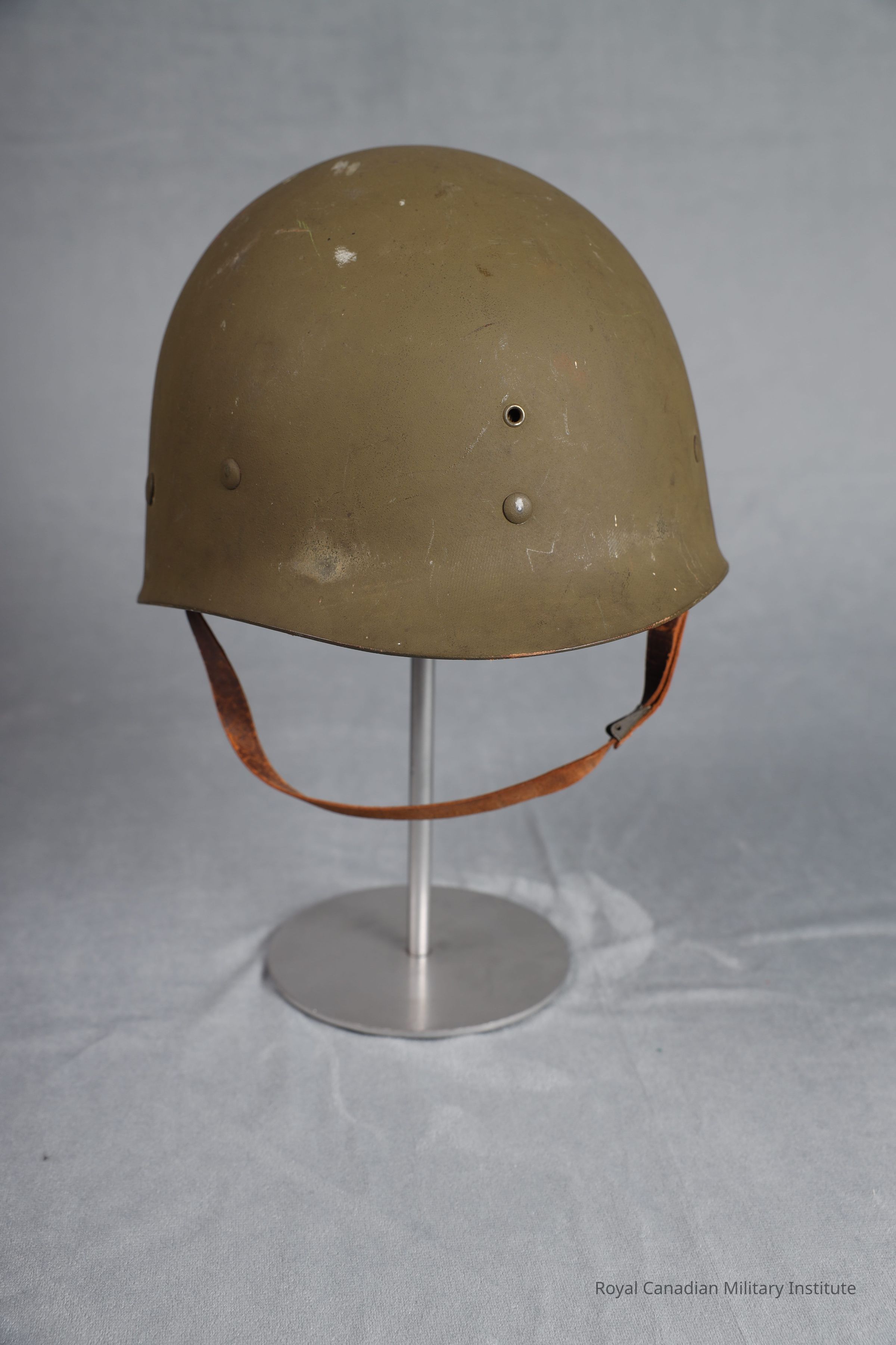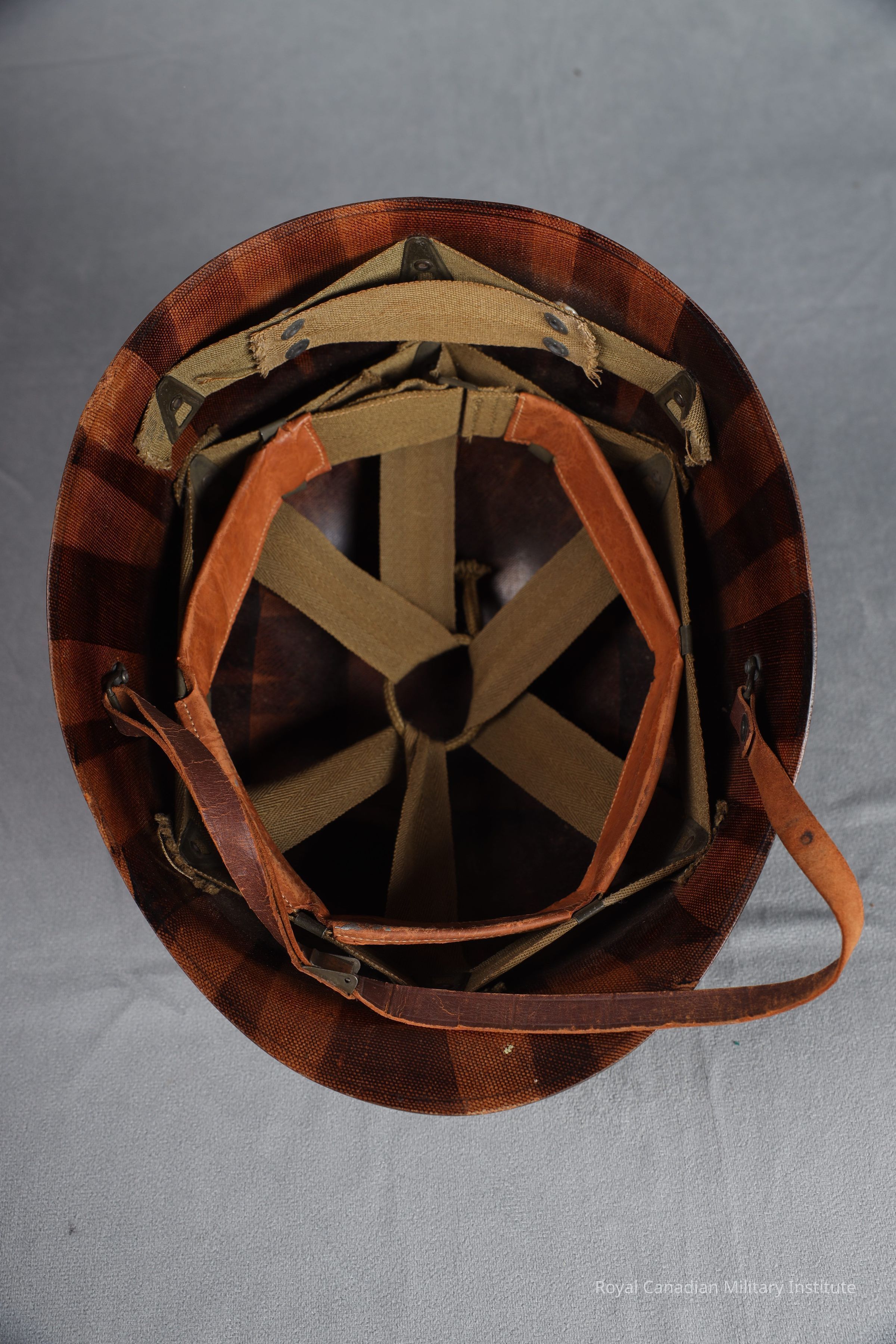1942-1945 American Army M1 steel helmet liner. Pressed high pressure composite army olive coloured fibre. Brown leather sweatband fixed to hexagonal aluminum mount.