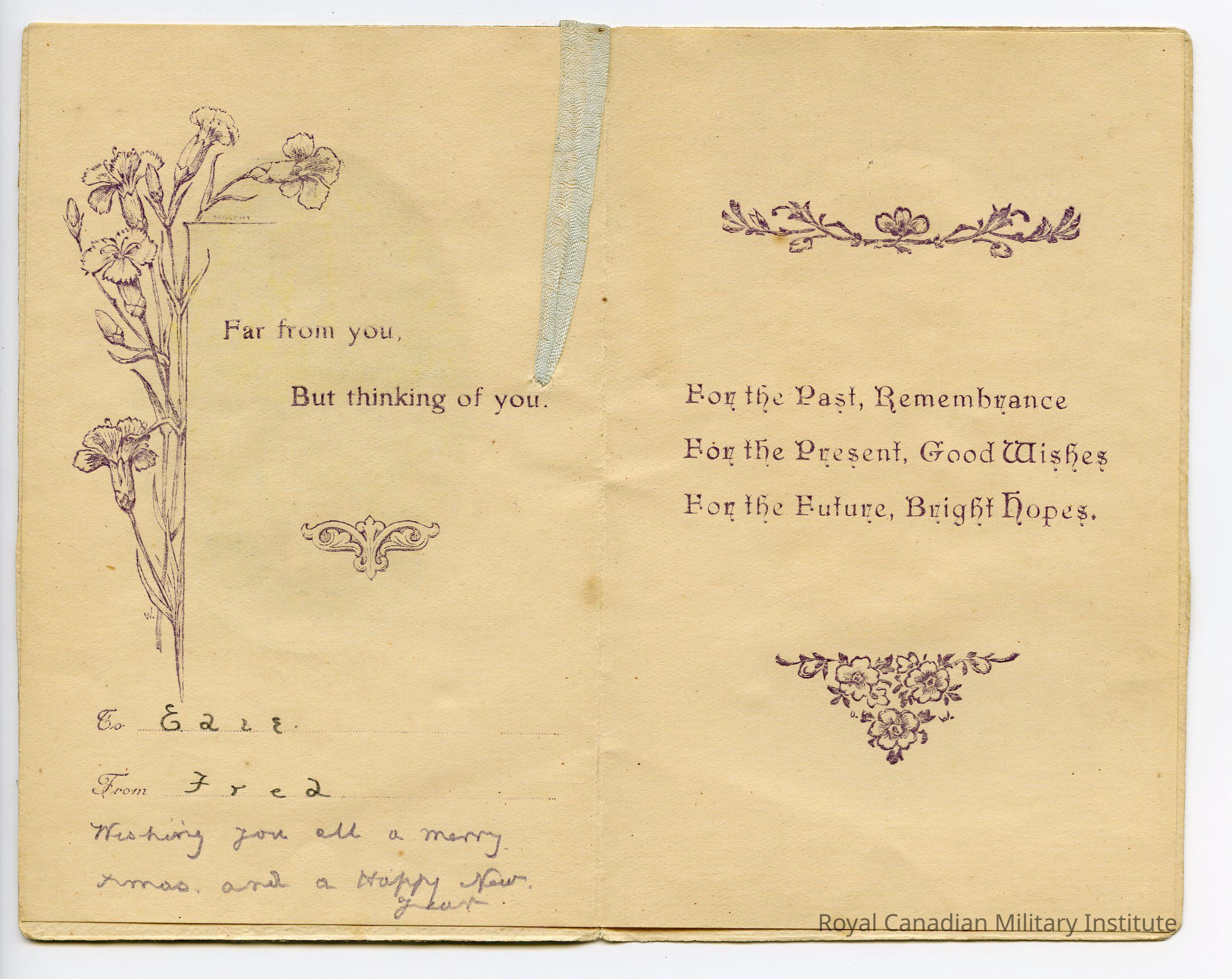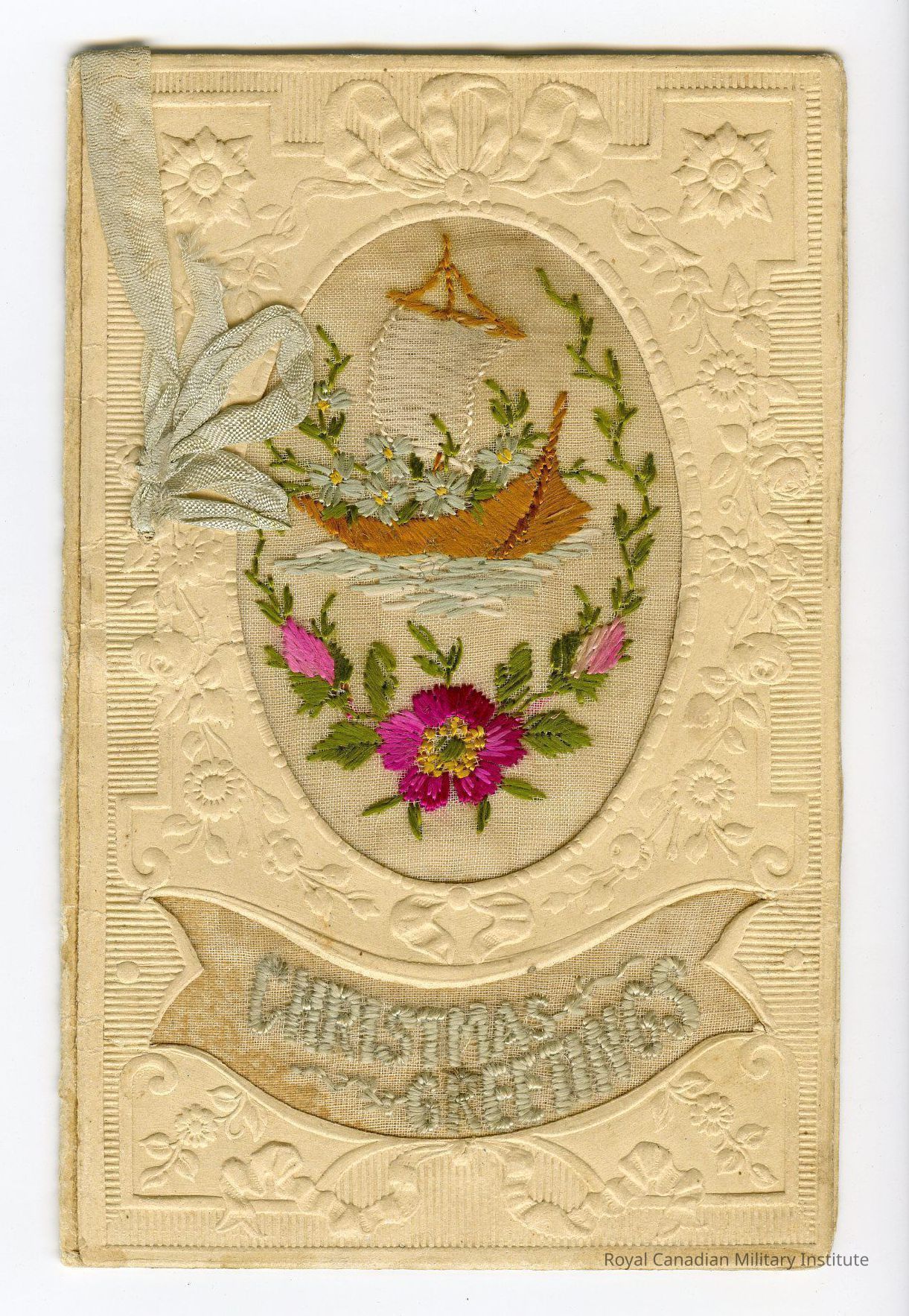 1915-1918 French civilian souvenir lace postcard "Christmas Greetings". Rectangular, cream white paper. Embossed flowers front cover with oval window cut-out and green/brown/white embroidered lace sailing ship circled by green/pink/yellow flowers. at bottom is scrolled blue lace cut-out title "Christmas Greetings" Inside is greeting: "Far From You But thinking of you" Written in pencil: "To Edie From Fred wishing you all a merry xmas and a Happy New Year"Dimensions