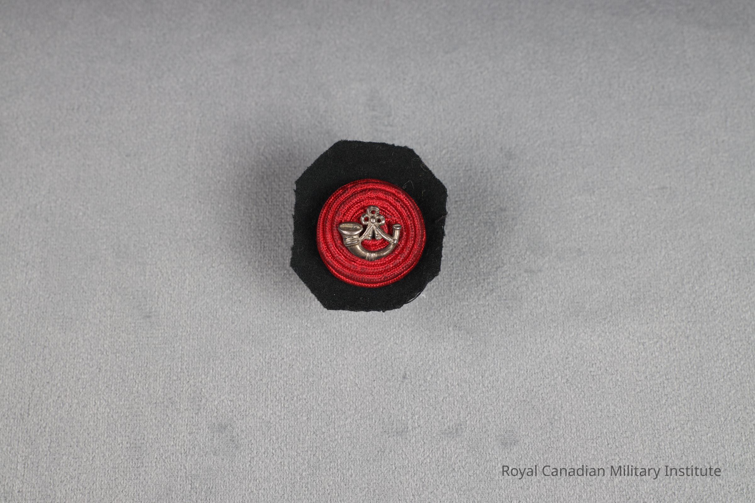 1939-1945 Regina Rifle Regiment busby badge. Circular, red cotton thread net ball with hole in centre for 1.7 x 1.7 cm. silver stringed hunting horn device (with screw post). Backing piece of 4.7 x 5 cm. black felt square.Made/Created