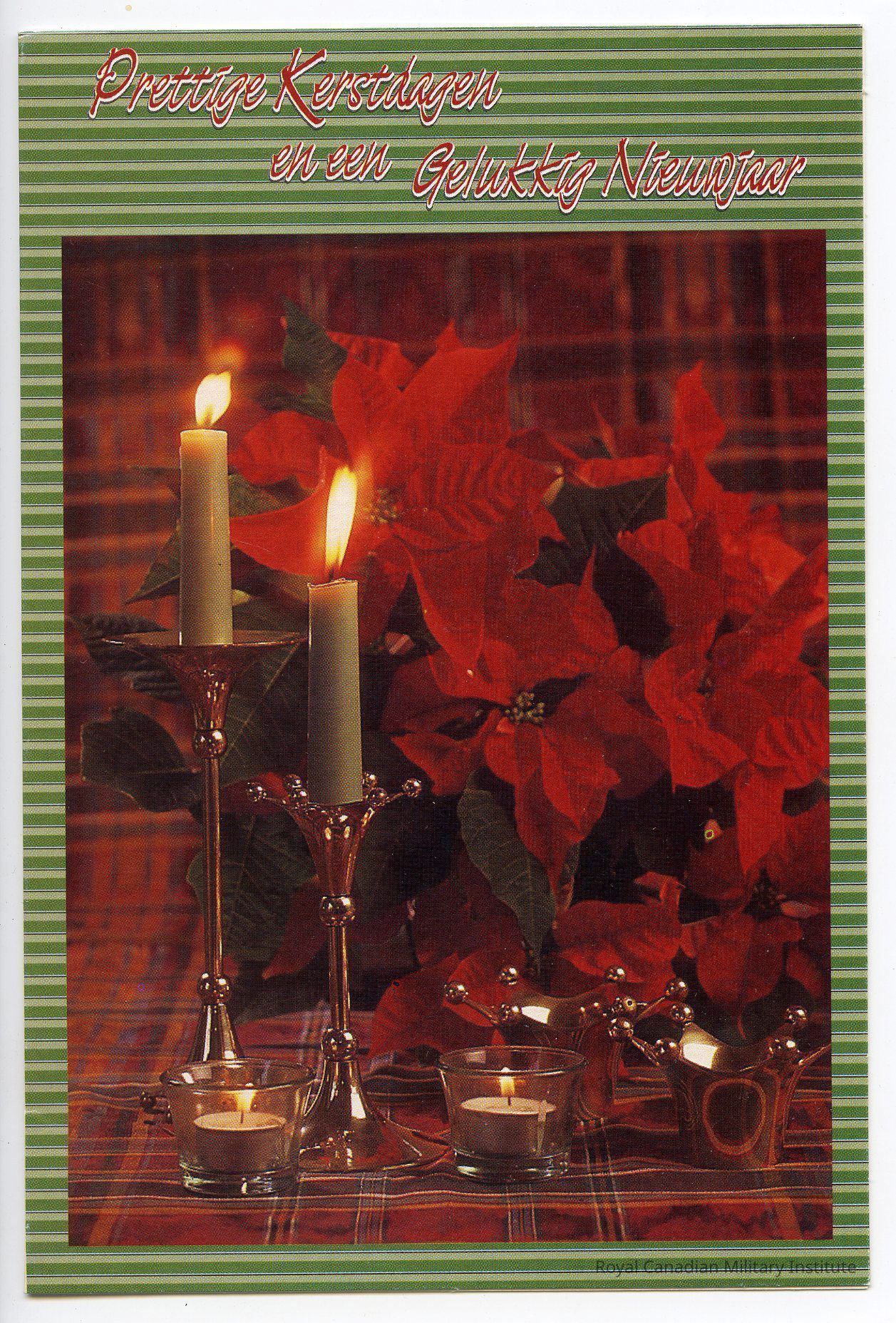 1995 Dutch civilian Christmas card. Rectangular, green/white striped edges with photograph of red tablecloth, four Christmas candles, two red Christmas lilies (?). Title in red white: "Prettige Kerstagen en een Gelukkig NiewoJaar"Made/Created