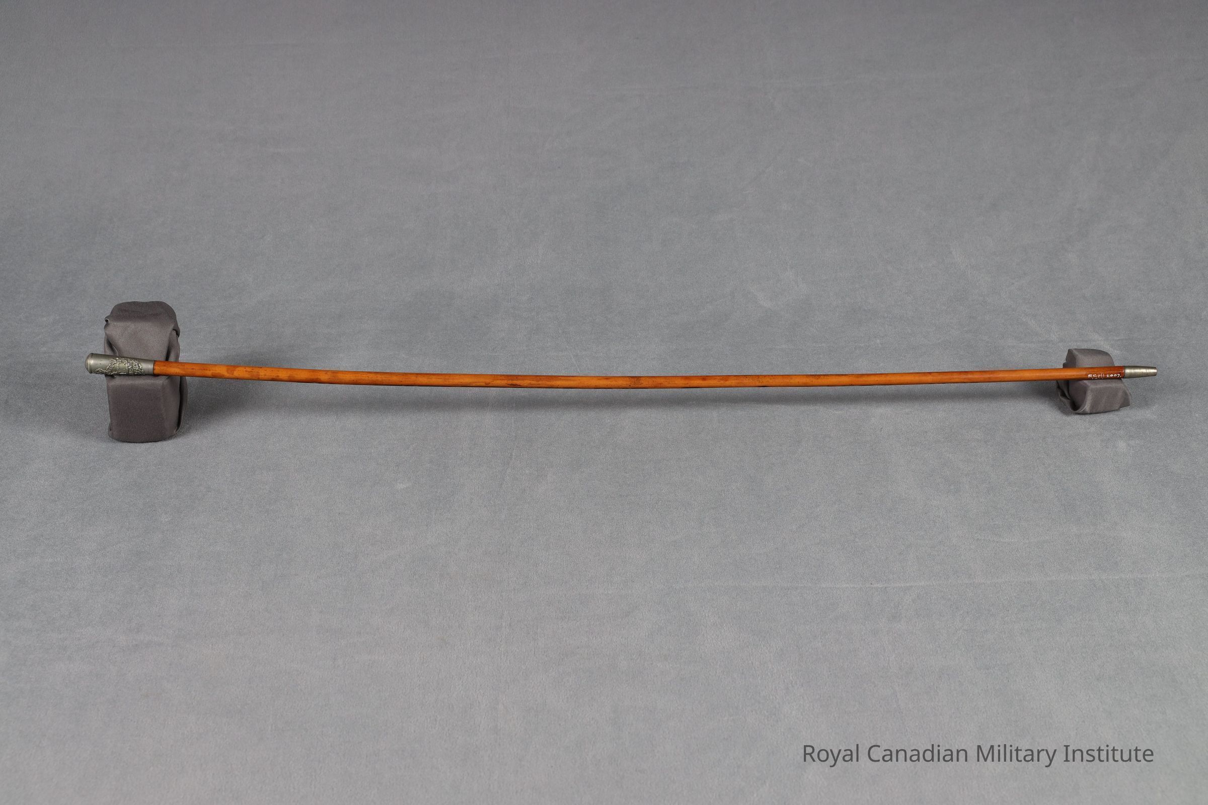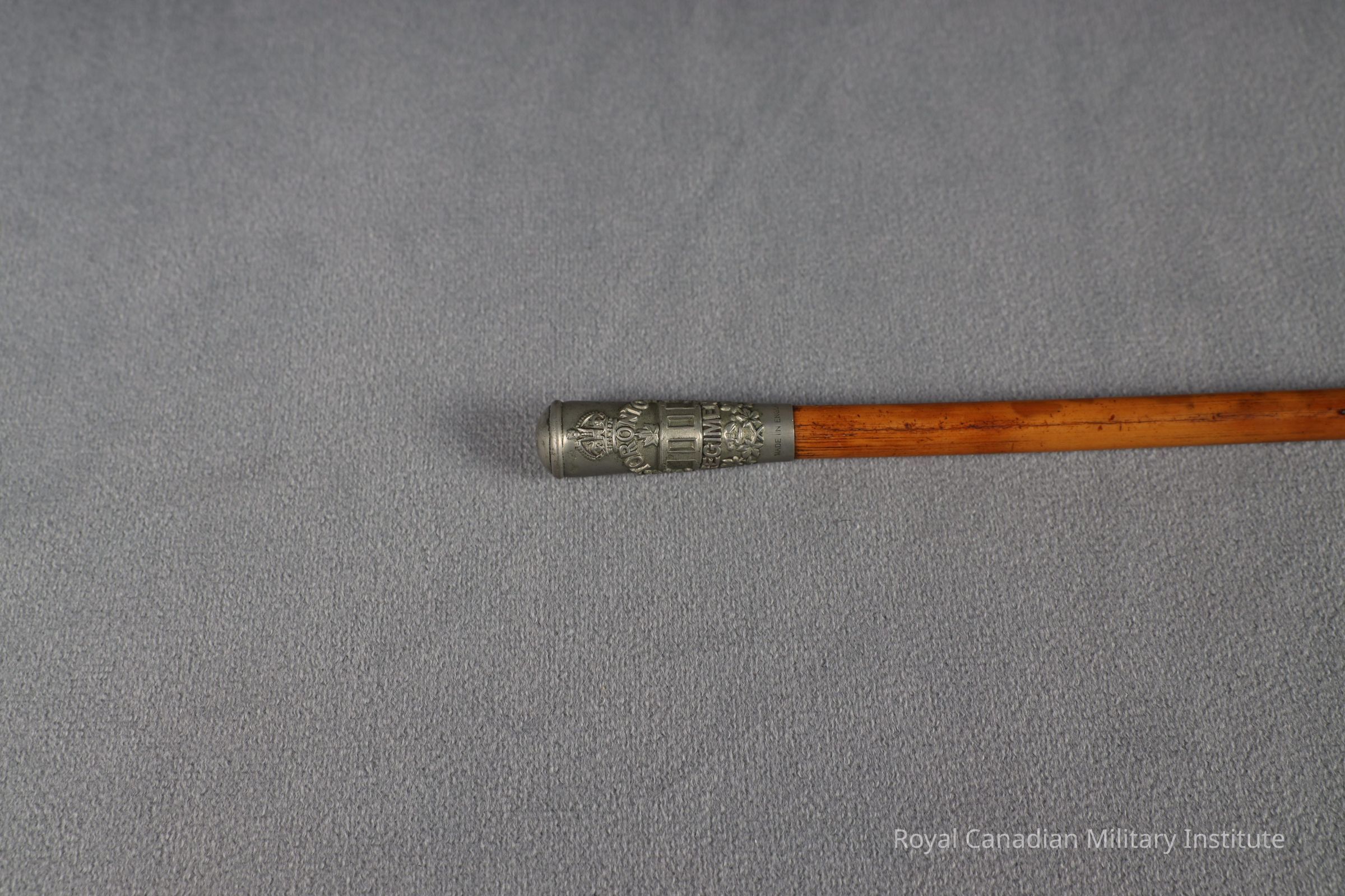 1914-1920 3rd (Toronto, Ontario) Canadian Infantry Battalion private soldier's stick. Cylindrical light brown varnished hardwood. Top is white metal or sterling silver ferrule with stamped Battalion badge, 4 cm. long. End is white metal tip 2.2 cm. long.Made/Created