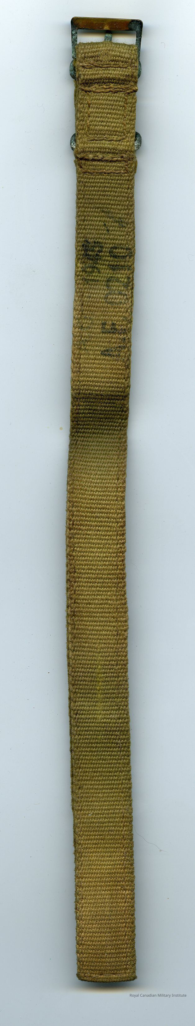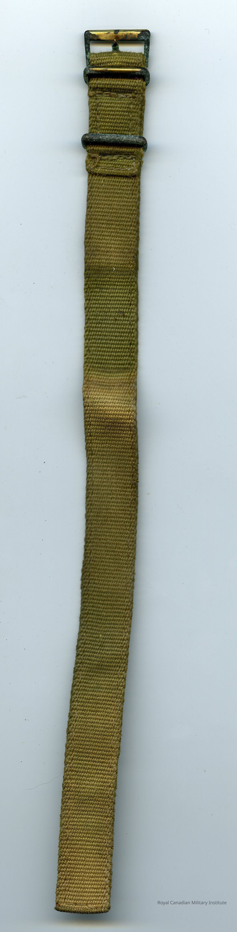 1945 British Army Officer's wristwatch strap. Rectangular khaki green cotton web strap. One-piece stitched construction, with buckle end looped back to hold buckle and two brass loops (loops for opposite end of strap to loop through). Brass buckle at other end.Made/Created