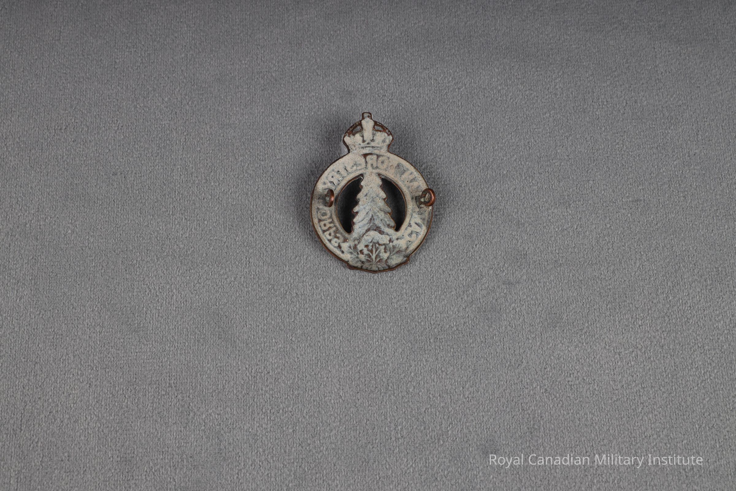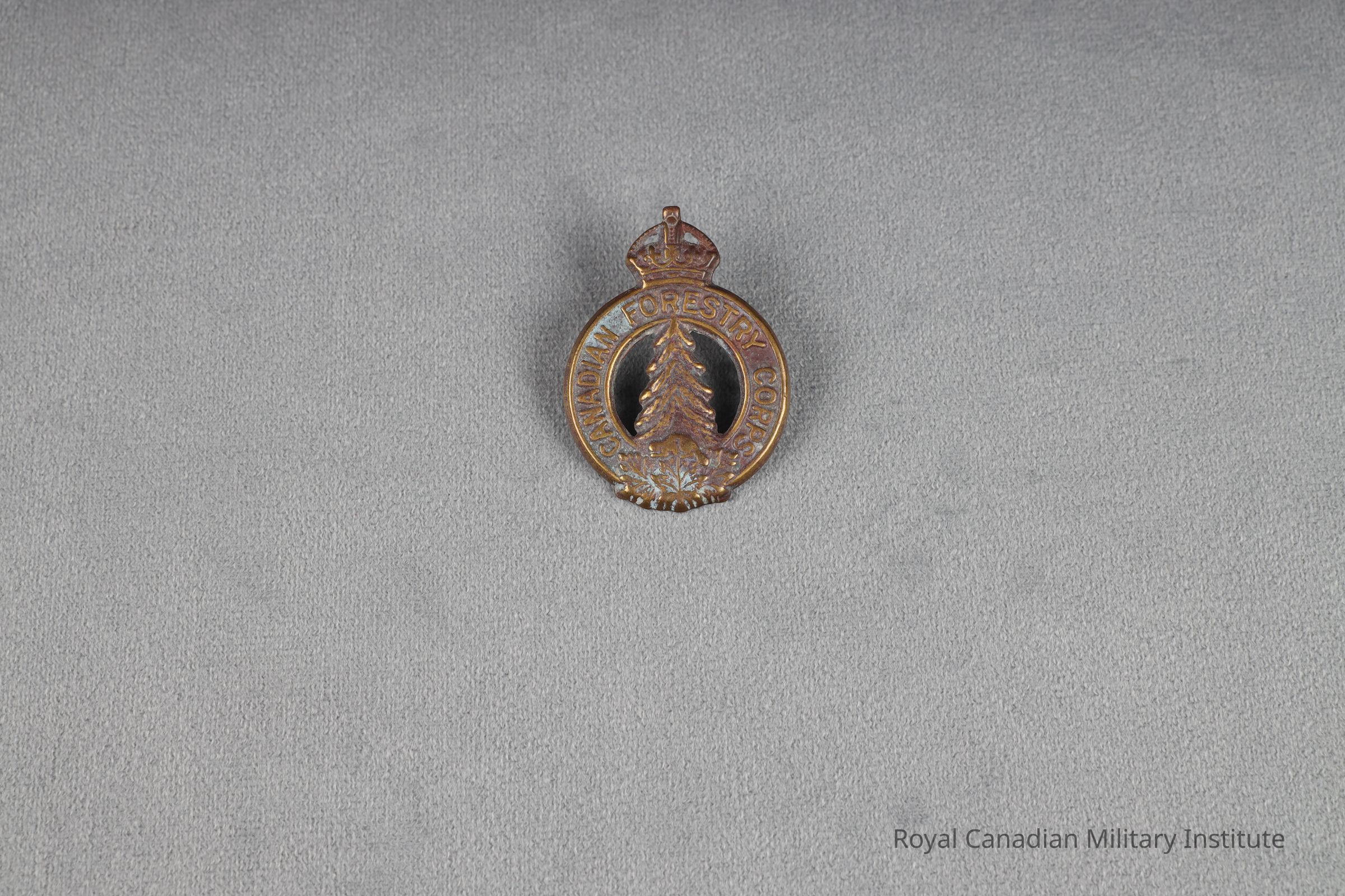 1940-1945 Canadian Forestry Corps cap badge. Oval, brass. King's crown atop circular title "Canadian Forestry Corps" At bottom of title is three maple leaves and beaver. Centre of cap badge is voided, with tree in centre. Rear has two copper lugs.Made/Created