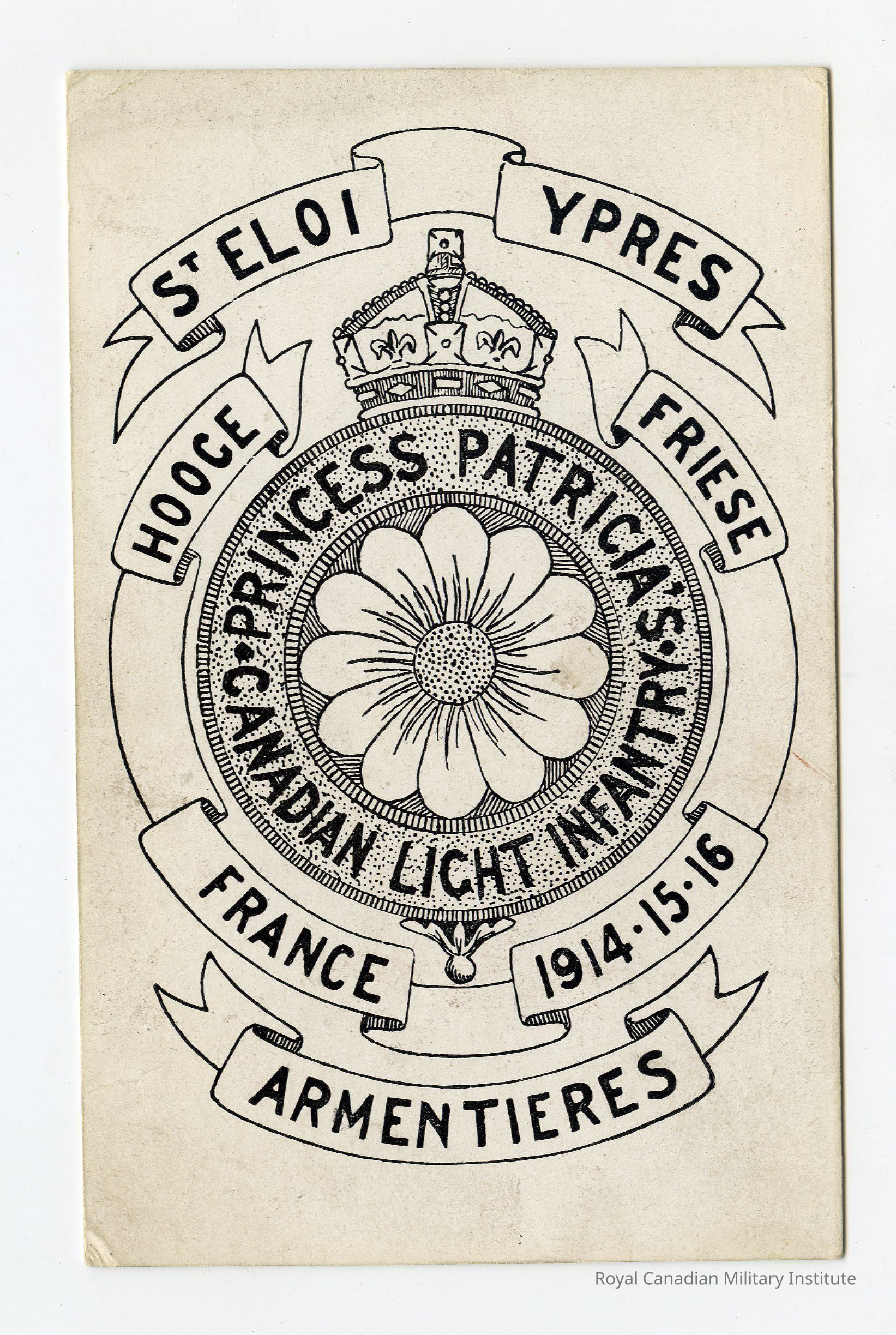 A printed Princess Patricia's Canadian Light Infantry (PPCLI) postcard of "The Marguerite" badge surrounded by the units battle honours. Above the badge reads "ST ELOI / YPRES". The badge is a crown surmounting a circle which reads "PRINCESS PATRICIA'S CANADIAN LIGHT INFANTRY". In the centre of the circle, a 12-petal Marguerite Daisy. On the ribbon banner around, "HOOCE FRIESE / FRANCE 1915 • 15 • 16". At the base, "ARMENTIERES". Printed onto postcard stock.