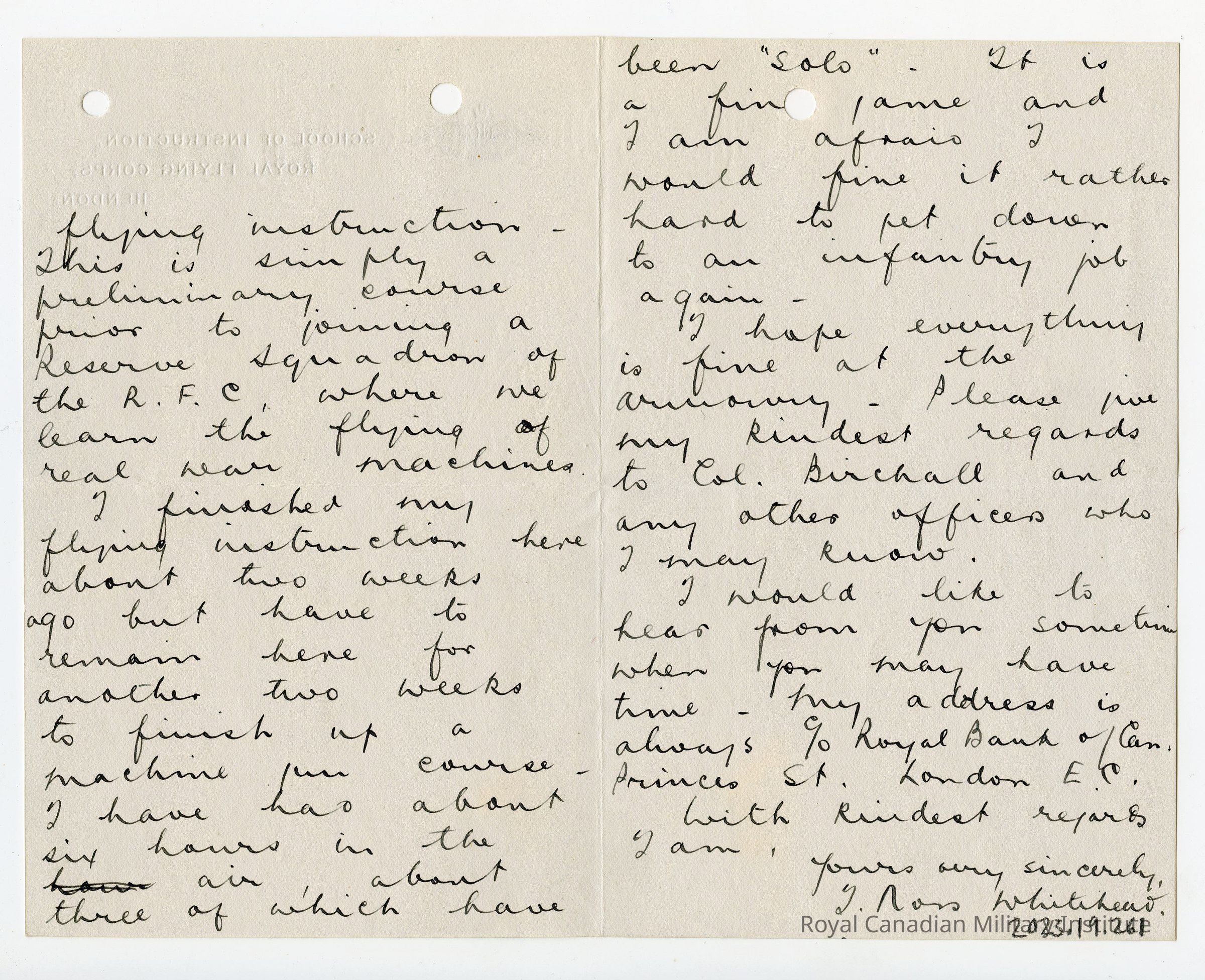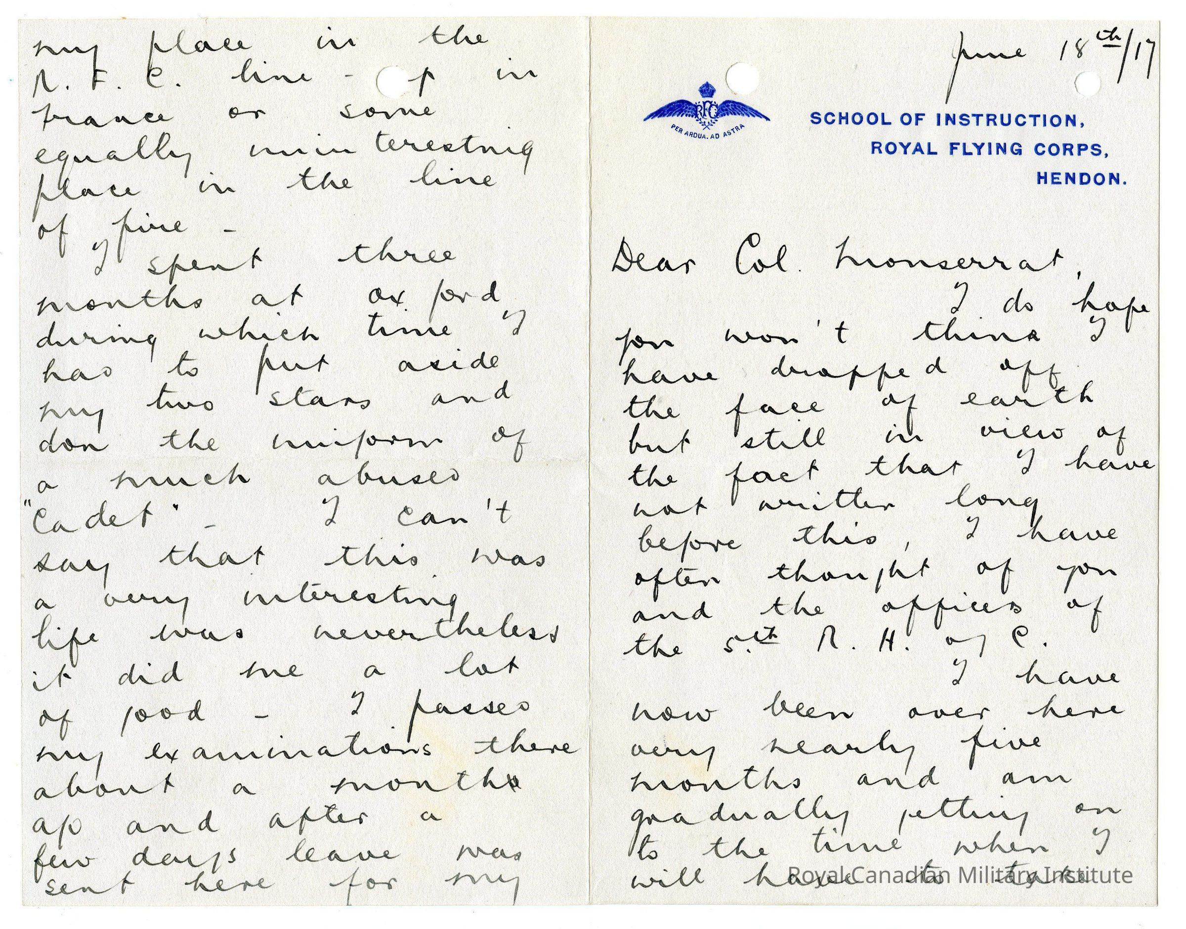 Letter School of Instruction Royal Flying Corps, Hendon June 18th, 1917